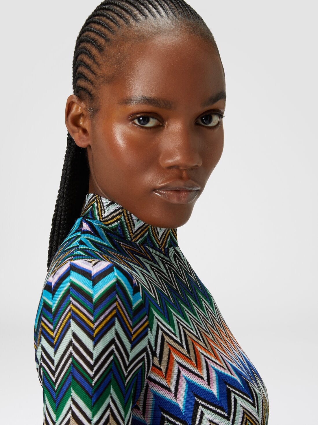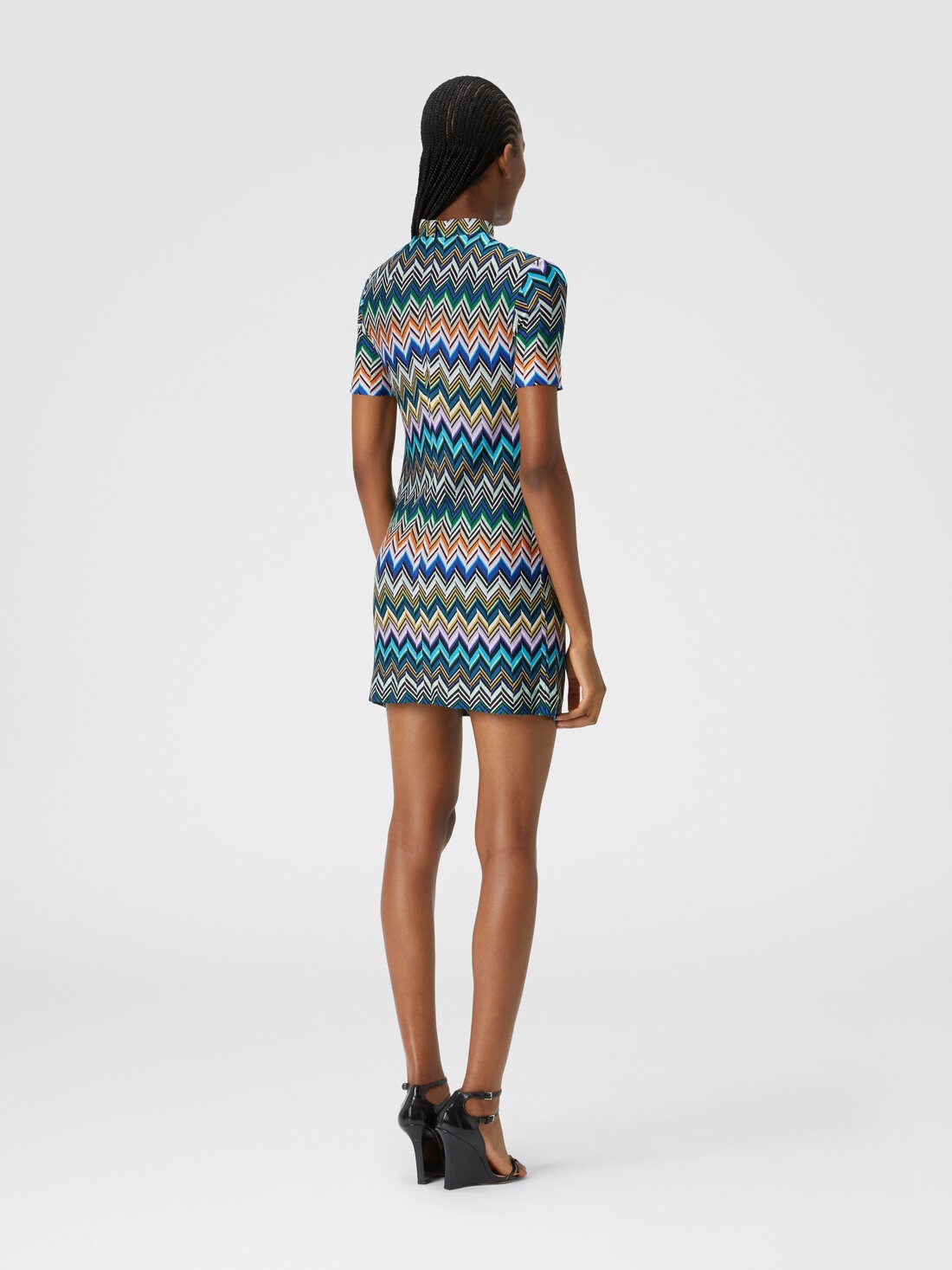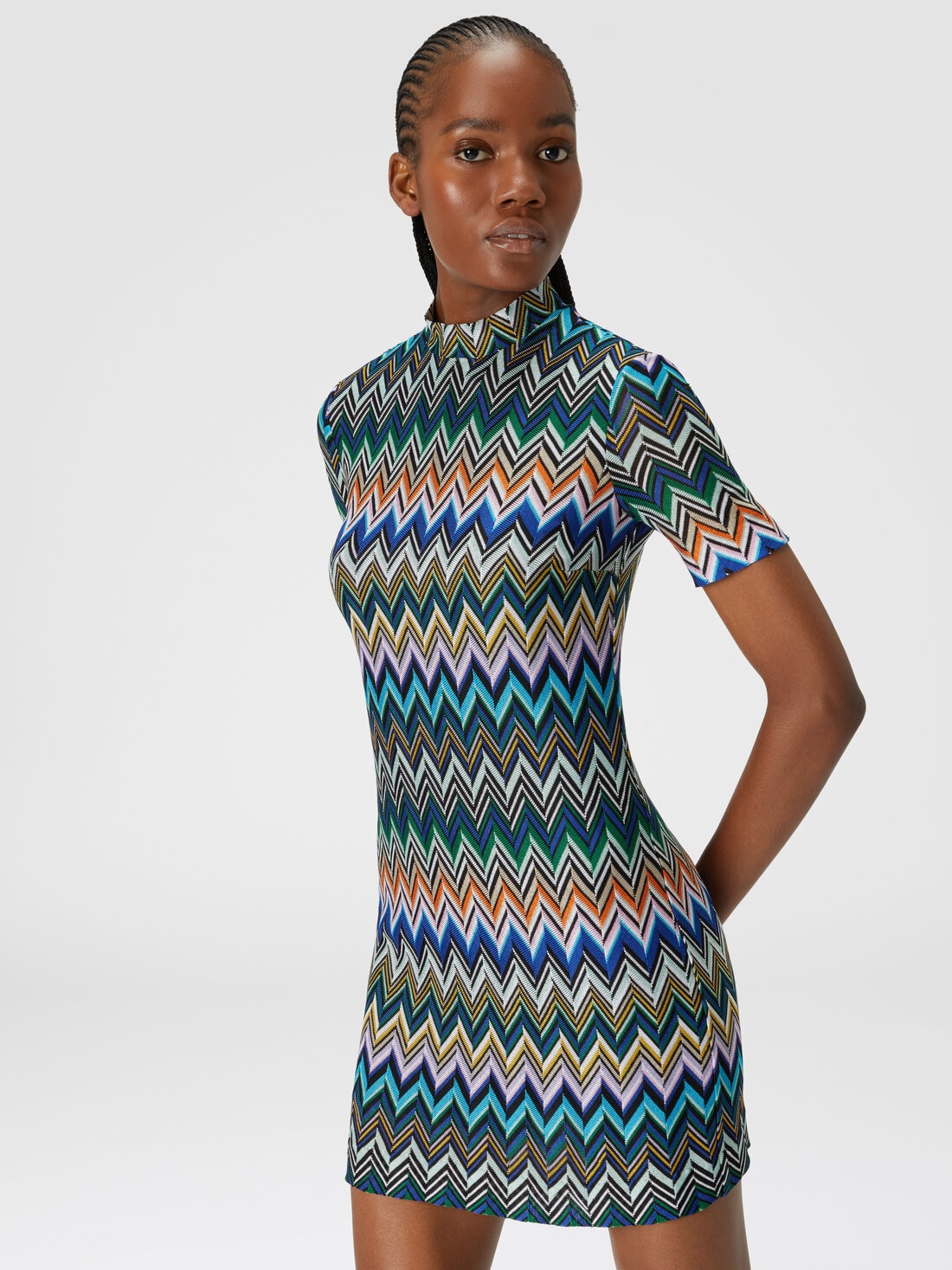The clean design only accentuates the focus on the raschel workmanship with an offset zigzag pattern that characterizes the mini-dress with mock neck and short sleeves. A garment for the daily look to which the Missoni touch gives an extra edge.