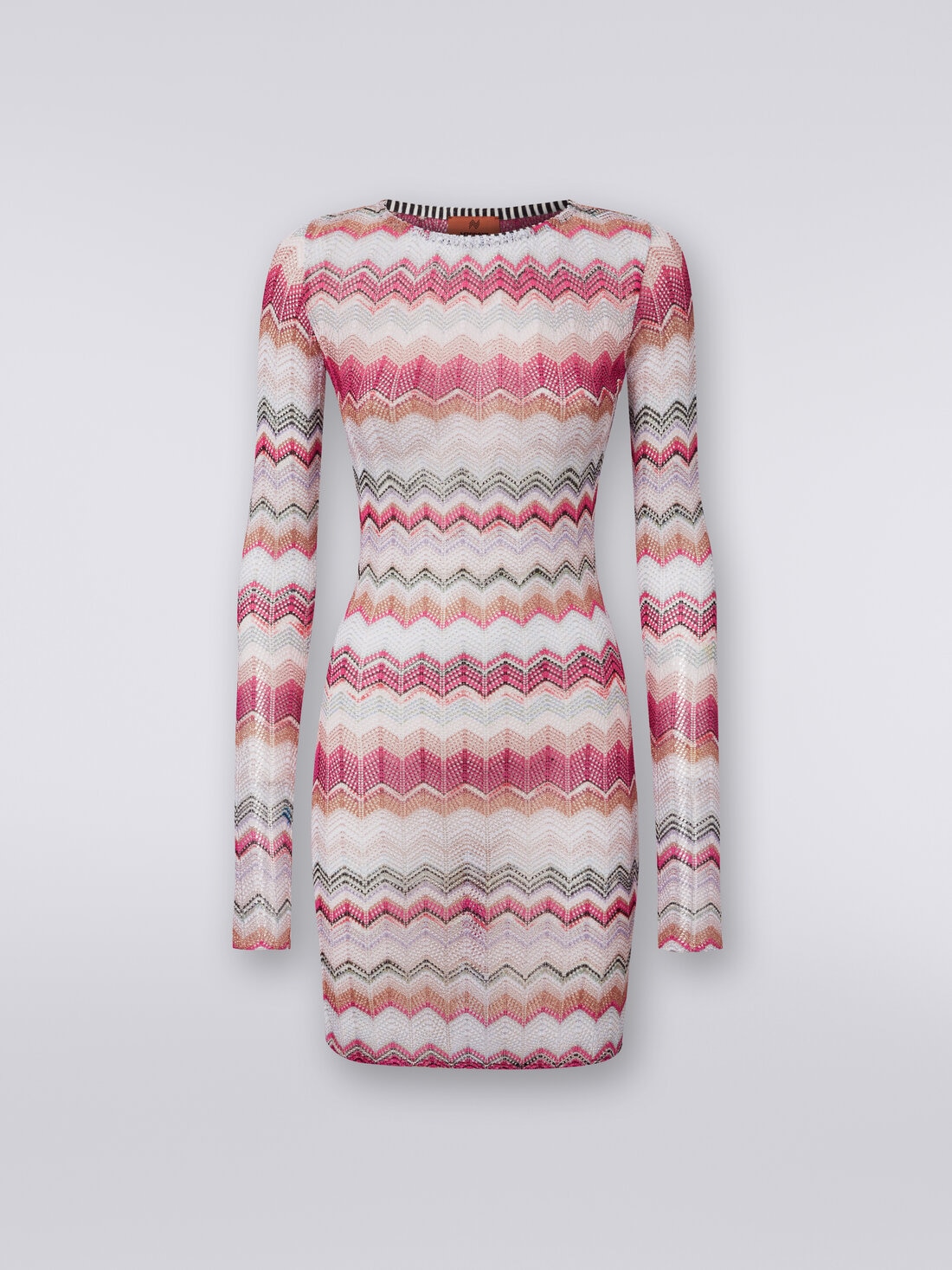 Crochet effect knit for the women’s cover up dress with zigzags illuminated by lurex thread. Long sleeves and reduced proportions characterise this crew-neck piece, perfect for adding a refined touch to a beach look.