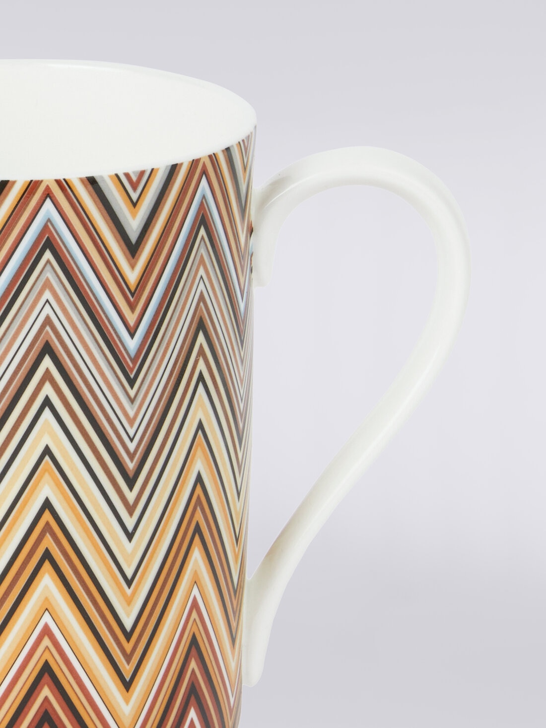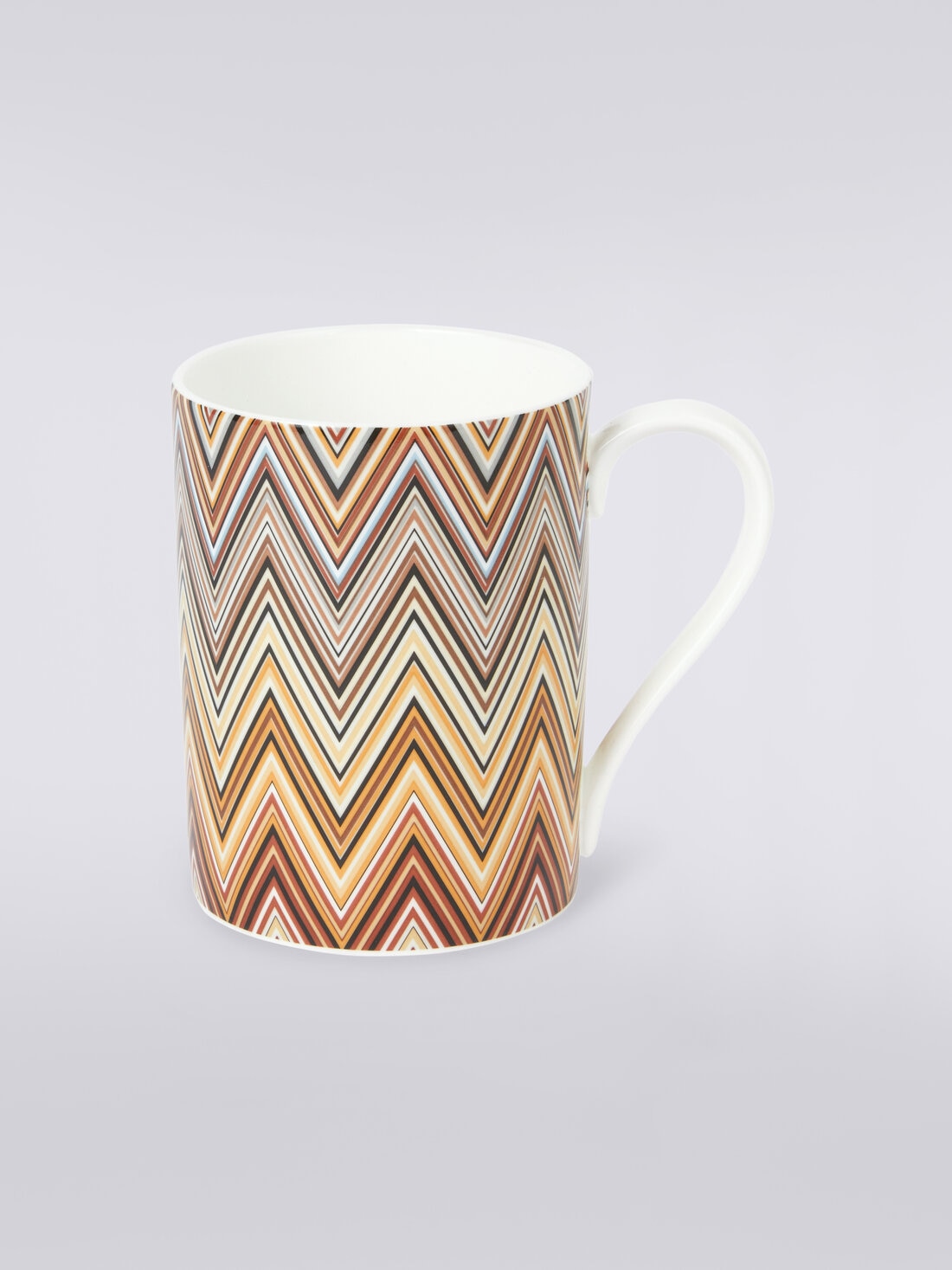This mug with handle is presented in an elegant box with the Missoni logo. The fine porcelain table accessory is personalised by the Jarris pattern, a refined variation of the brand's iconic zigzag pattern.