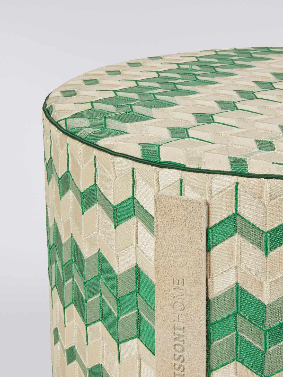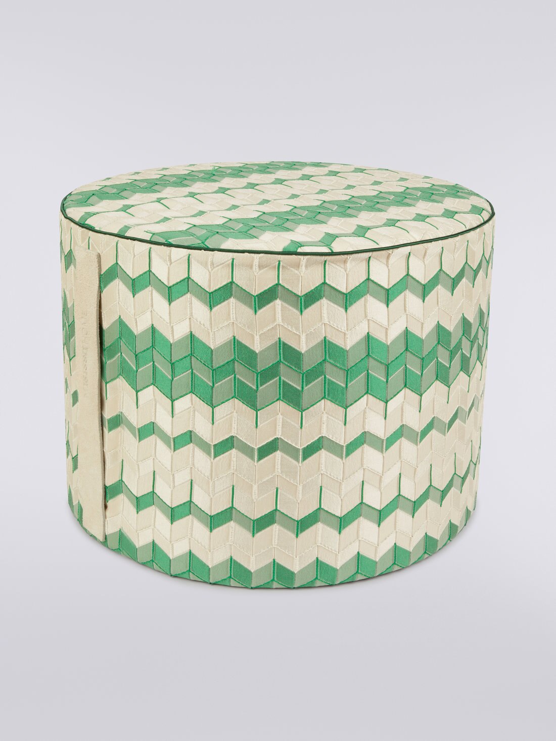 With a dynamic interplay of shadows and depth, Tread, a 40x30 cm cylindrical pouffe, features a sophisticated, garment-dyed jacquard fabric that lends a three-dimensional effect to its chevron pattern. The split handle with imprinted logo adds a touch of timeless style to this versatile furnishing accessory.