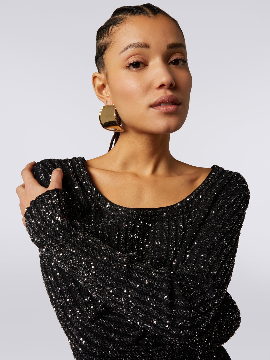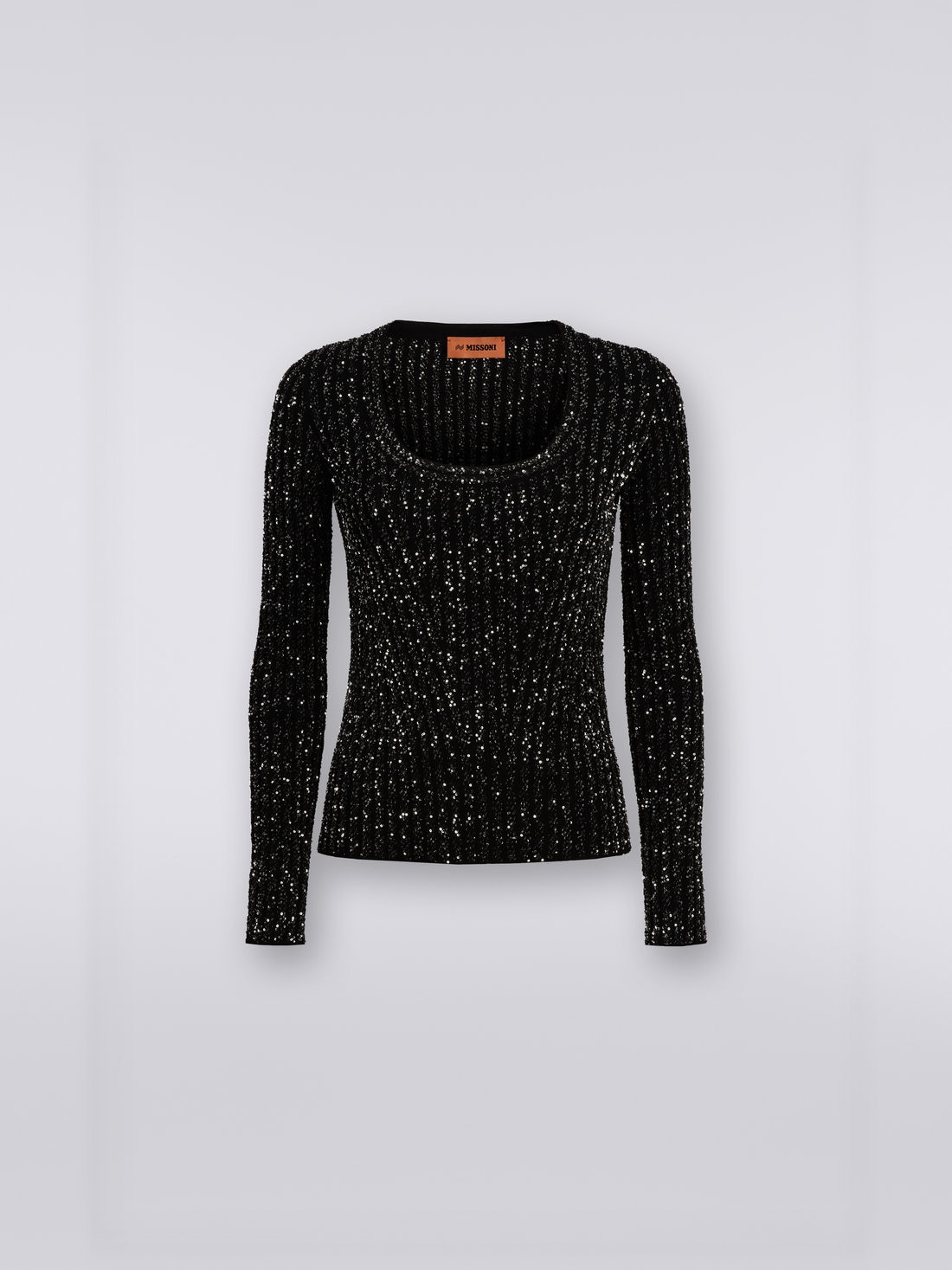 What makes the Missoni women’s pullover immediately recognisable are the iridescent sequins that entirely cover the ribbed knit. Made of a stretch viscose blend, the piece with a broad, round neckline gracefully emphasises the silhouette.