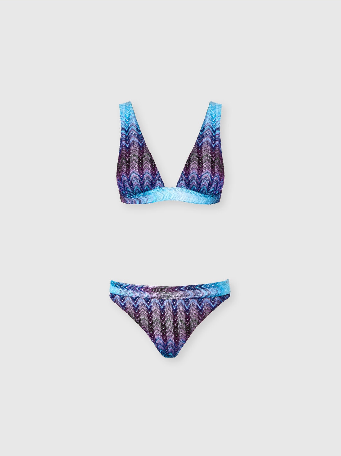 This bralette bikini features a supportive elastic that combines comfort and style. Made from Raschel with the iconic zigzag pattern, enriched with viscose and lamé, it’s an explosion of elegance and practicality for glamorous beach moments.