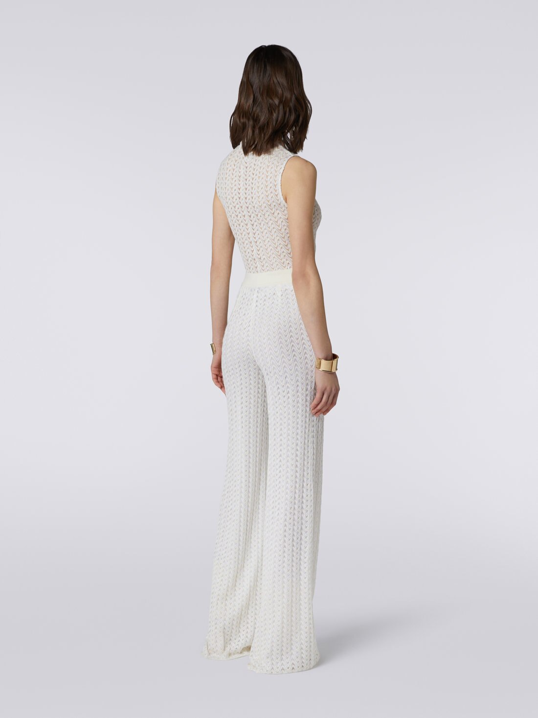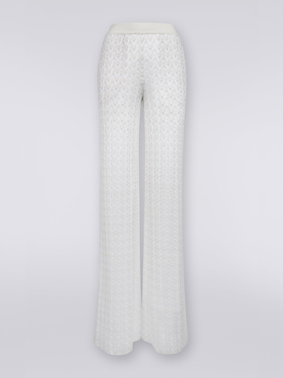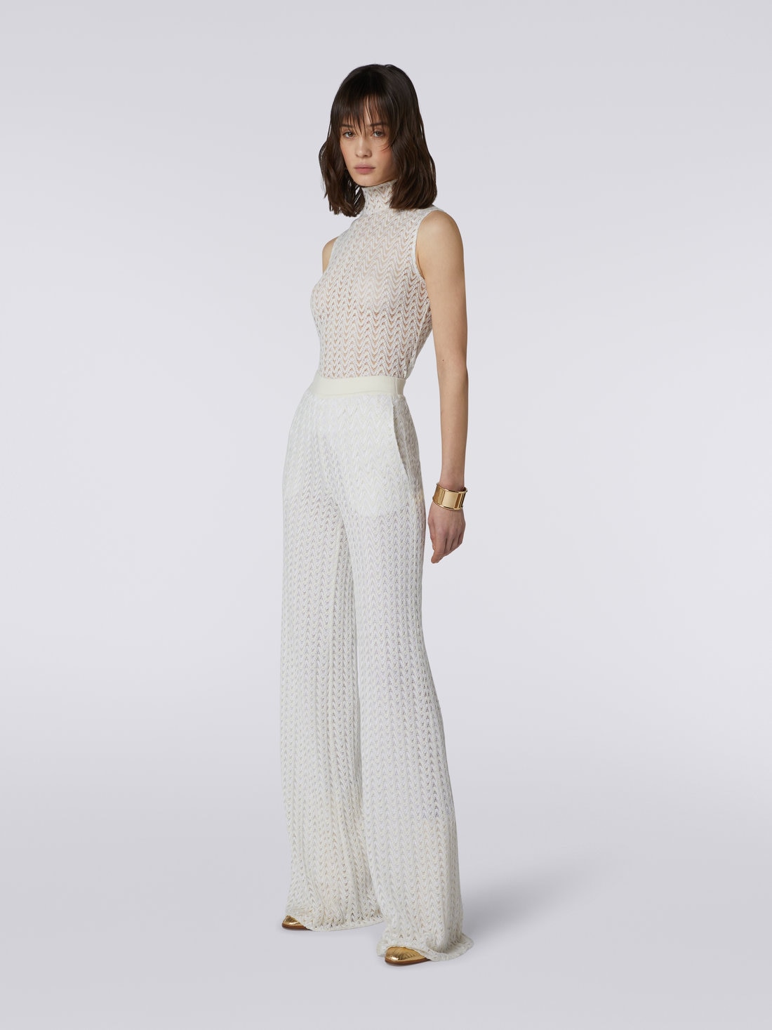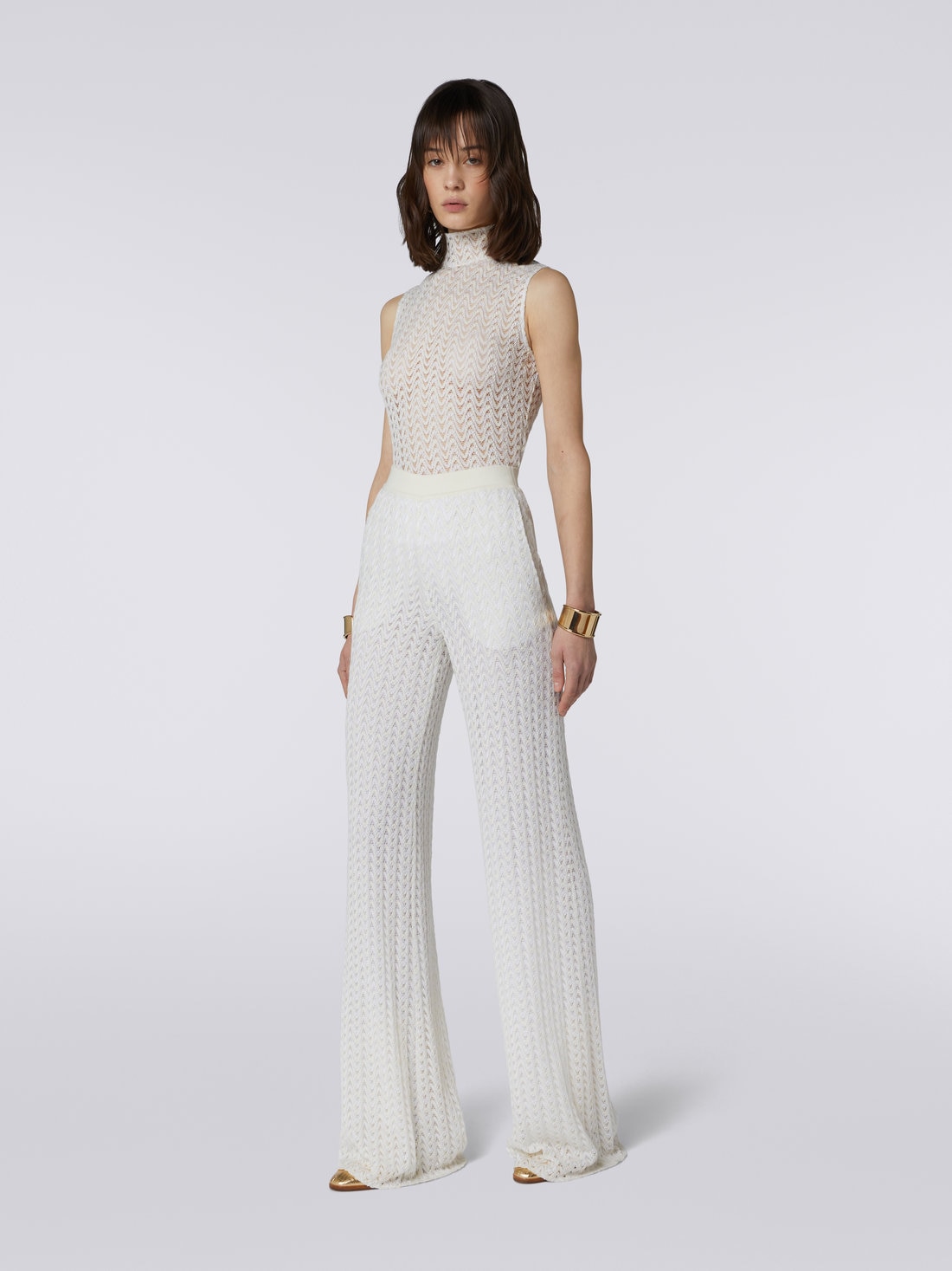 Lace, in the Missoni house, is a very special knitting technique, taking on a multidimensional and highly sophisticated character. It is the absolute star, in a tone-on-tone version, of the women’s palazzo trousers, made of viscose and wool.
