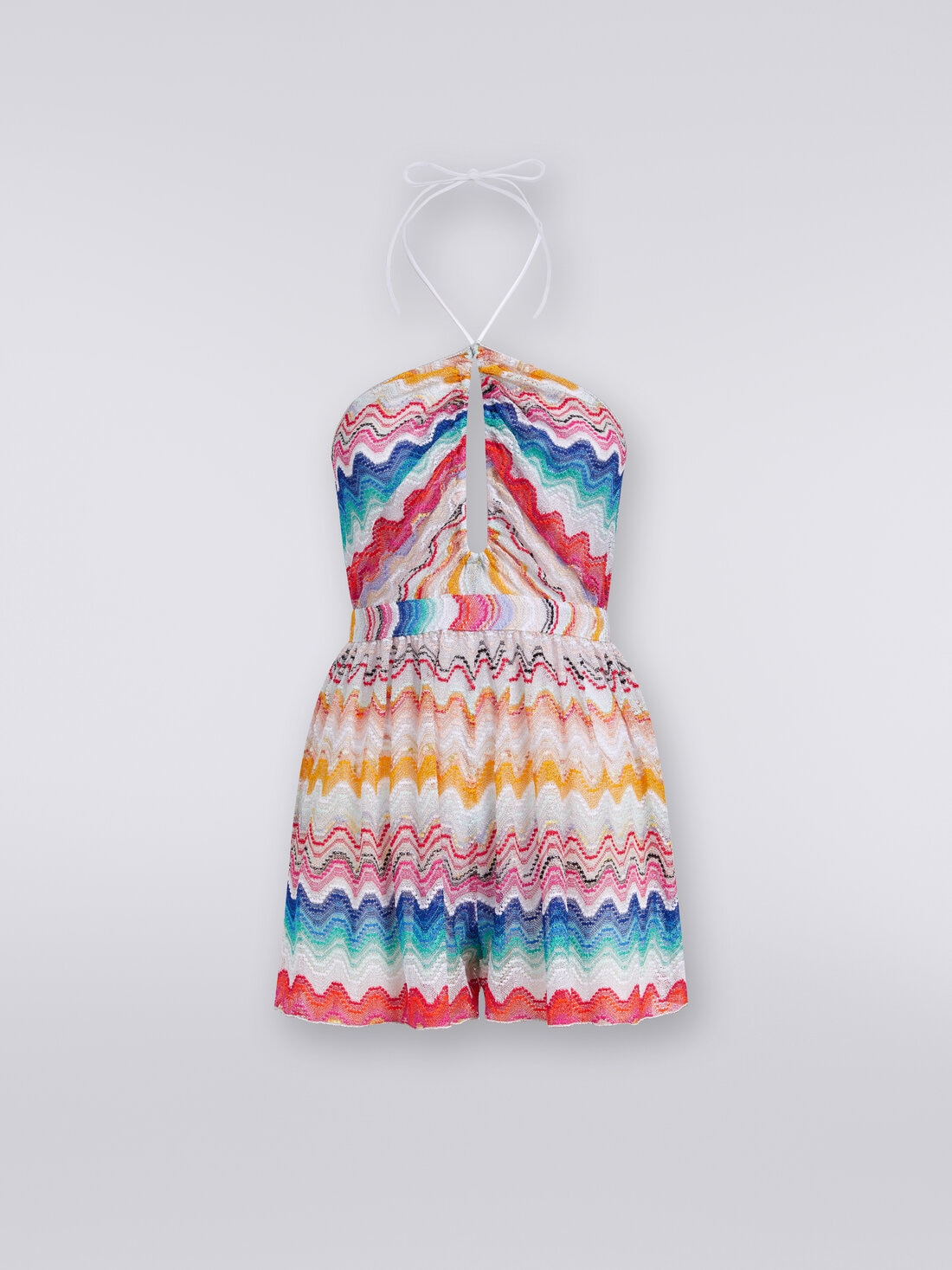 Illuminated by the reflections of lurex, Missoni’s women’s short viscose blend cover up jumpsuit offers an eclectic essay on the brand’s DNA: wave knit meets zigzag pattern in this piece with flared shorts and a plunging V neckline that leaves the back bare.