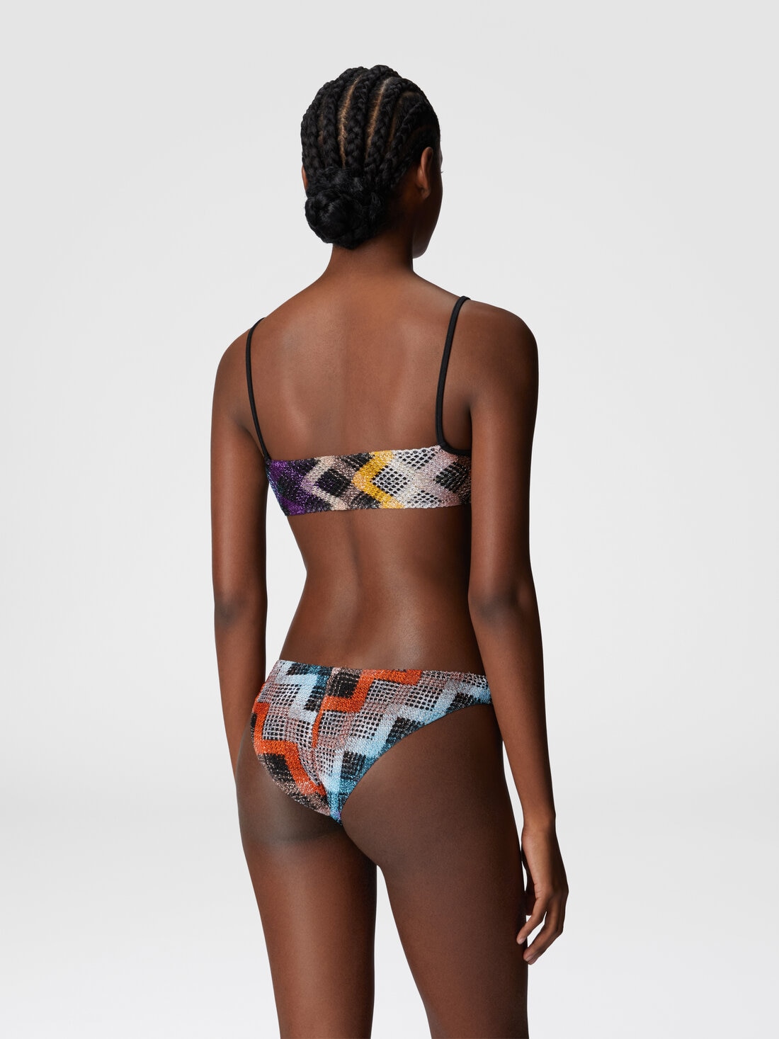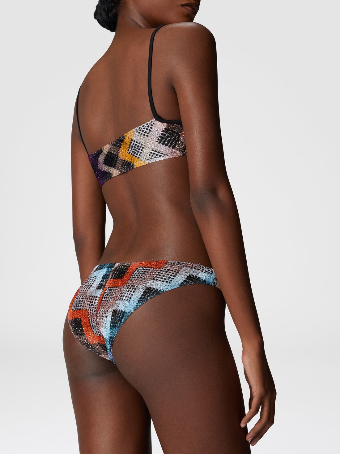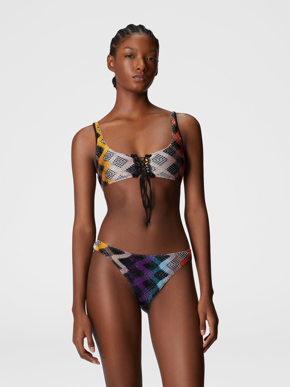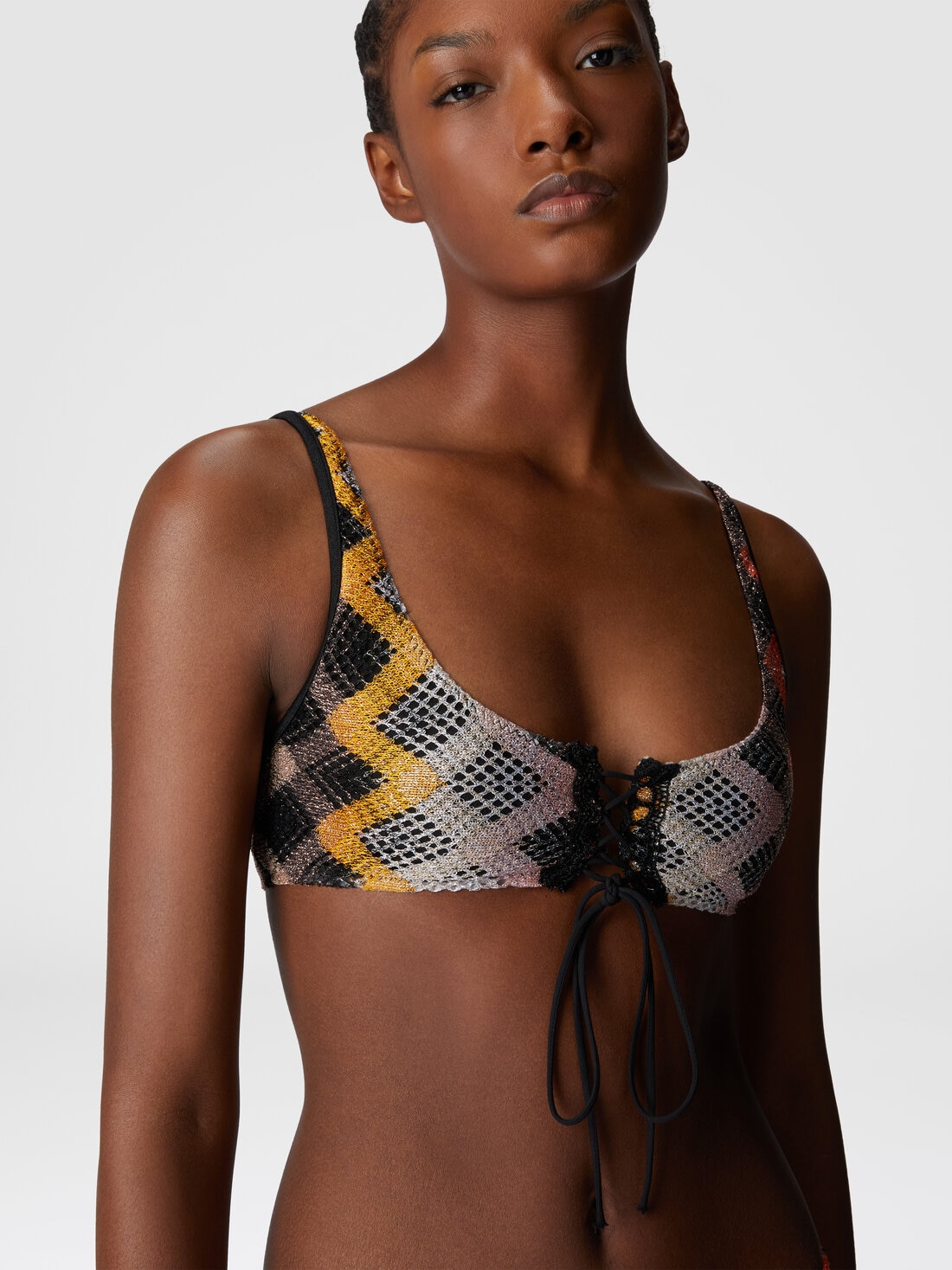 The brasserie bikini combines comfort and sophistication with front ties on the top, mesh details, and Raschel craftsmanship enriched by the sparkle of lamé. A piece that demands attention.