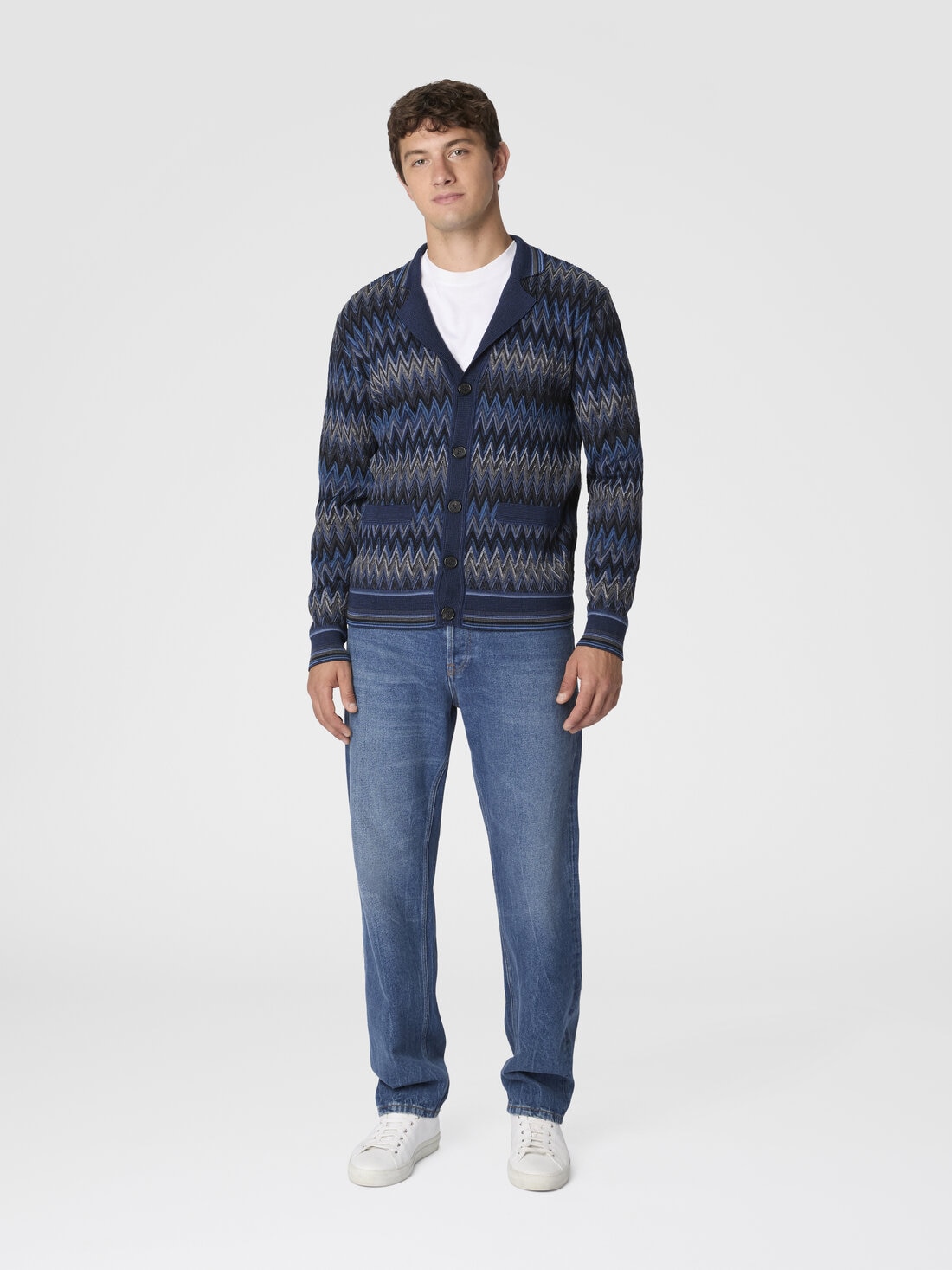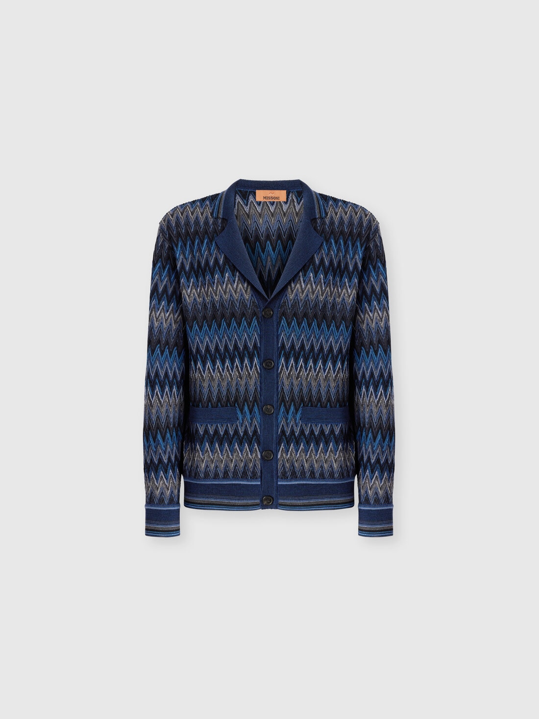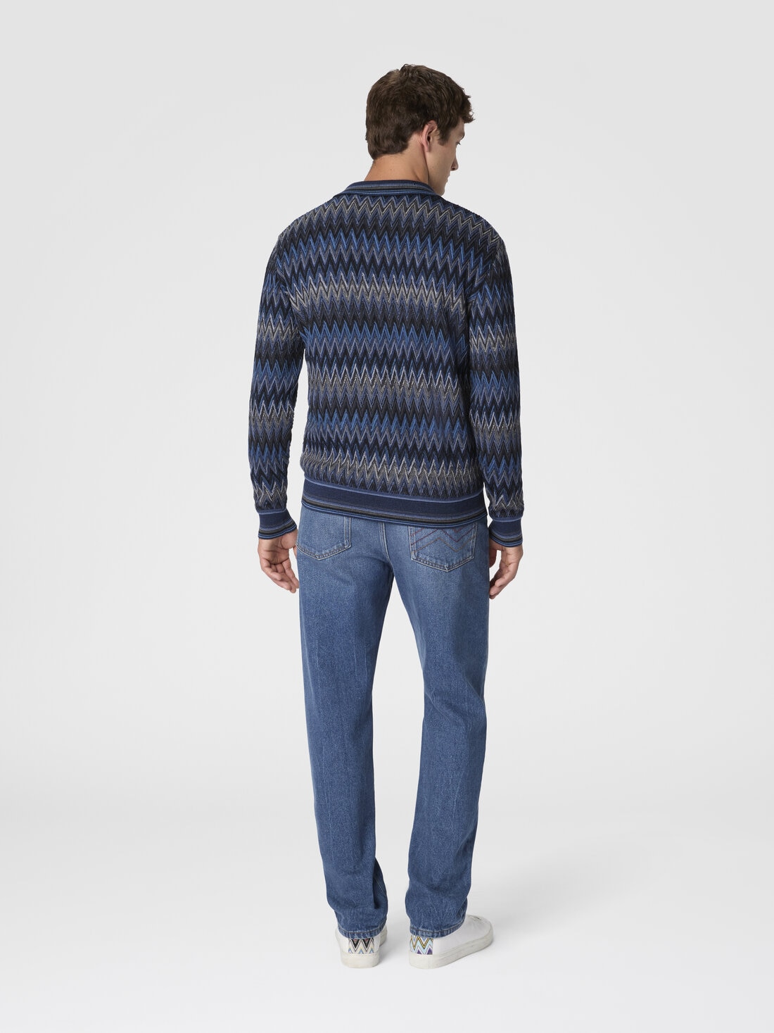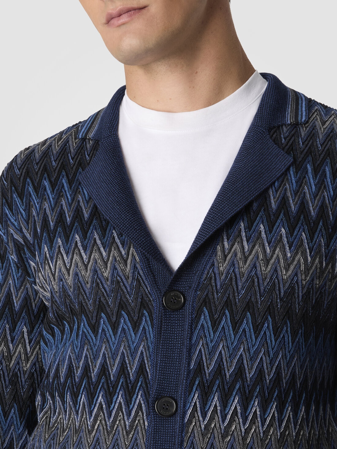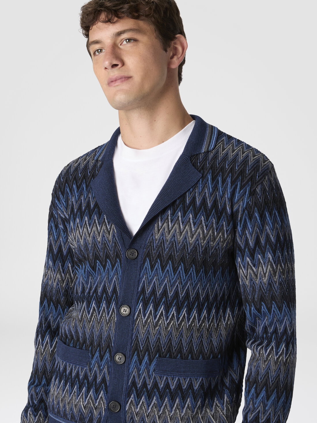 Cozy and full of character, this men’s cardigan in 100% wool is crafted with sophisticated raschel workmanship that brings to life an iconic raised zigzag motif, creating a 3D, textured, and dynamic effect. Contrasting striped trims complete the design with a bold graphic touch, blending artisanal tradition and contemporary style.