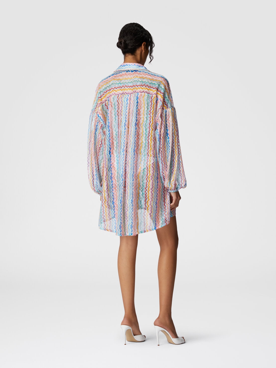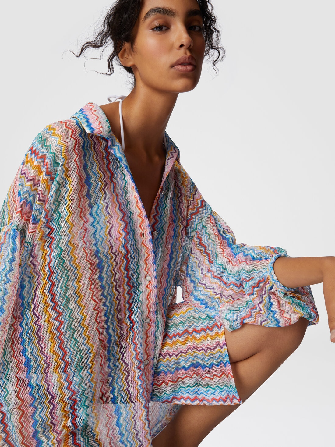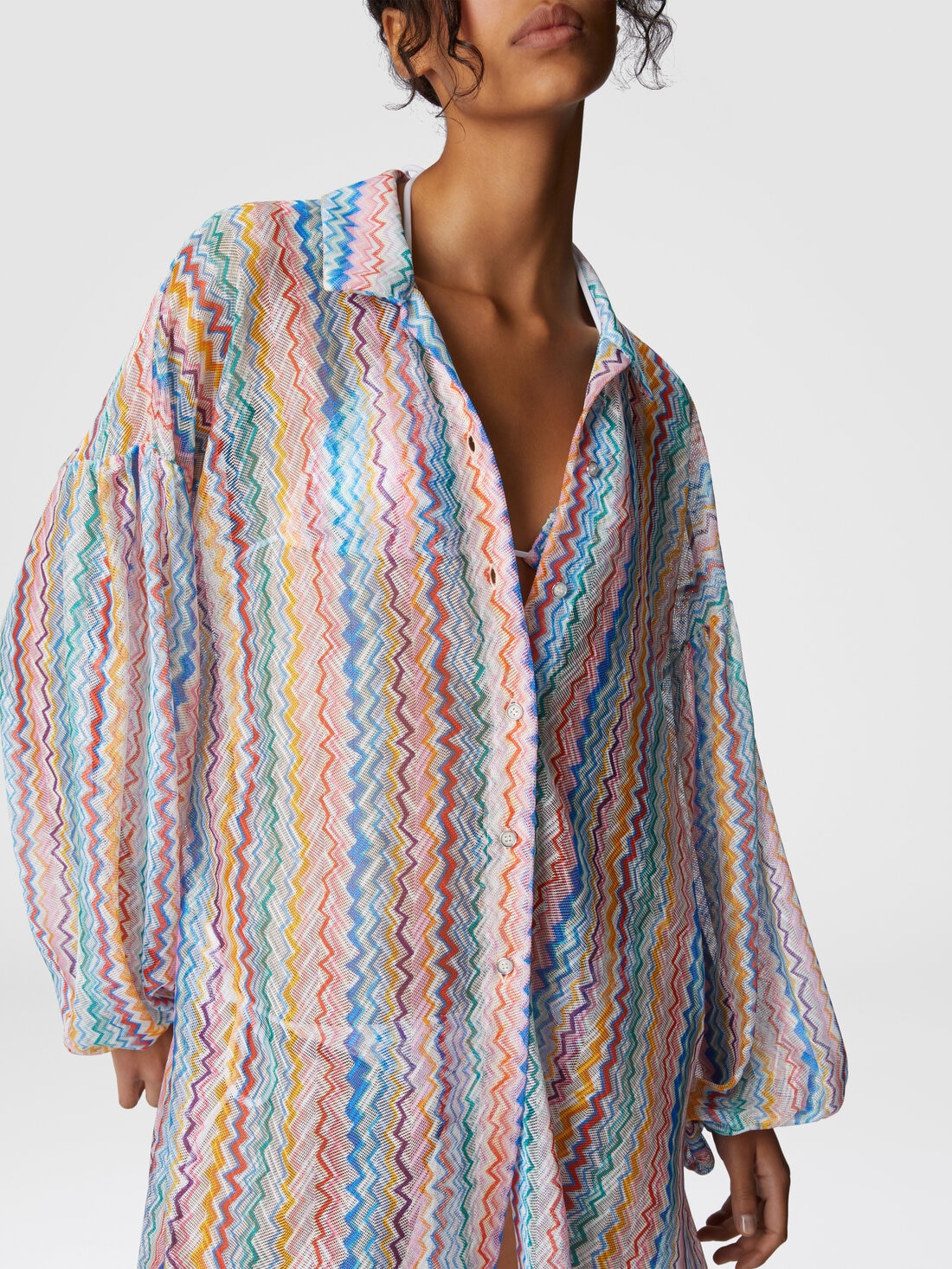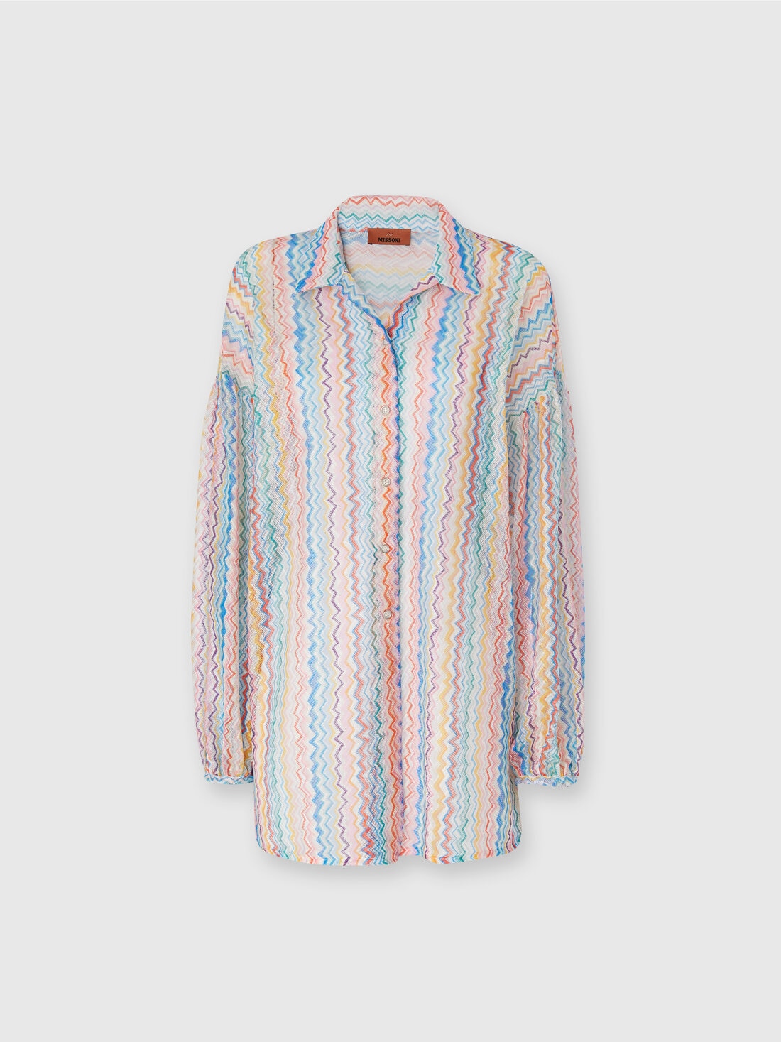 An elegant oversized shirt made from printed Raschel fabric with Missoni's iconic zigzag pattern. Slightly puffed sleeves and a slightly sheer effect give the piece a modern, sophisticated character, perfect for layering or wearing solo.
