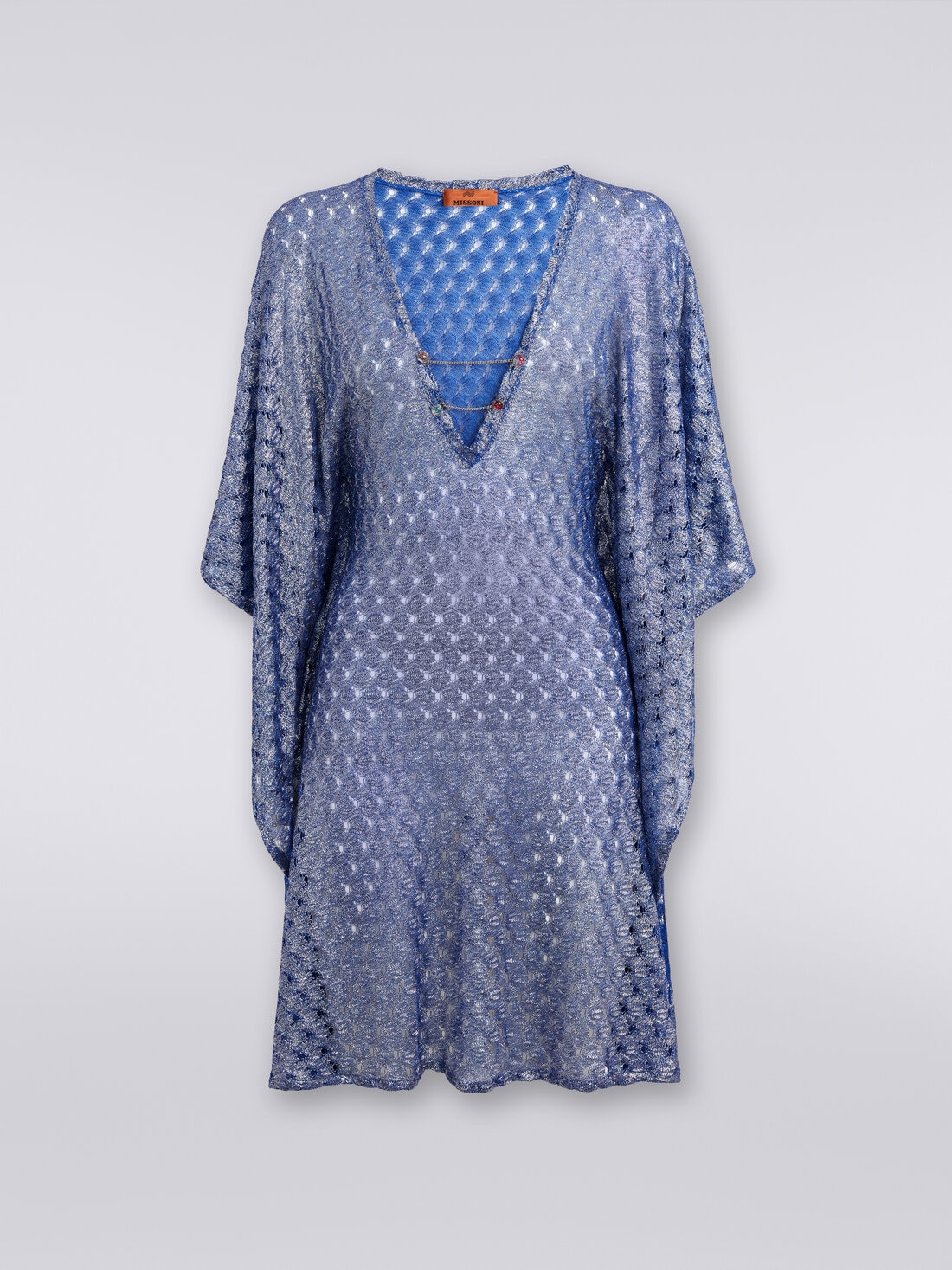Embellished with a V neckline, the flaps of which are held together by a chain appliqué with gems, the short women’s kaftan cover up is a perfect garment for the summer look even off the beach. This is due to the viscose knit with a lace-effect technique, lit up by the glimmer of lamé.