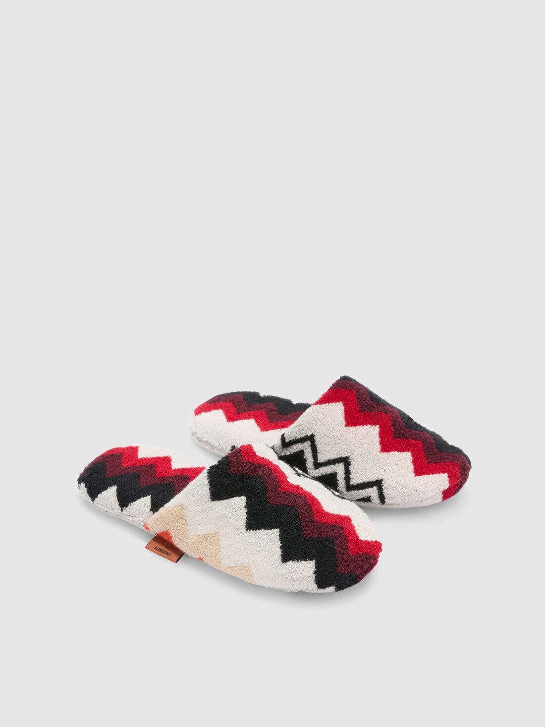 The Missoni slippers, crafted from soft cotton, combine comfort and sophistication in an iconic design. The unmistakable zigzag pattern adds a touch of lively elegance, perfect for moments of relaxation. Finished with a visible logo label, these slippers are the ideal accessory to envelop your feet in distinctive and cozy style.