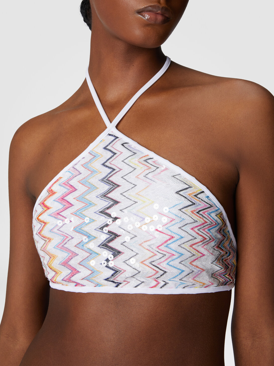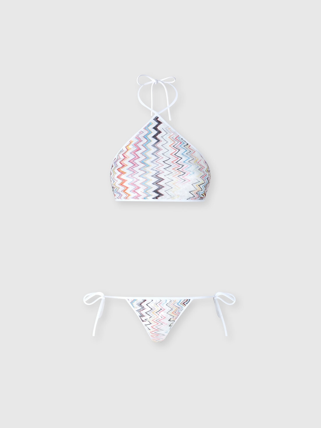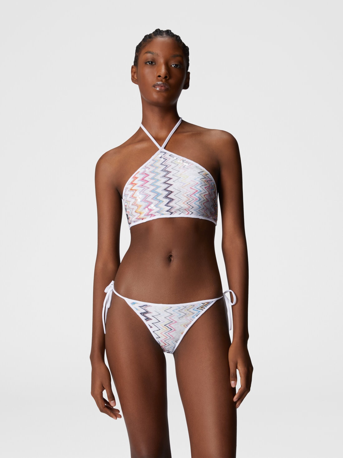 The iconic Missoni zigzag pattern comes to life in this bikini with a halter neckline, enriched by Raschel craftsmanship and sparkling sequins. A piece that celebrates light and movement in every detail.