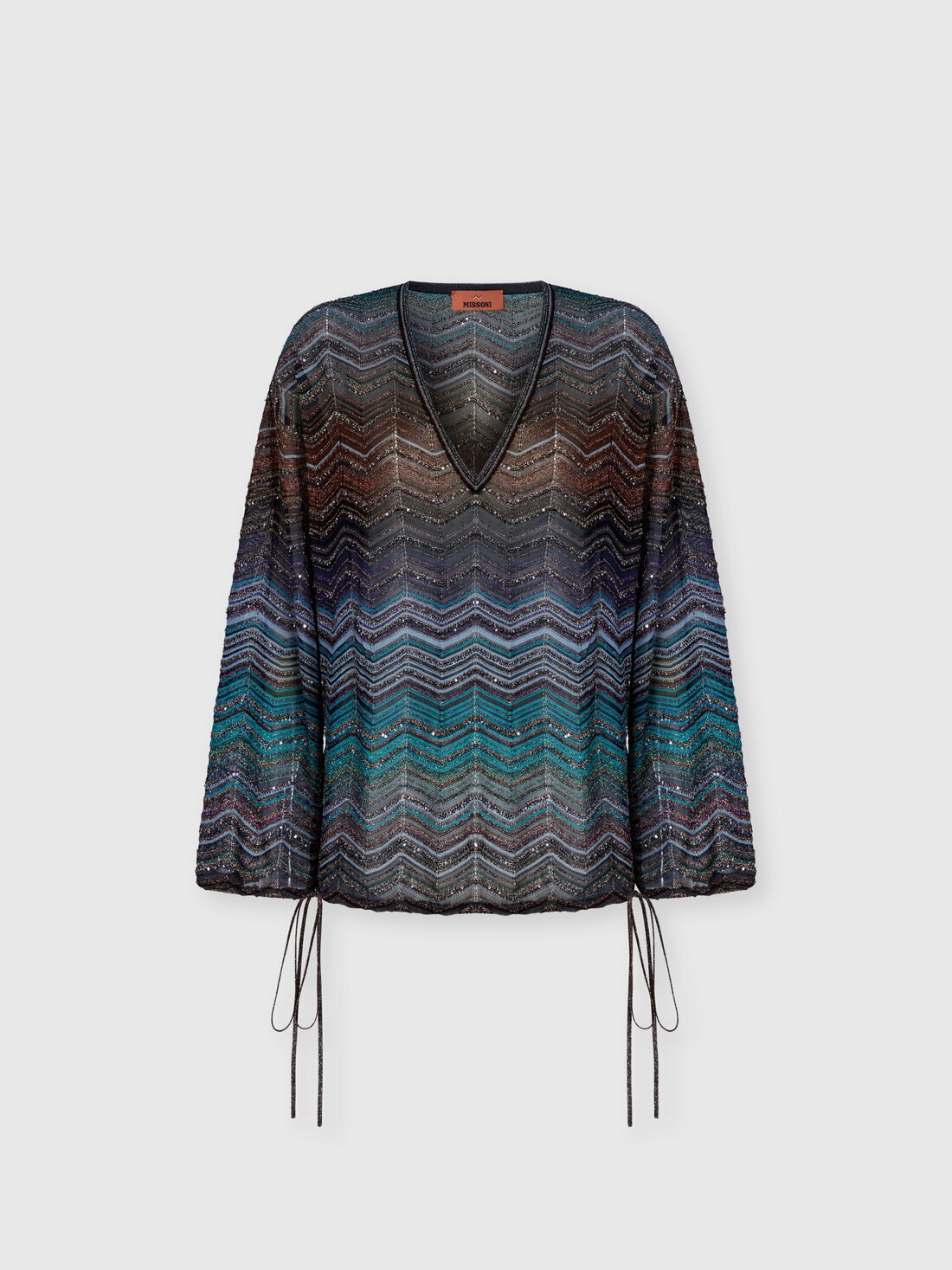 A sophisticated and lightweight reinterpretation of the maison’s iconic graphics, expressing the unmistakable balance between luminosity, movement, and Missoni style. This oversized women’s blouse in viscose chevron lamé with sequins features a deep V-neckline that enhances femininity with natural elegance.