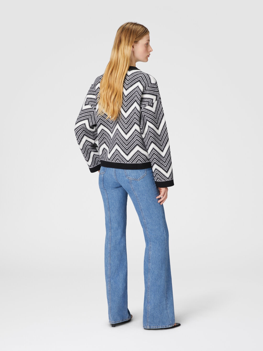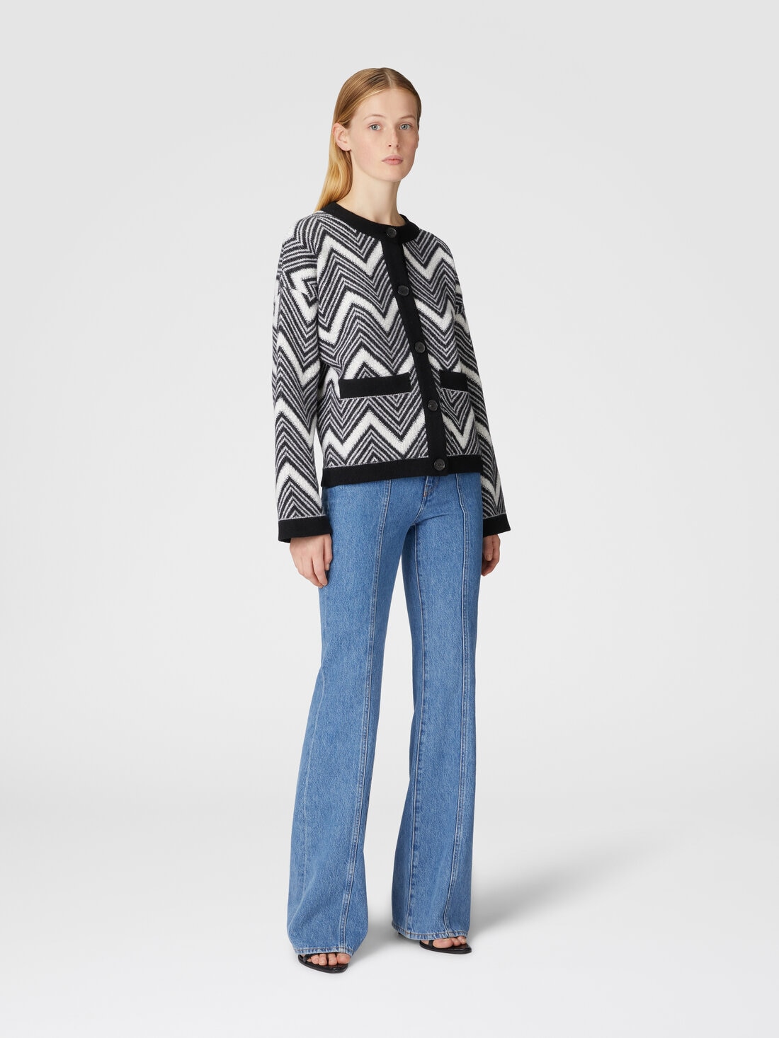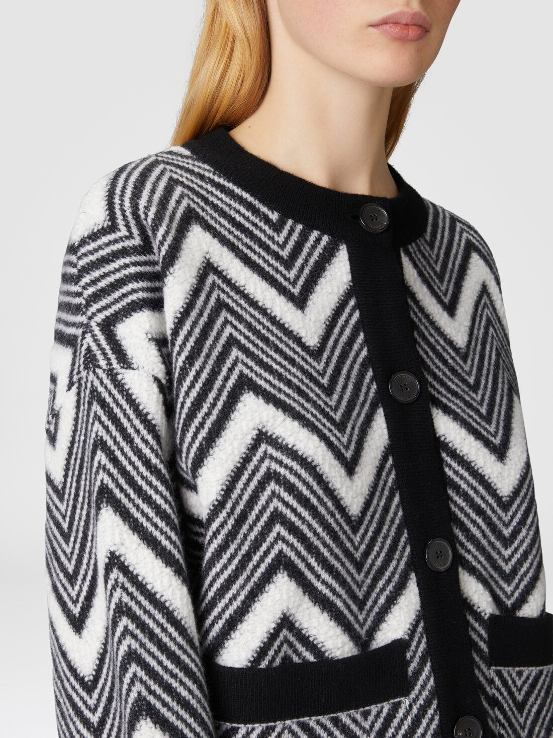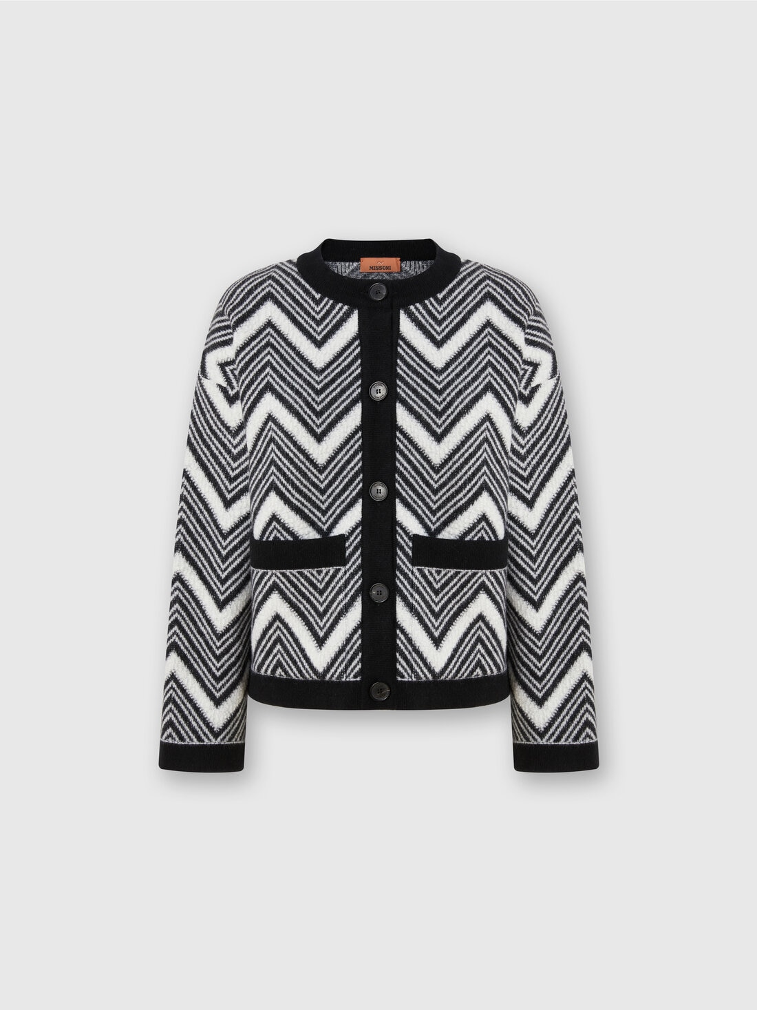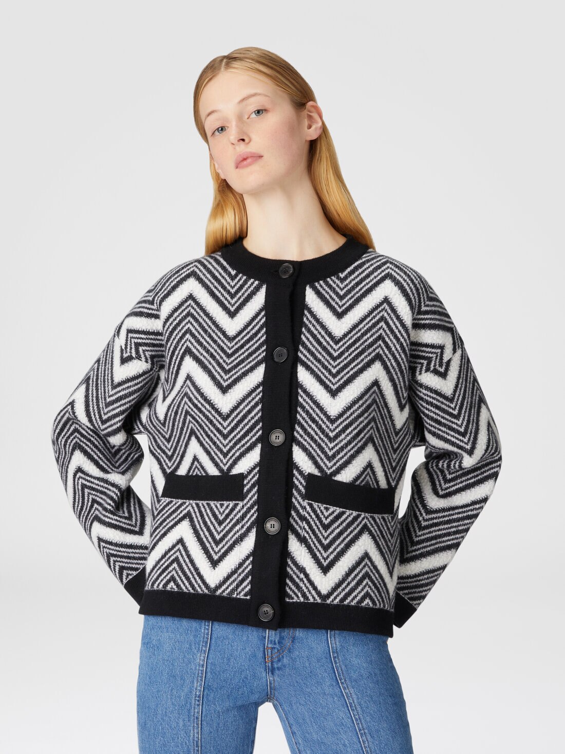 A new interpretation of the chevron, with terry-stitch inserts, is crossed by the wool jacket. The crew-neck model, with contrasting piping and personalized buttons, is completed by front pockets.