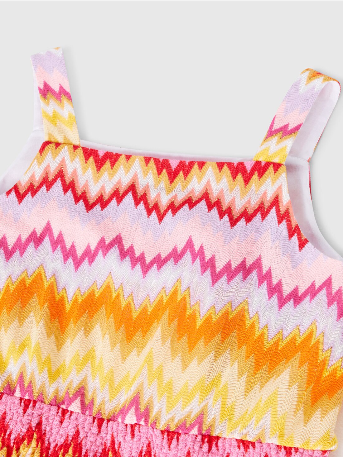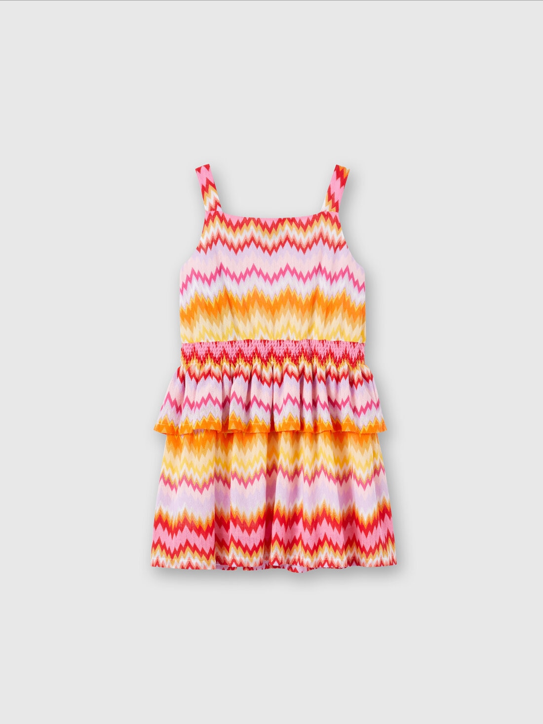 The zigzag, Missoni's signature pattern, lights up with vibrant hues on the girls’ dress made of a cotton blend. The model with flared bottom features ruffles at the waist and shoulder straps.