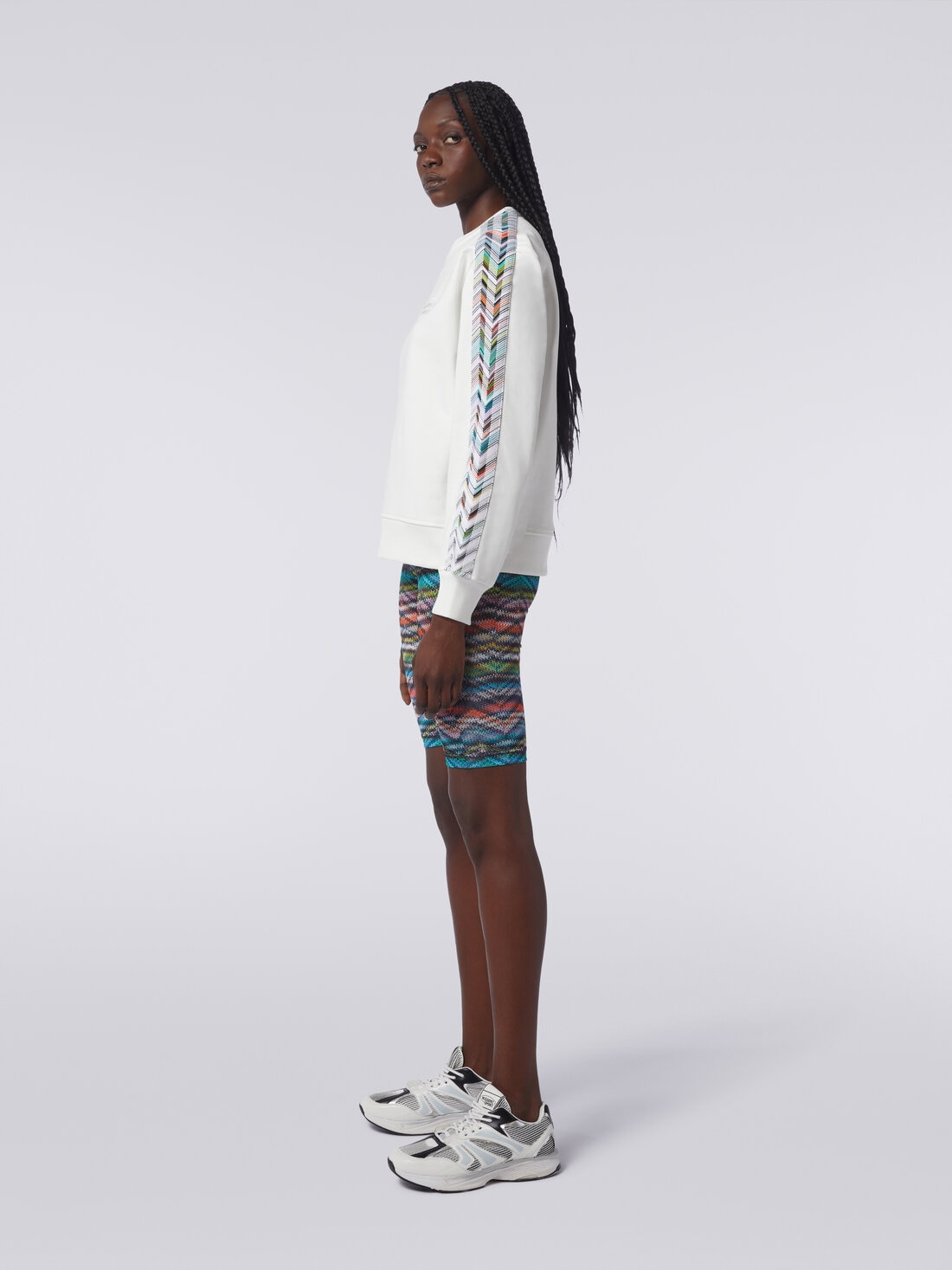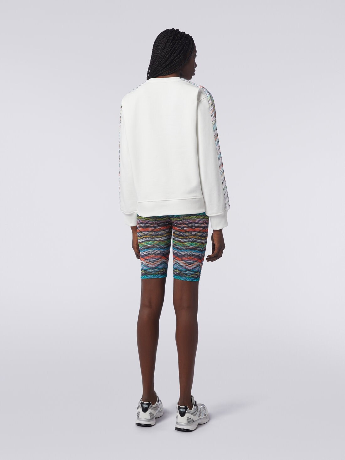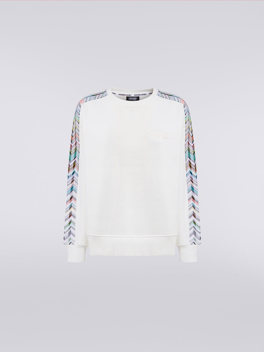 When the detail makes the difference, you can be sure that Missoni has a hand in it. This is certainly the case with the women’s crew-neck sweatshirt. Made of pure cotton, it is enriched by the Caperdoni patterned knit bands running down the sleeves and customised by the embroidered logo.