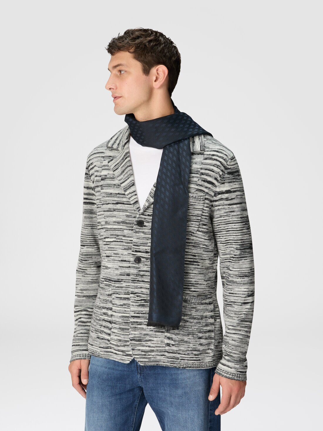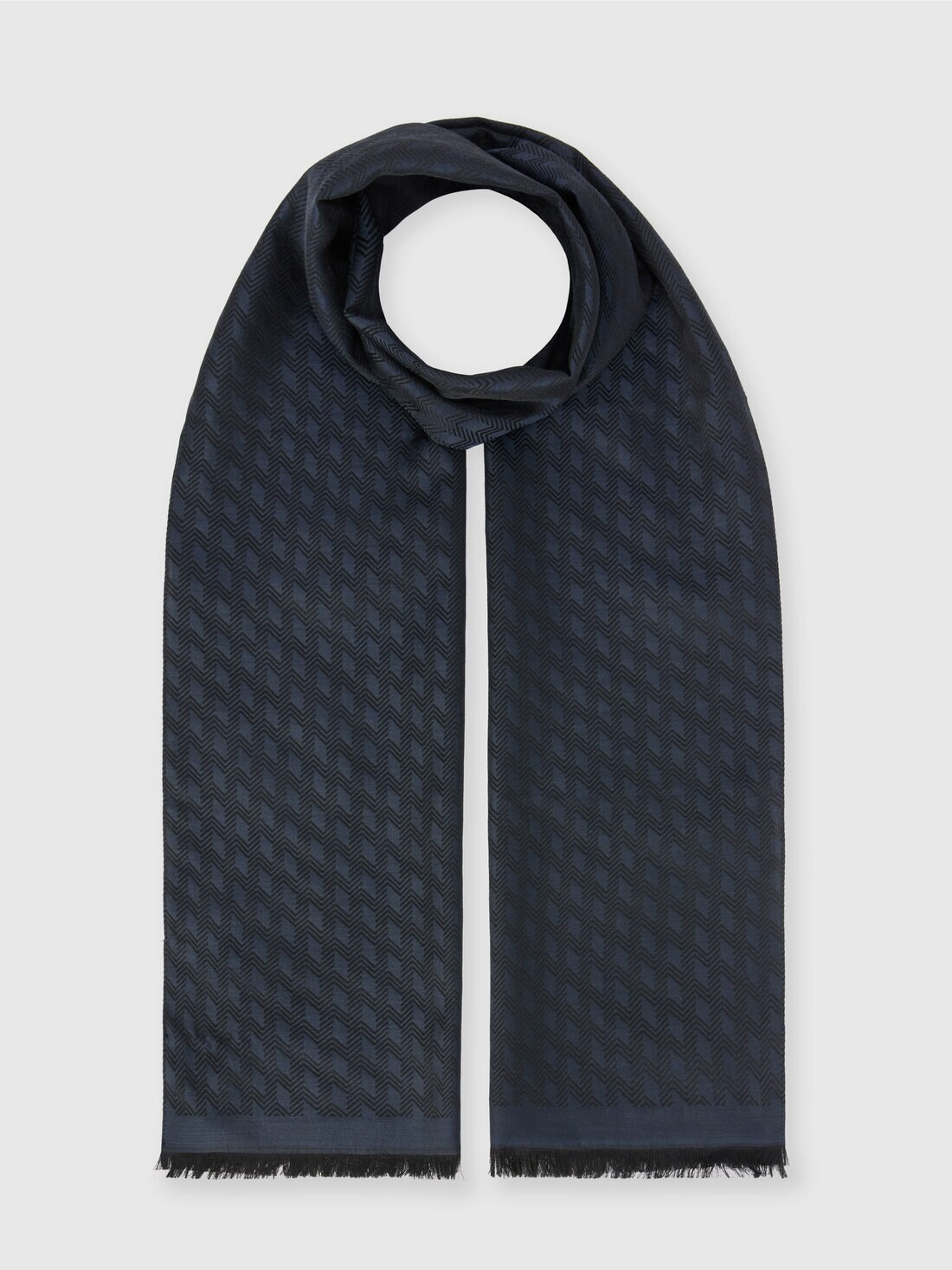 Punctuated by a mix of patterns on which a dégradé color is applied, the men's wool blend scarf is finished with a fringed profile.