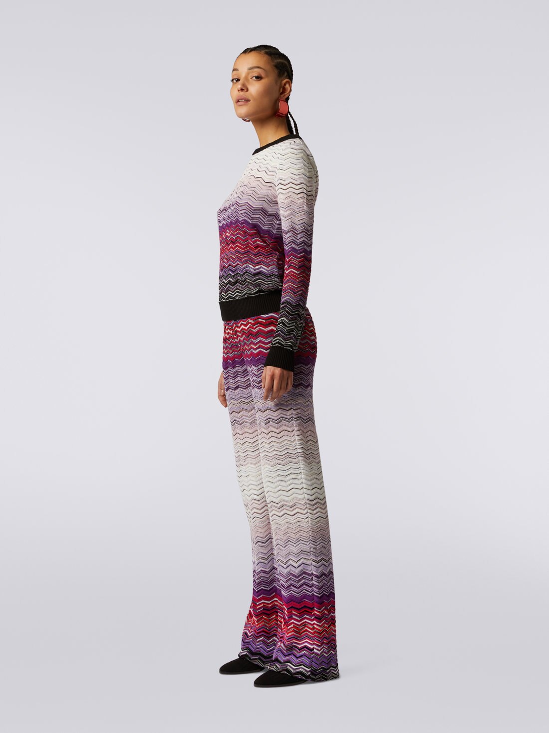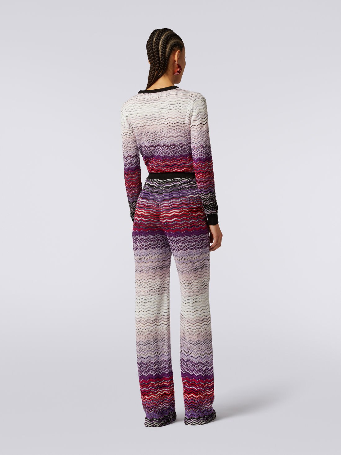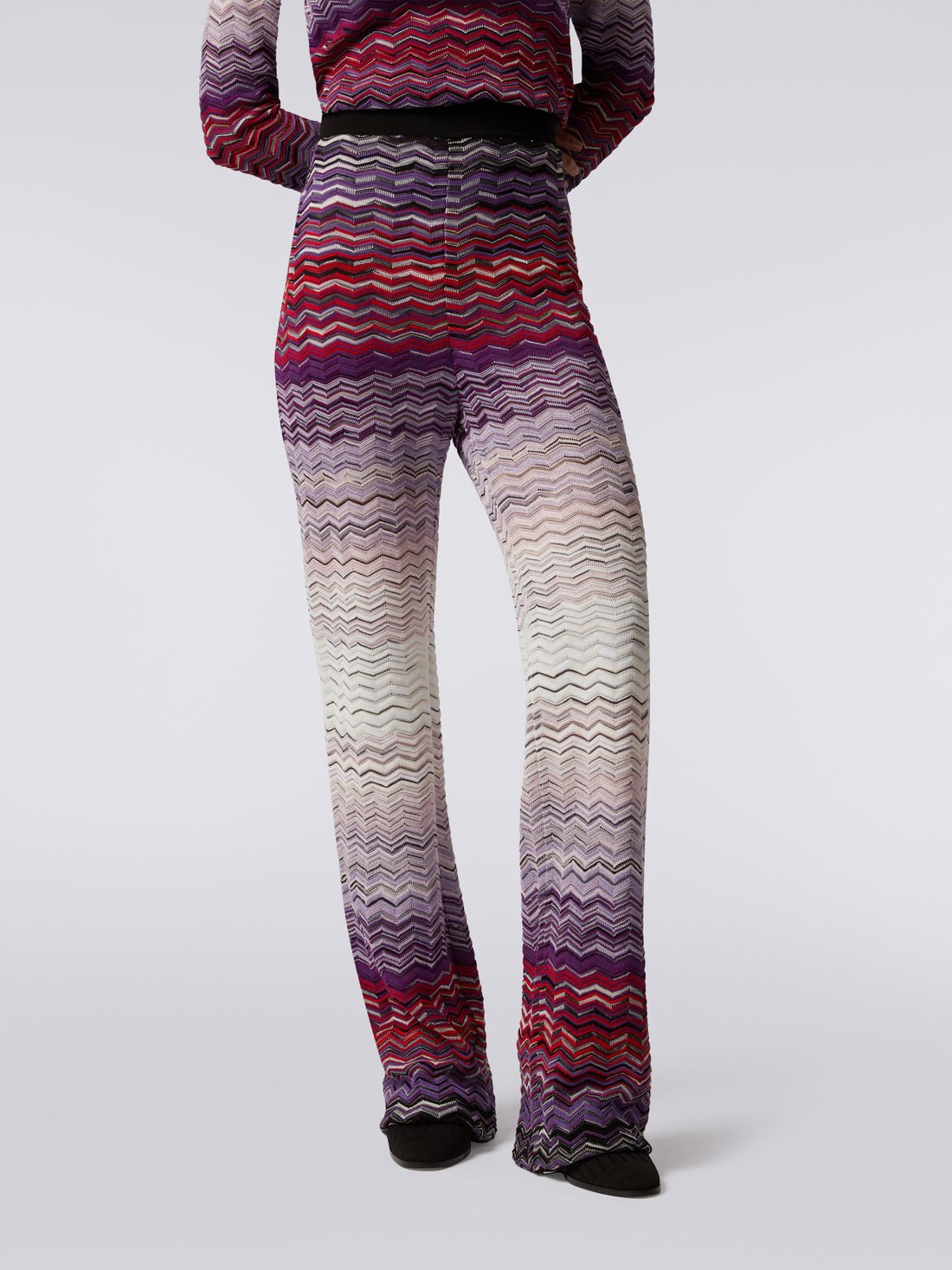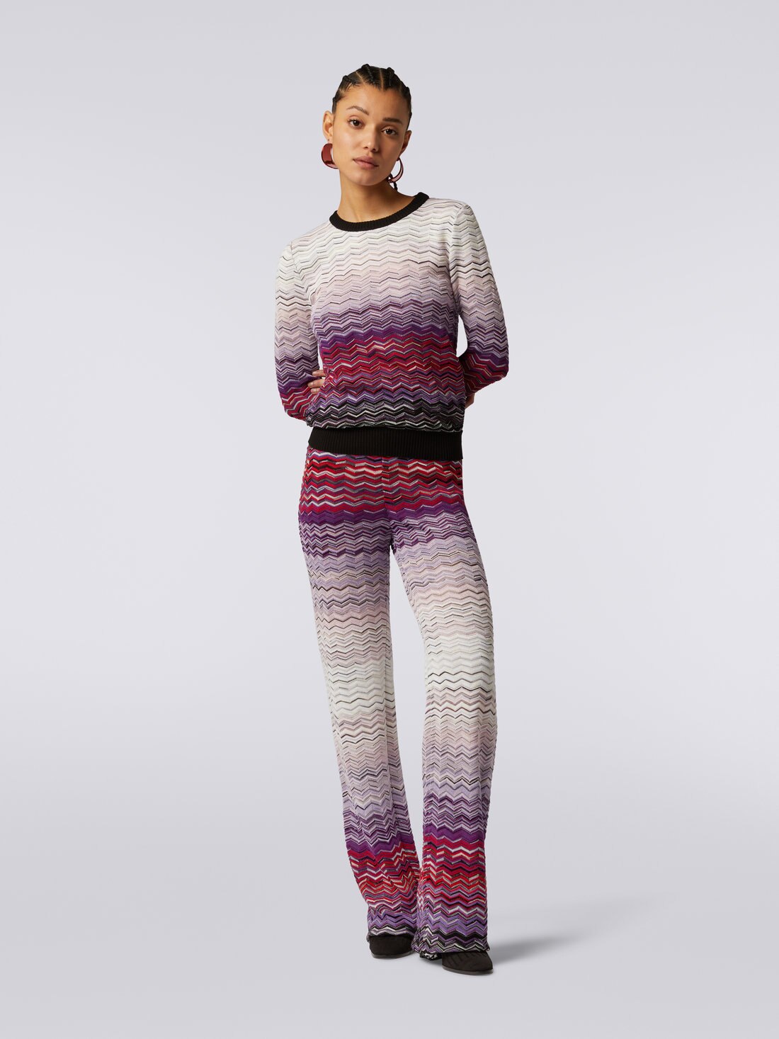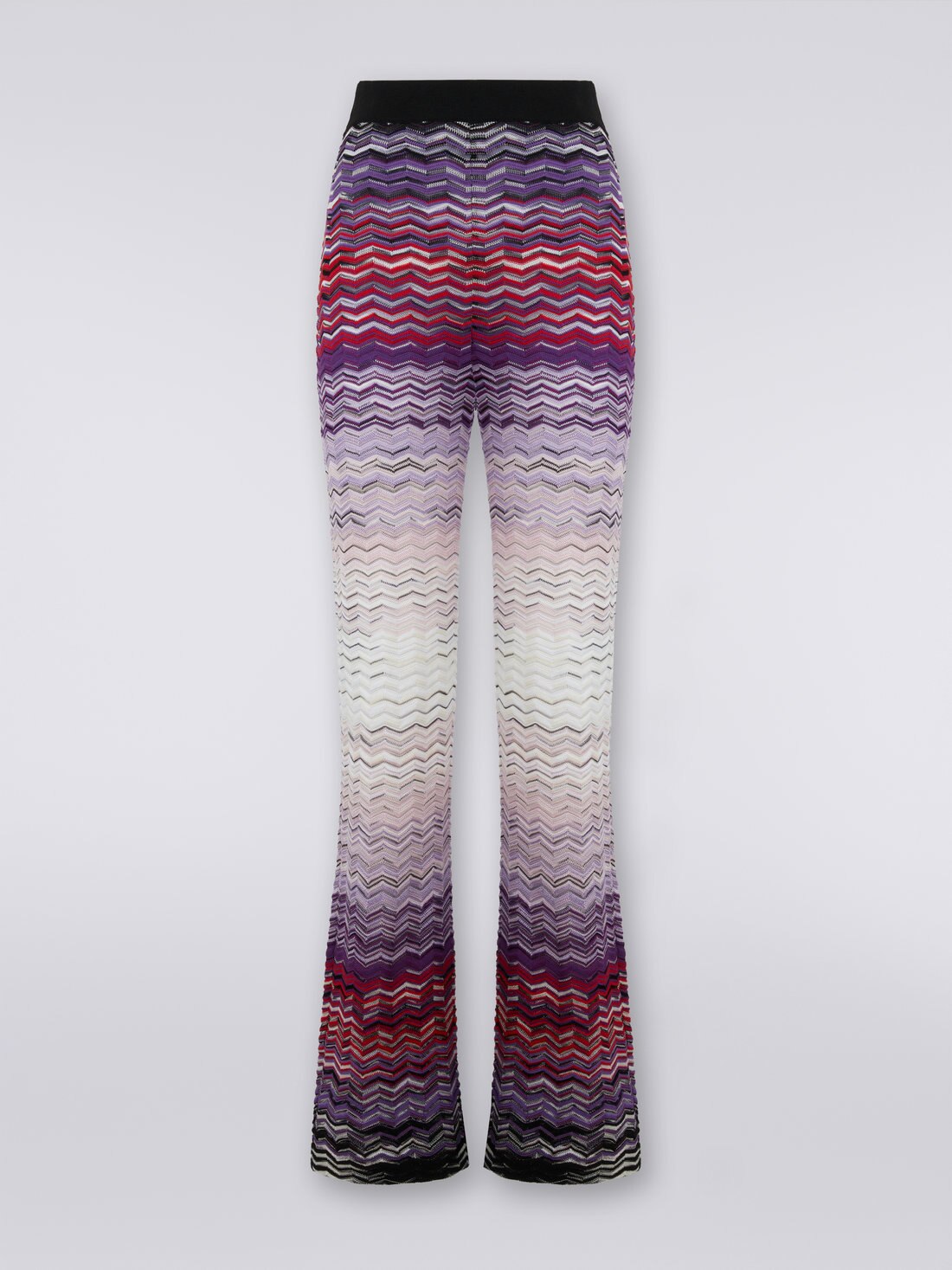 The iconic chevron motif in a dégradé version is used by Missoni to give an unusual touch to the women’s long trousers in viscose and cotton. Featuring a flared cut and a contrasting elasticated waistband, they combine comfort and refined femininity.