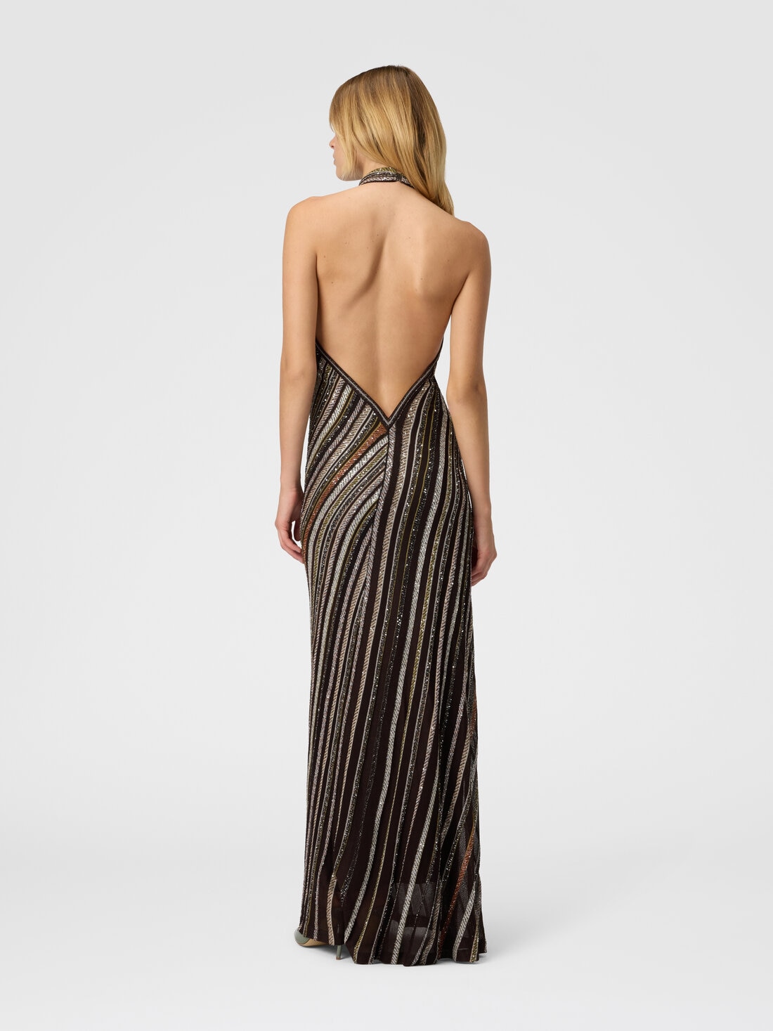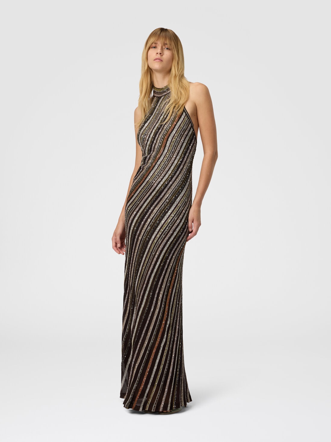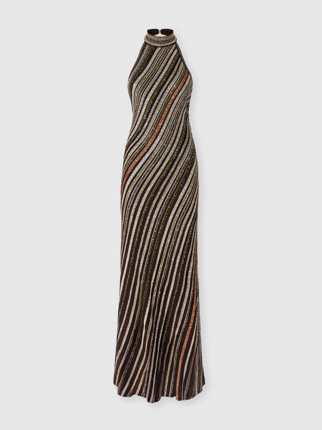 A luminous elegance defines this long women's dress by Missoni, featuring a halter neckline that enhances the figure. The herringbone striped knit is enriched with lamé threads and sequins, creating a refined play of reflections—perfect for special occasions and true to the brand’s signature aesthetic.