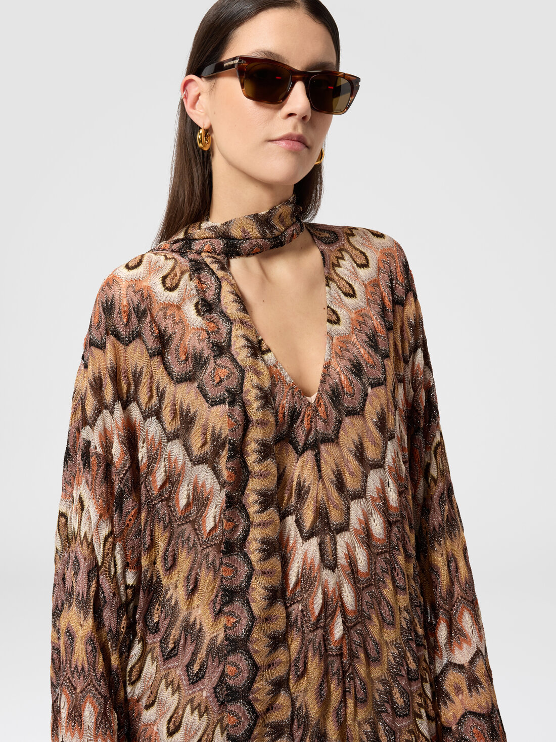 A women’s long dress in lamé viscose with a removable neck sash, defined by fine raschel lace workmanship featuring an arabesque pattern. A piece that expresses the maison’s artisanal mastery through a balance of light and elegance.