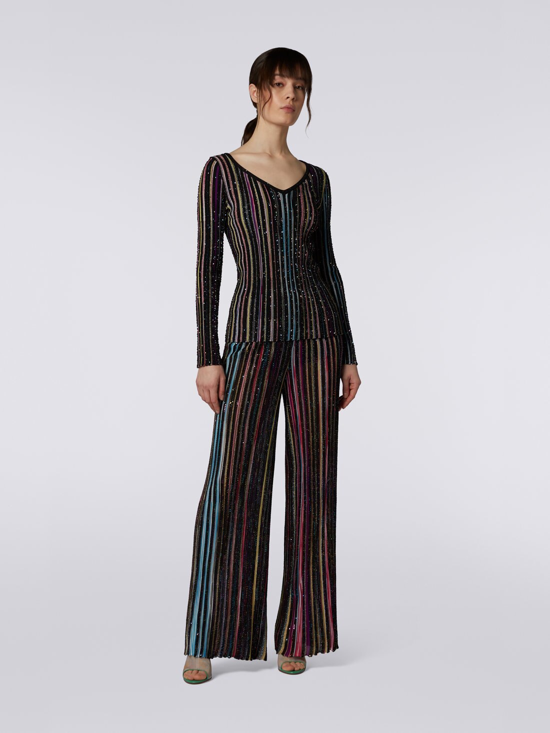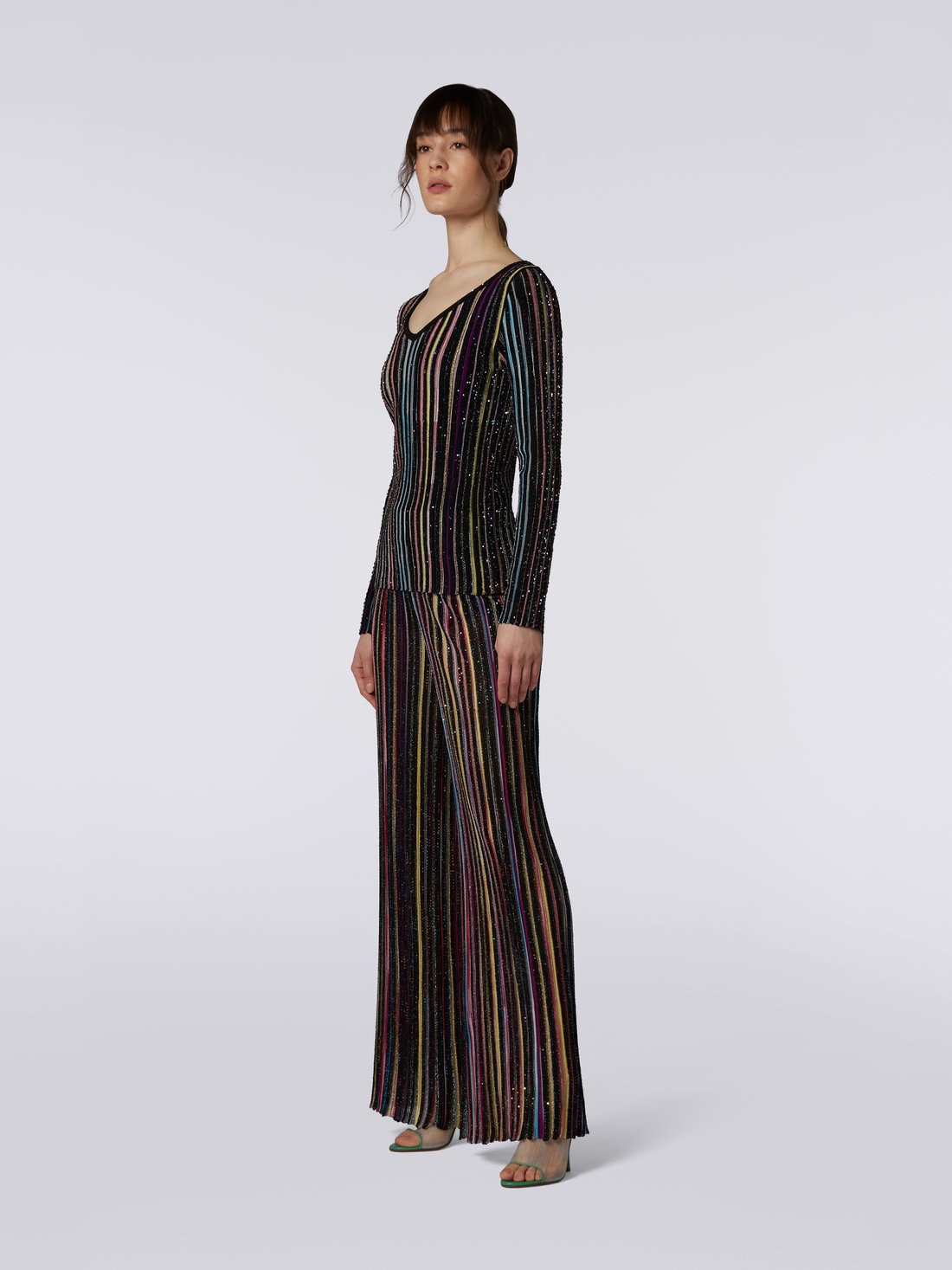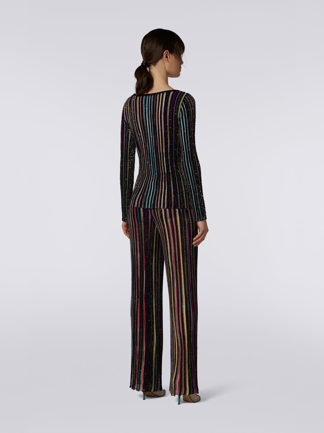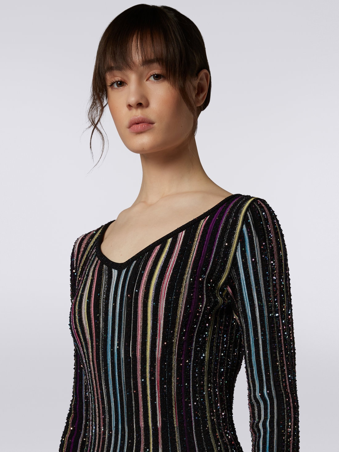Love at first sight is guaranteed with the women’s long-sleeved shirt. A wide V-neck design piece made of a viscose blend with a ribbed knit and multicoloured stripes, embellished with iridescent sequin appliqués.