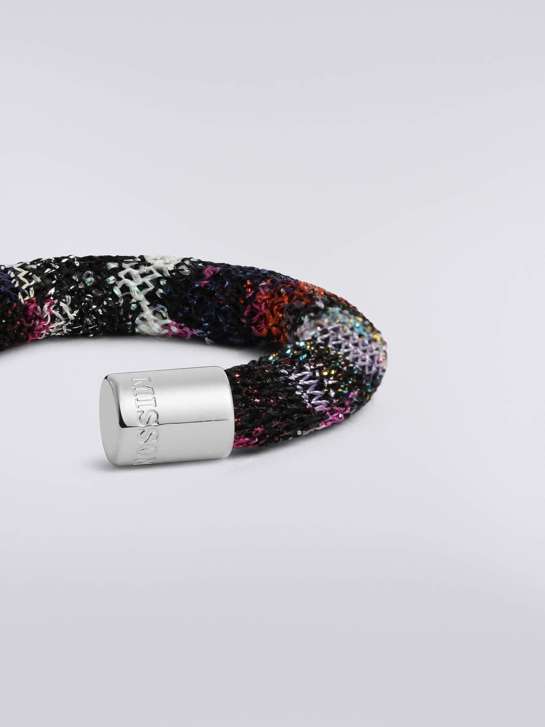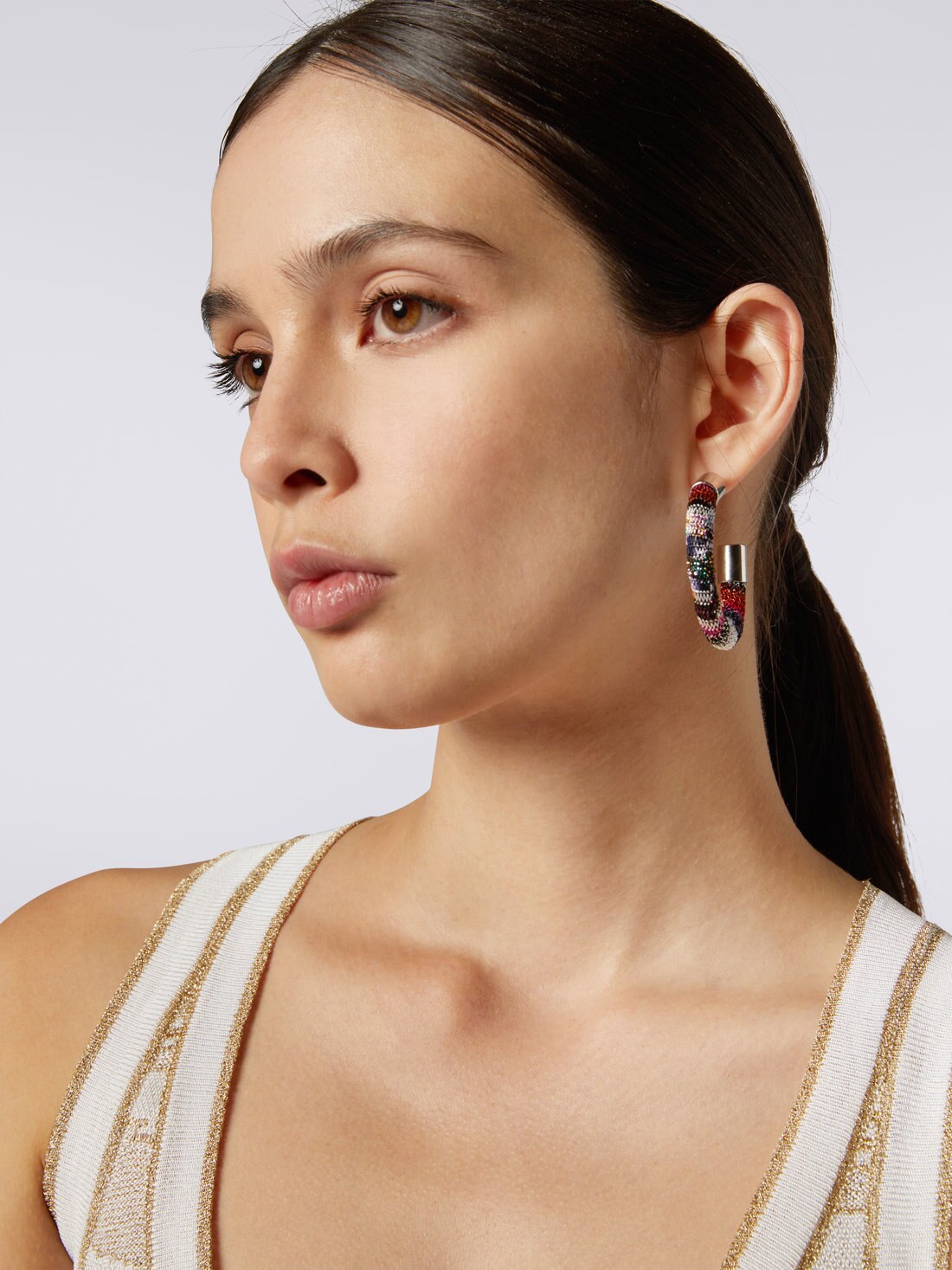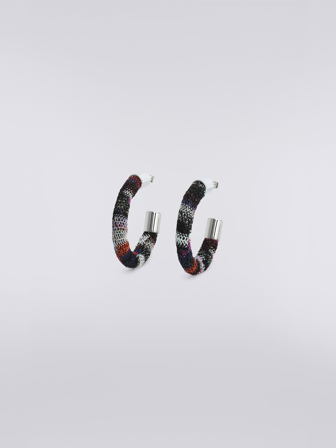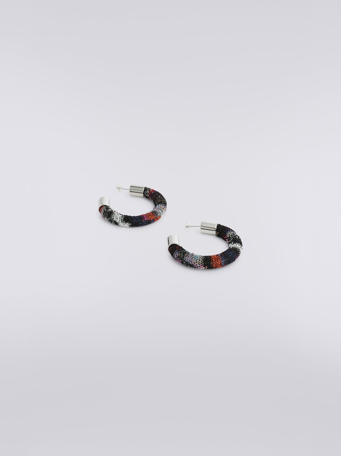 Missoni’s rigid hoop earrings, created from fabric enriched with lurex threads, embody the elegance and distinctive spirit of the brand. The skilful use of lurex adds a touch of brilliance to the multicoloured raschel technique of the fabric.