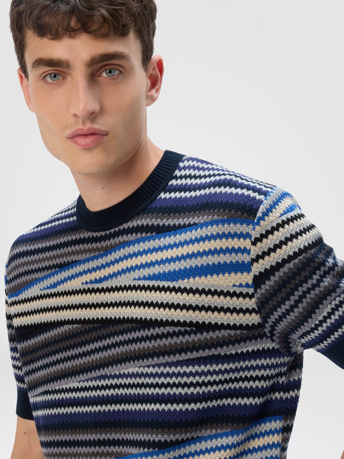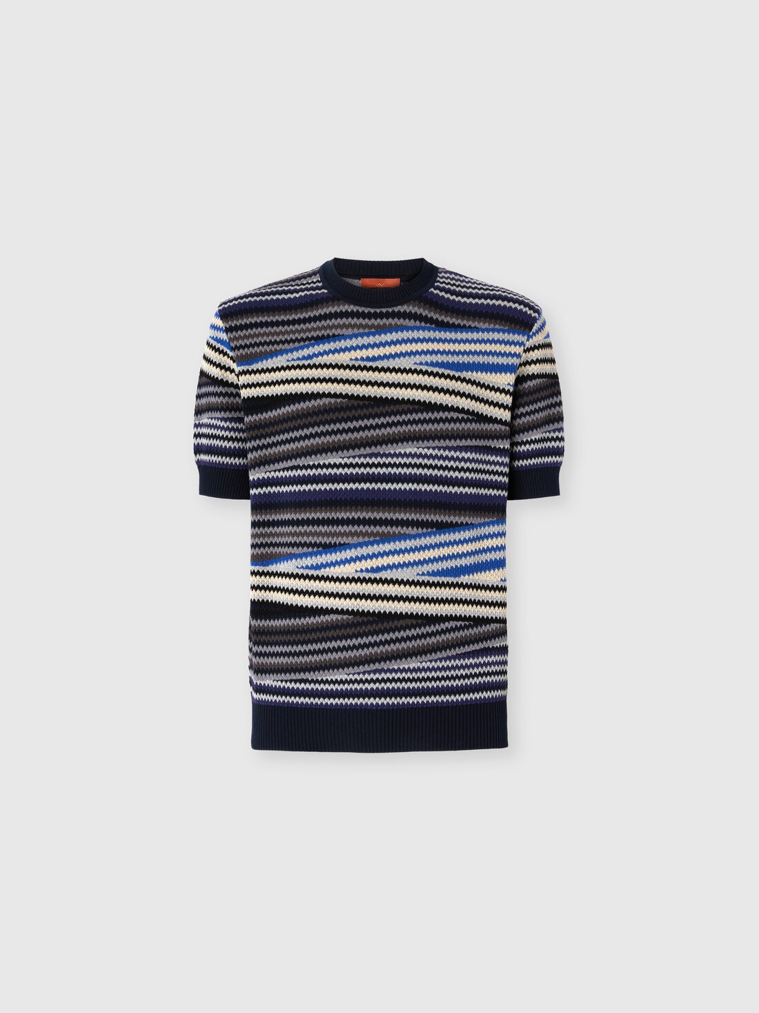 Fresh and contemporary, this men’s short-sleeve T-shirt in 100% cotton reinterprets the classic Missoni motif with a striped micro zigzag full of graphic and sophisticated appeal. The contrasting trim adds a dynamic touch, enhancing the design with subtle originality.