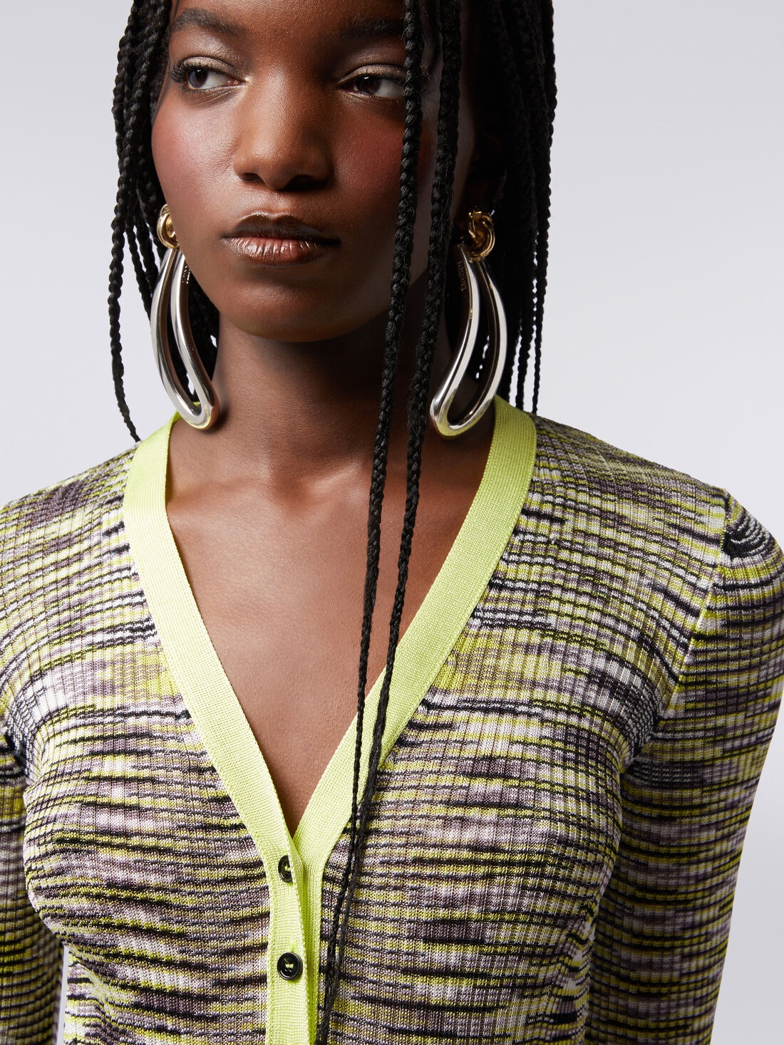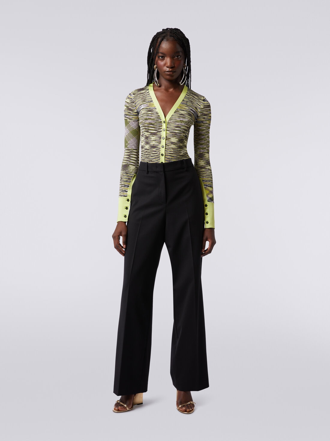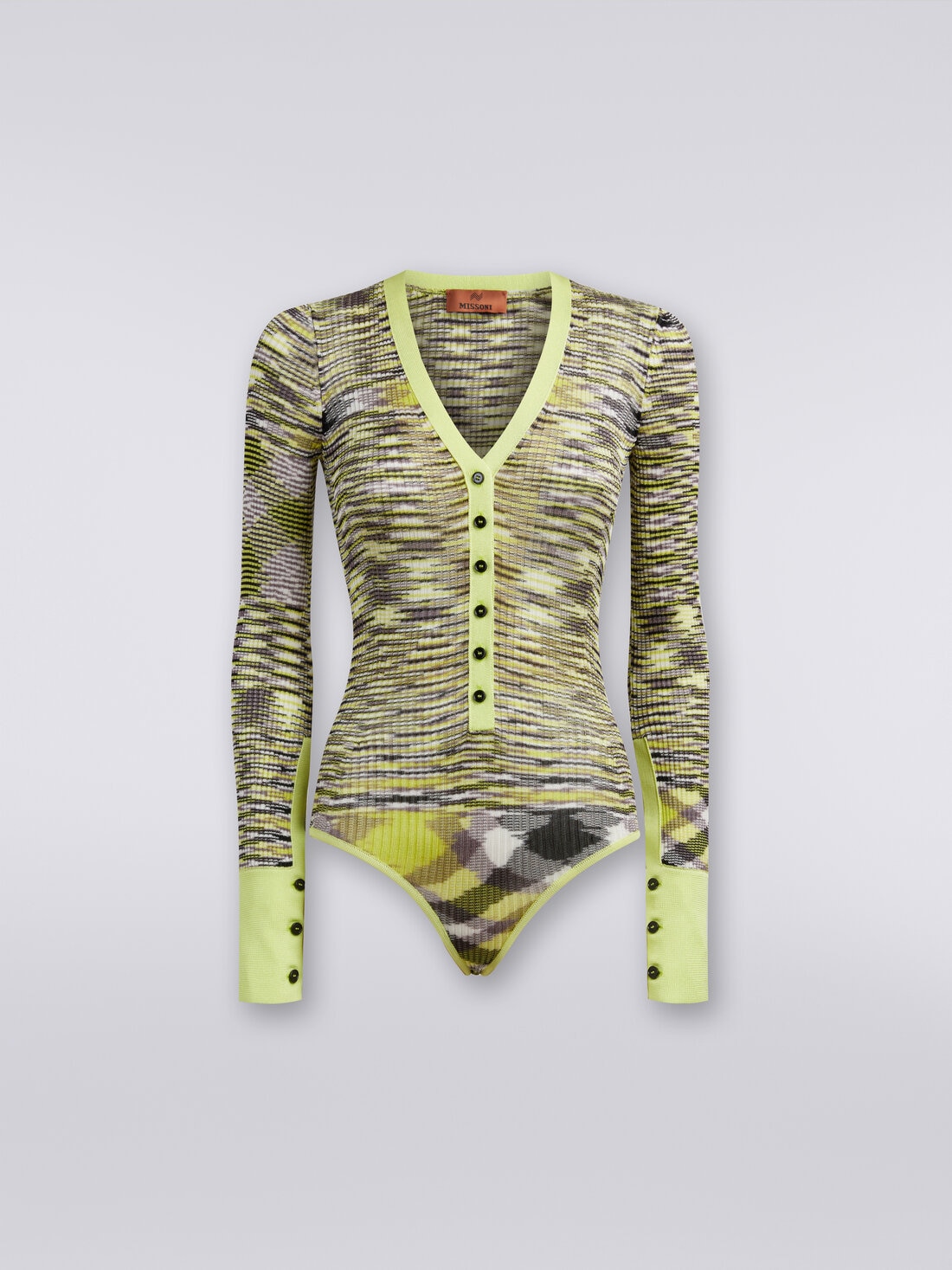 The slub viscose blend knit, with ribbed knitting, shapes the slim-fit women’s bodysuit with long sleeves. The design of the garment is characterised by a V neckline, button placket and contrasting trim.