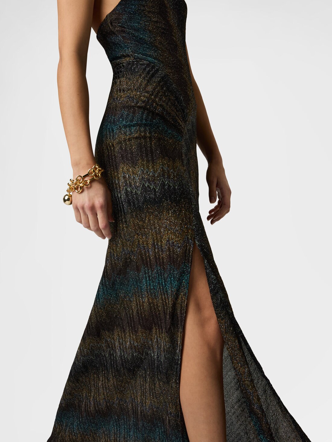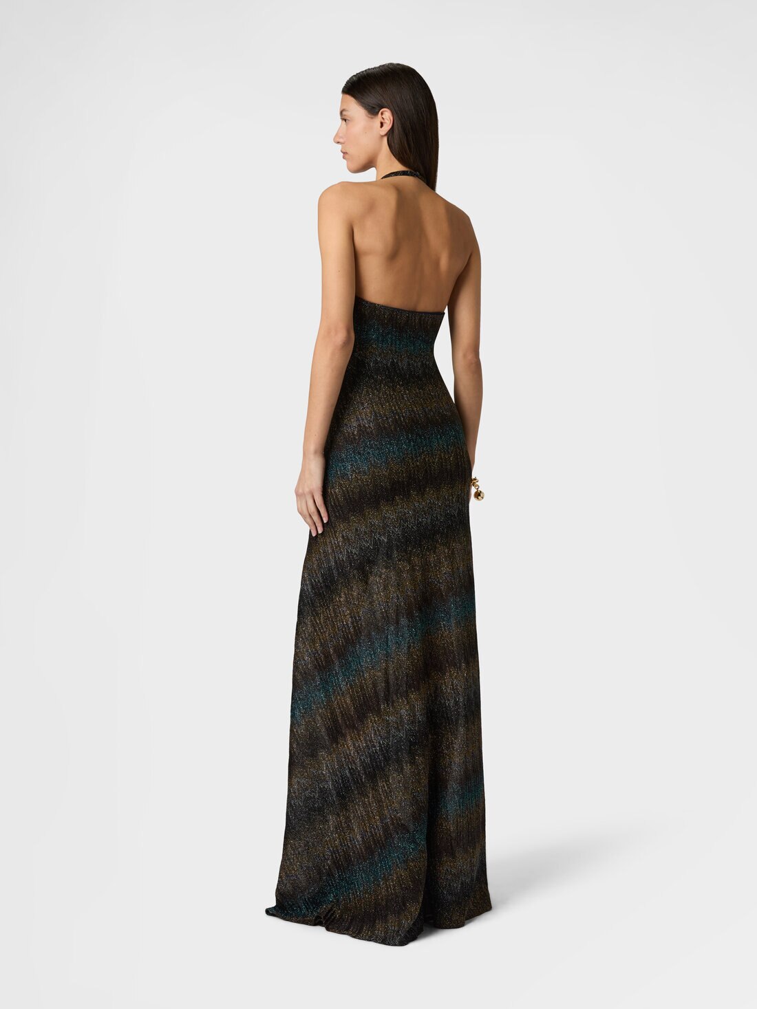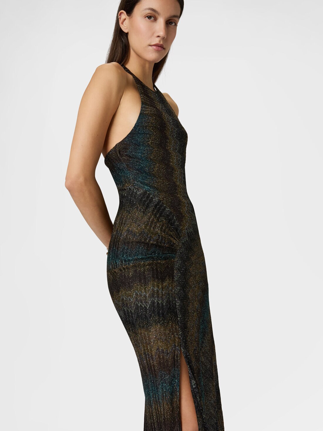 The luminosity of viscose lamé meets raschel workmanship in the irregular snake motif of this long women’s dress with halter neckline and side slit. A perfect balance between modernity and Missoni’s iconic elegance.