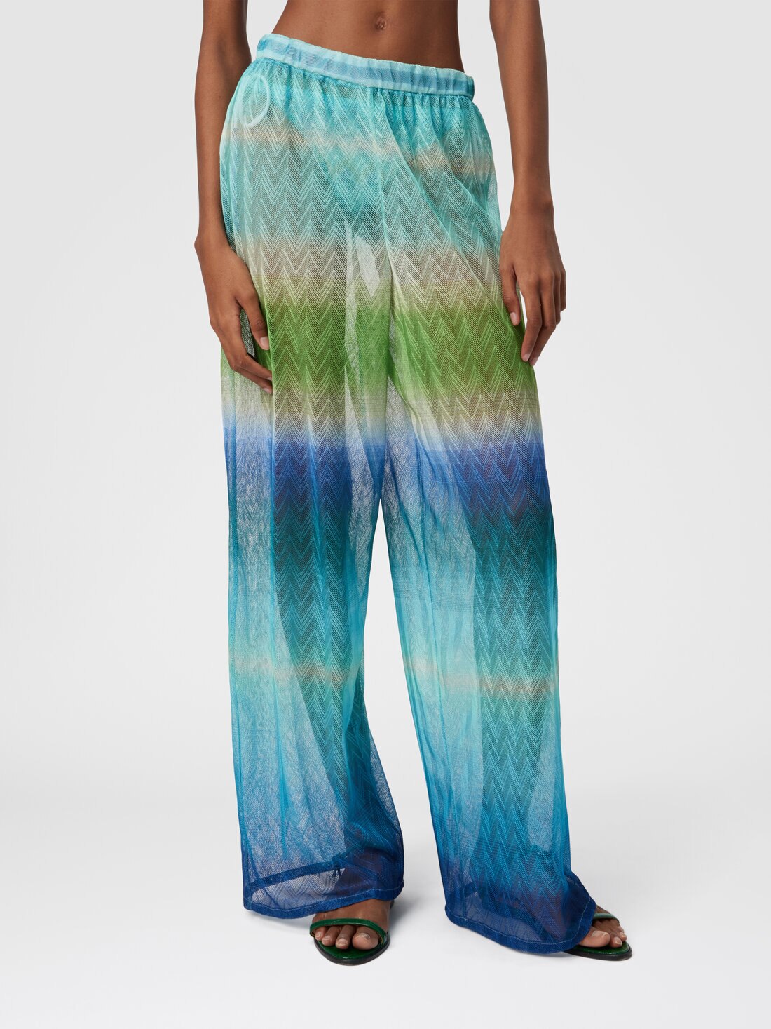 With a graphic and bold design, these straight-leg women’s trousers with raschel workmanship are printed with shaded micro and macro stripes that create a dynamic and distinctive visual effect. A versatile and characterful piece, perfect for completing contemporary looks with personality.