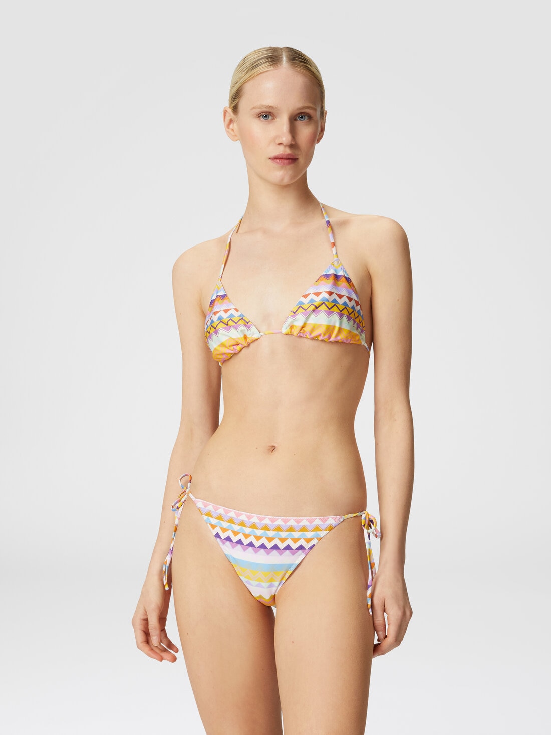 The women's bikini in stretch fabric, consisting of a triangle bra and briefs with ties, shows a rhythmic and discontinuous progression of the zigzag print.