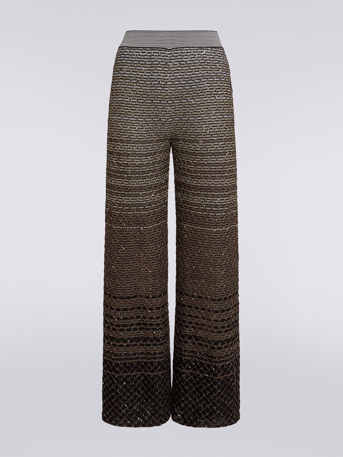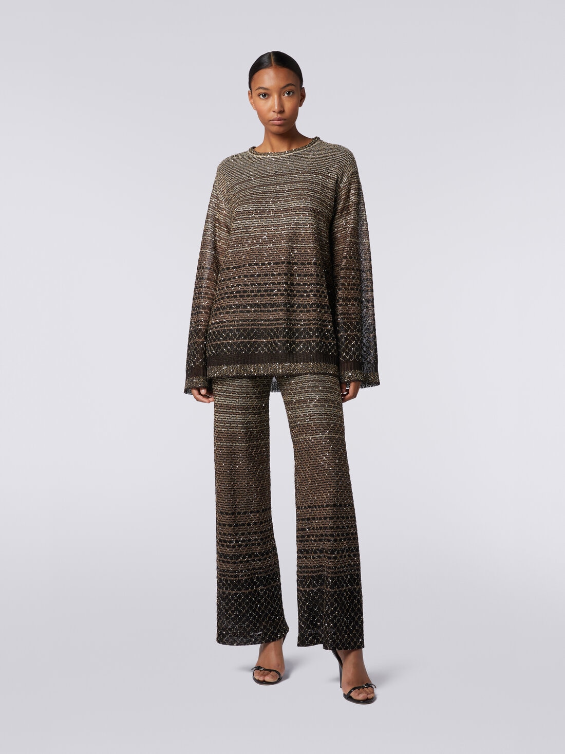 An elegant straight cut, emphasised by the striped pattern sloping towards the bottom, for the women’s trousers in a viscose blend knit. The garment, with ribbed elasticated waistband, is enriched by a refined diamond stitch, forming a lattice embellished by sequin appliqués.