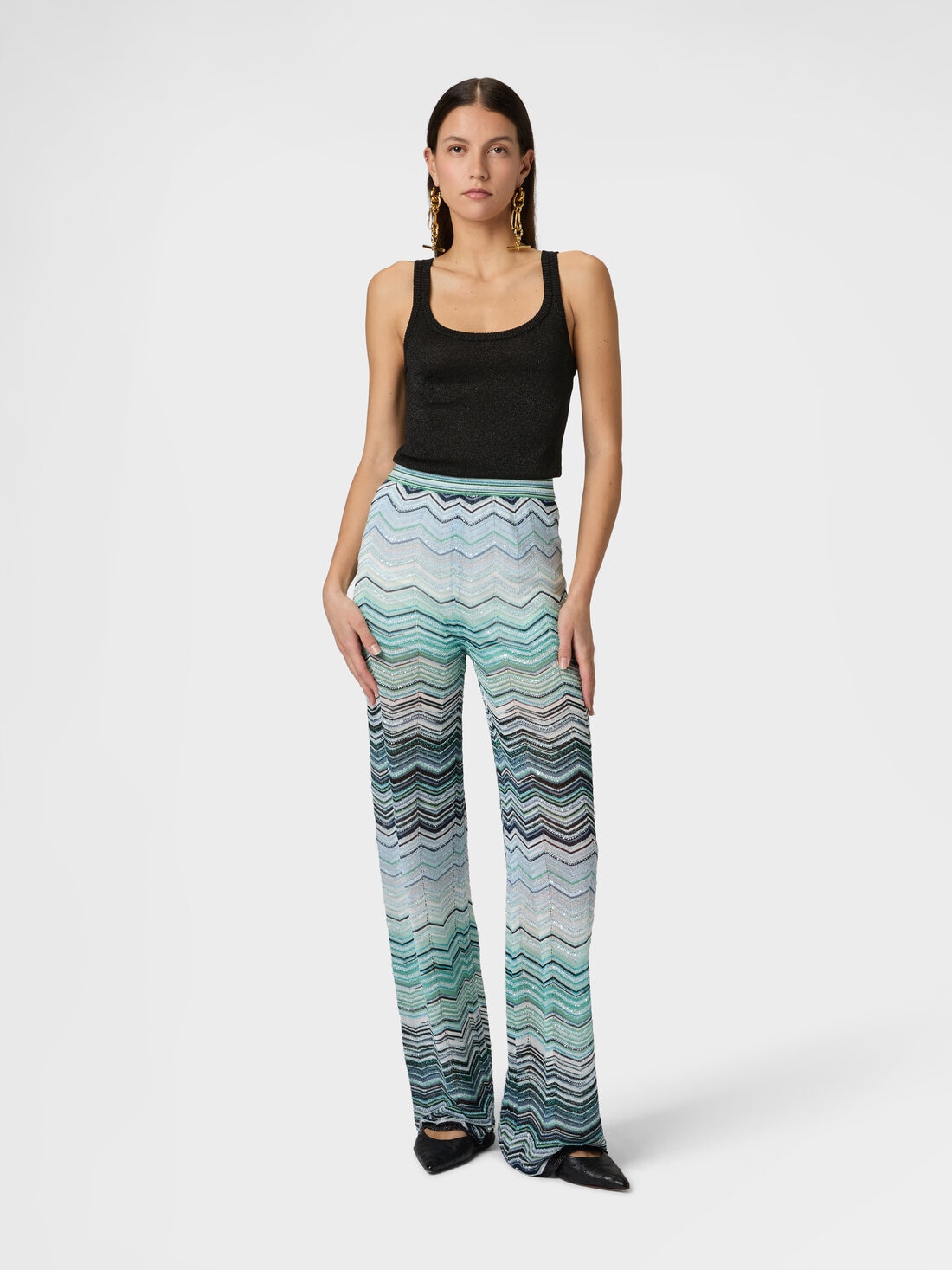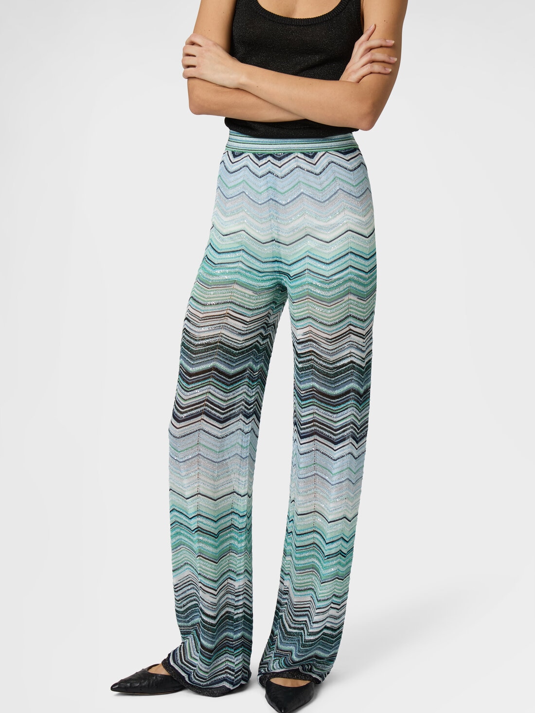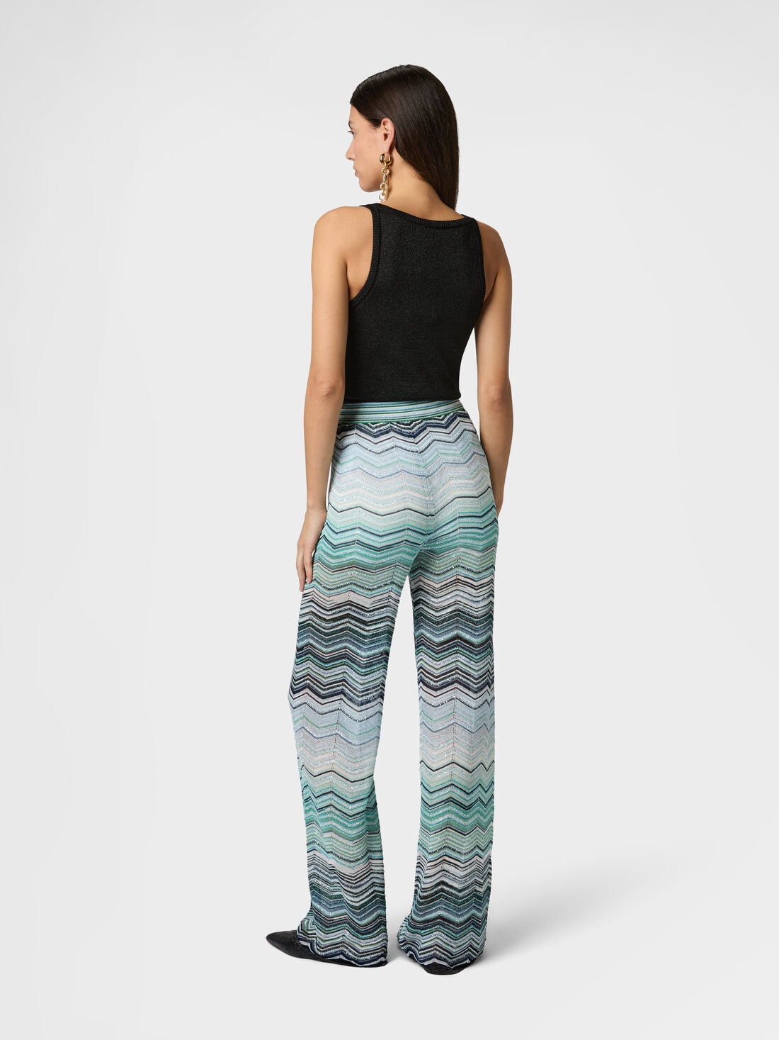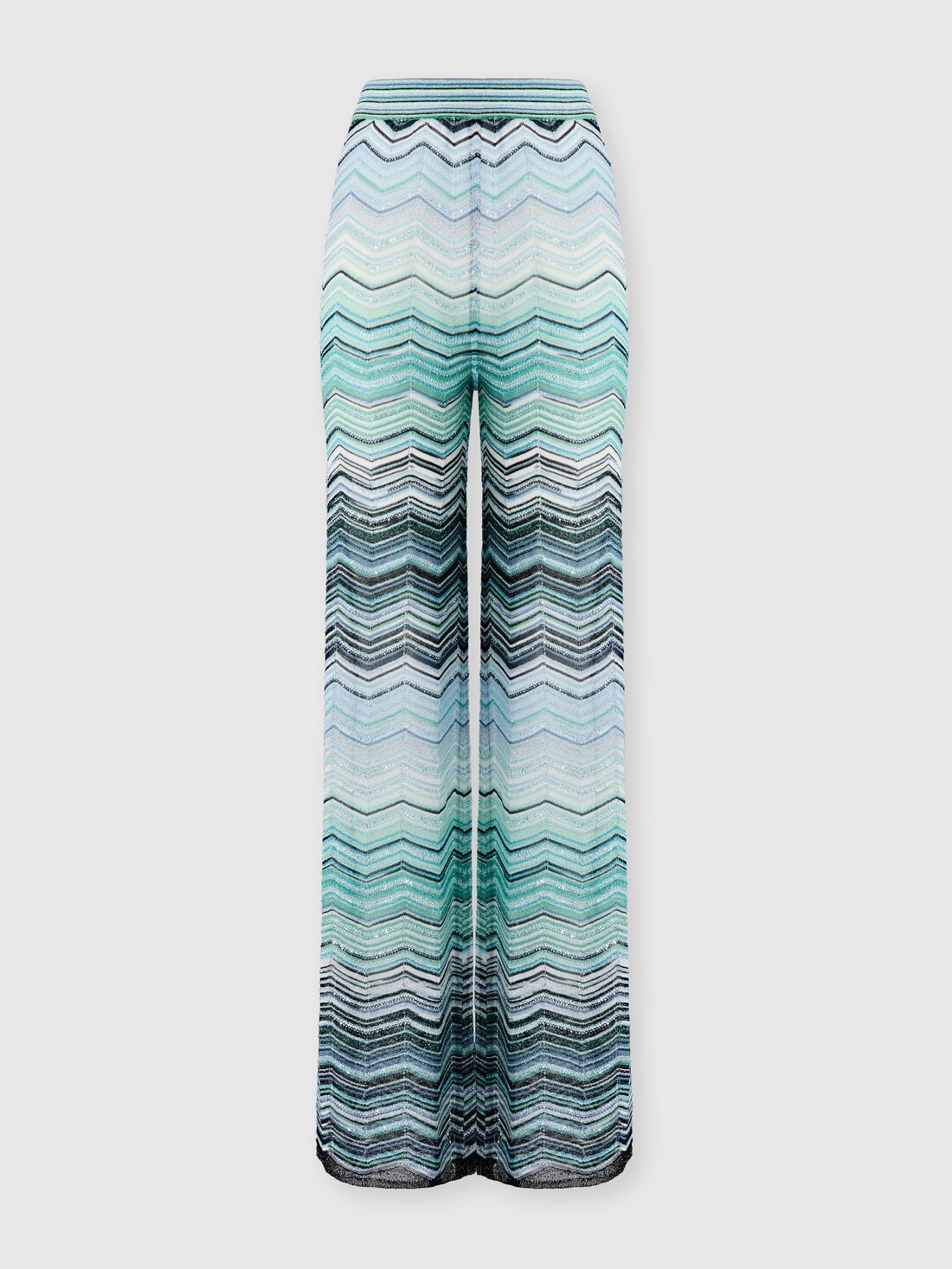 Wide-leg women’s trousers crafted from chevron lamé viscose with sequin embellishment and an elasticated waistband. A piece that blends radiance and comfort, expressing Missoni’s refined artisanal craftsmanship.
