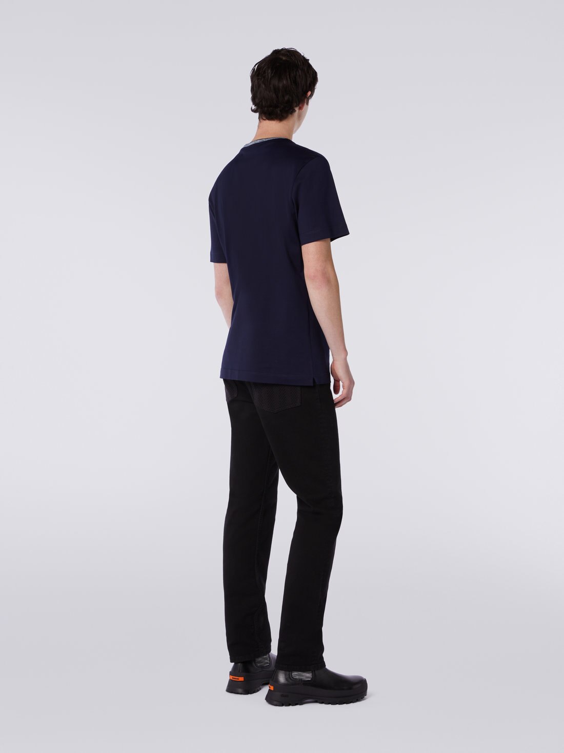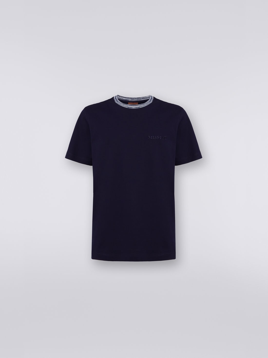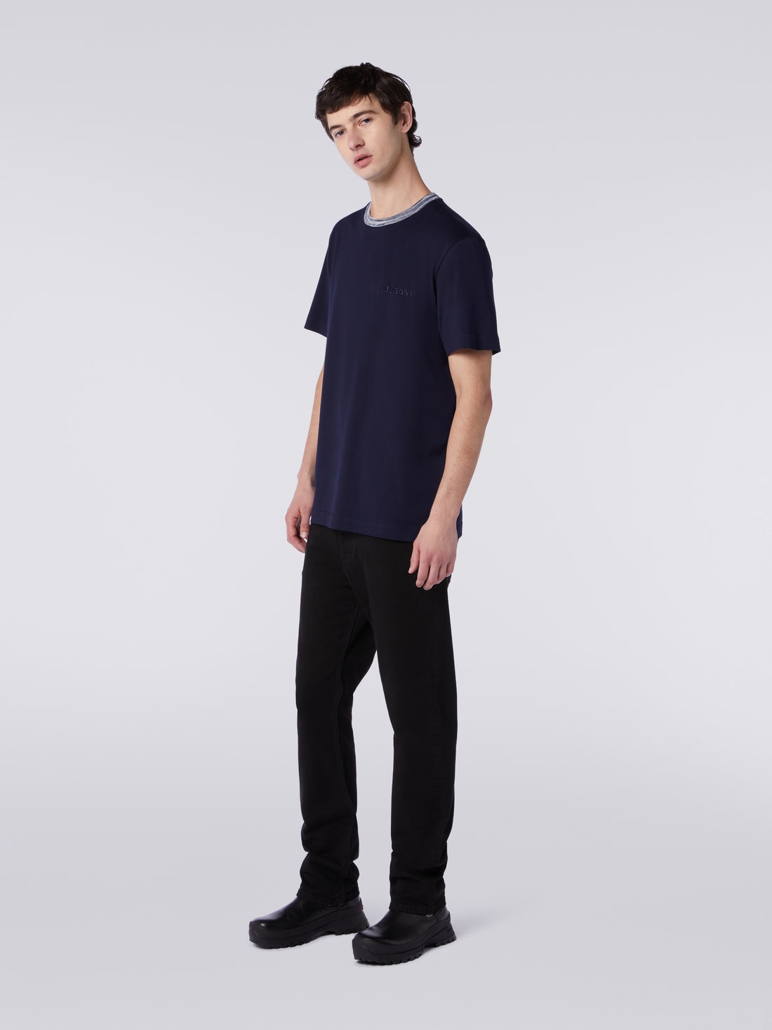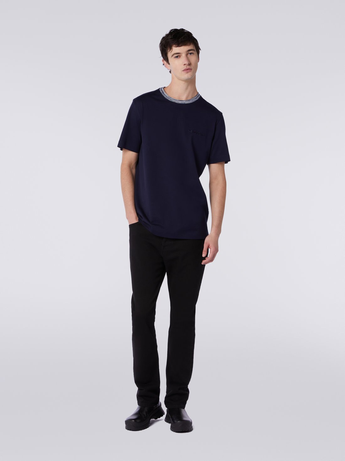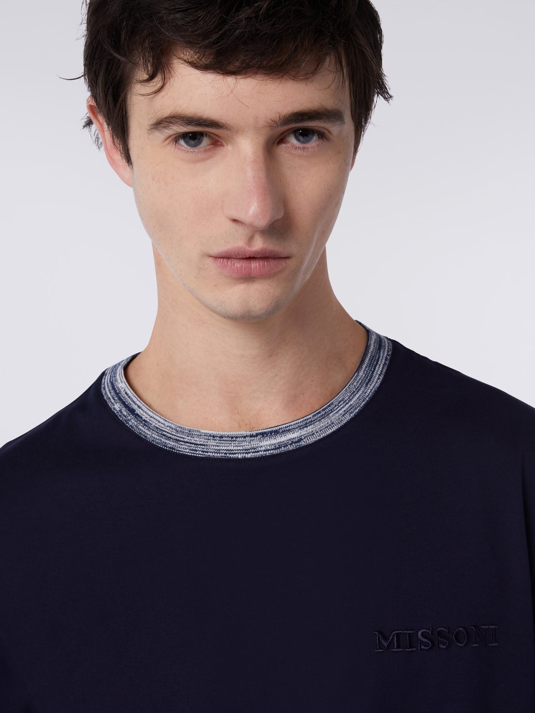 The crew-neck men’s short-sleeved T-shirt, an essential garment par excellence, is transformed, with Missoni’s touch, into a truly charming piece. This transformation is thanks to the slub knit detailing on the collar and the tone-on-tone embroidered logo lettering.