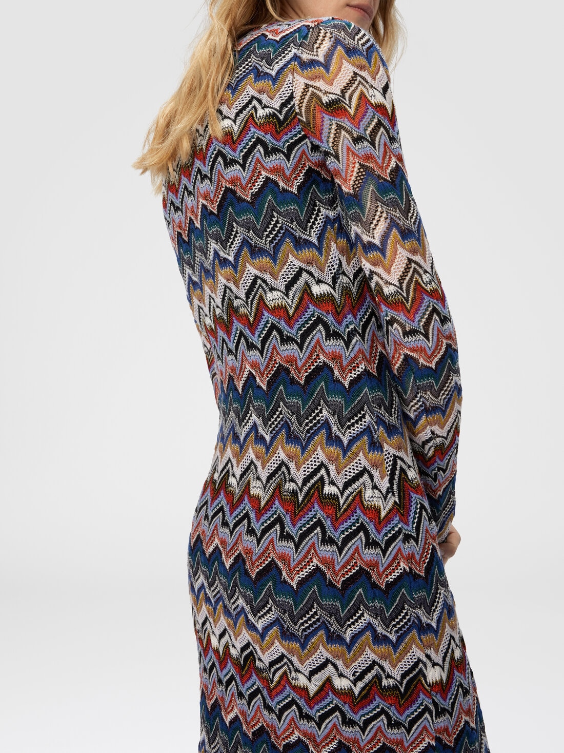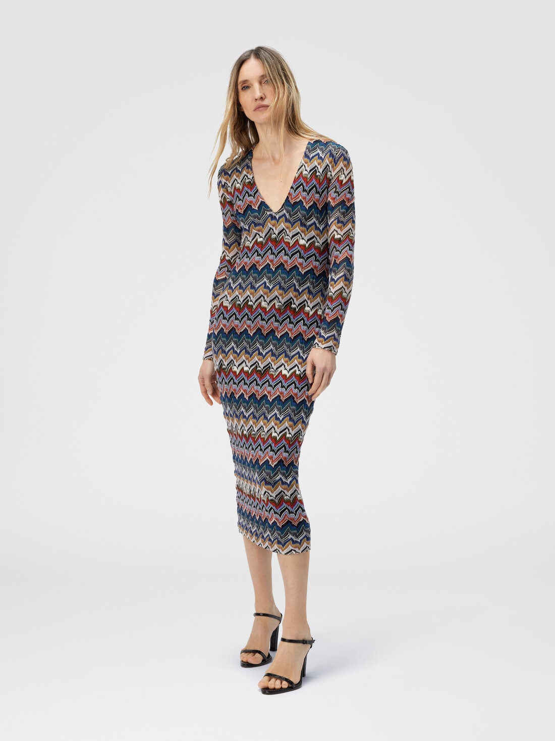 This long-sleeved V-neck midi dress blends femininity and refinement through its raschel lace-effect knit, evoking Missoni’s iconic zigzag. Made from pure viscose, it gracefully wraps the figure with elegance, highlighting the silhouette with rich texture and thoughtful detail.
