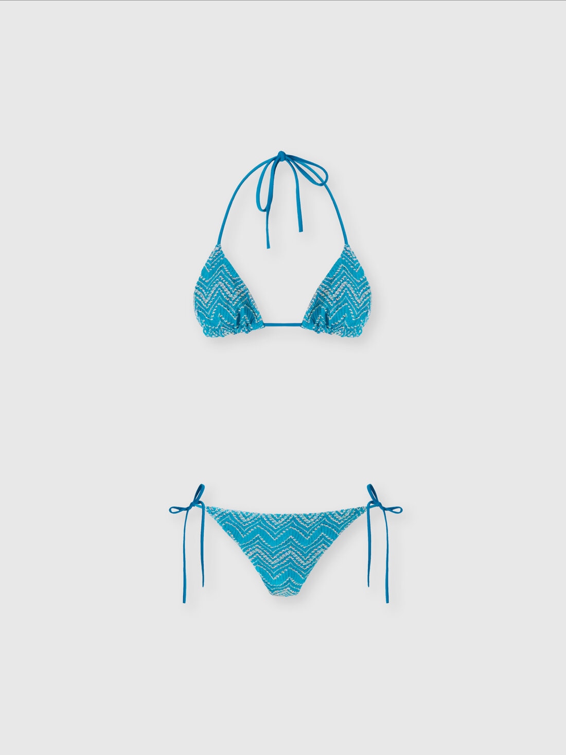 Straight from the maison's archive, the iconic chevron motif takes on new life in the viscose bikini by Missoni. The triangle bra and the briefs with side ties offer an adjustable fit, enhancing the silhouette with a refined sensuality. The addition of lamé yarn gives a touch of light and dynamism, for a bright and sophisticated look.