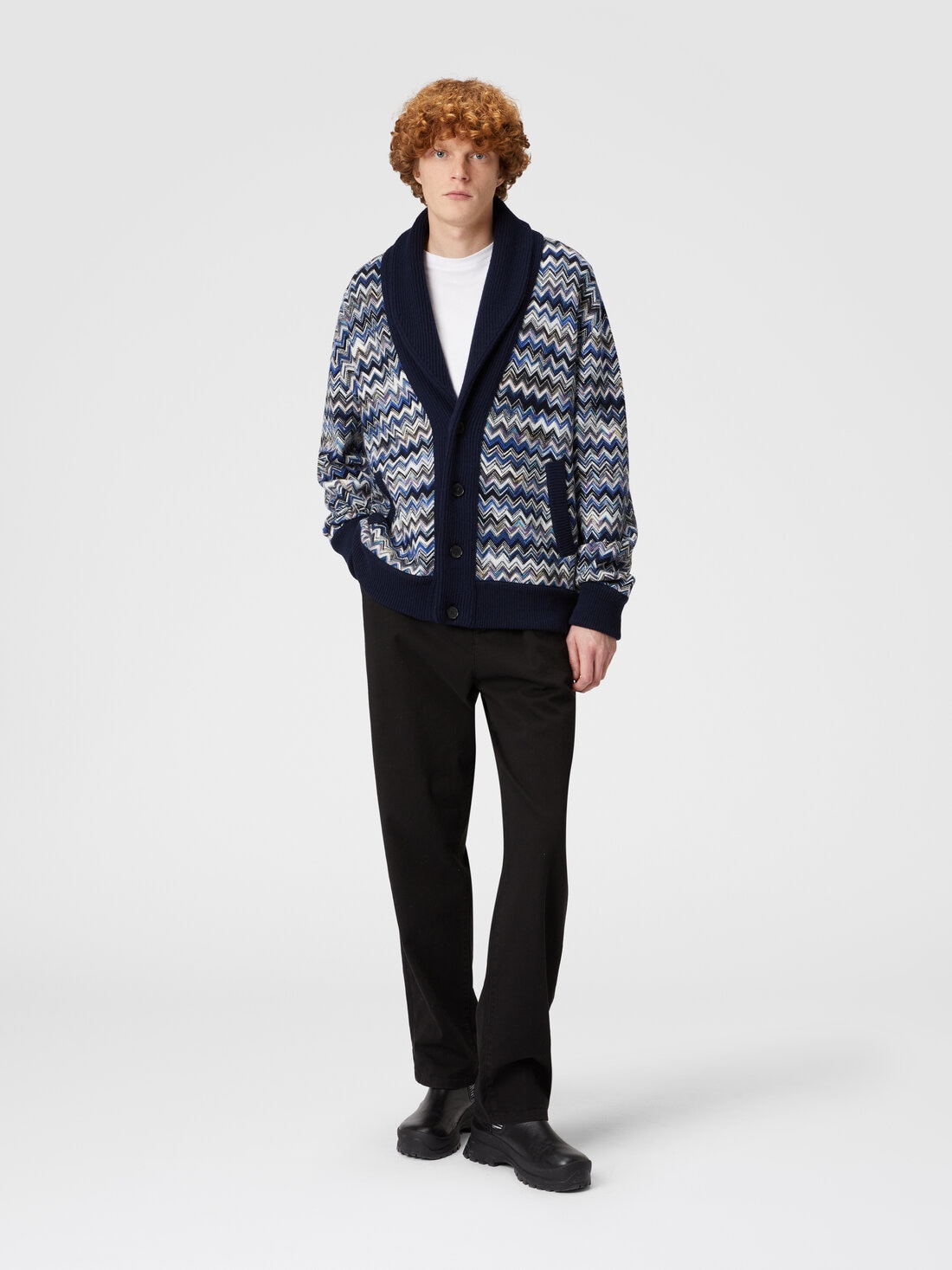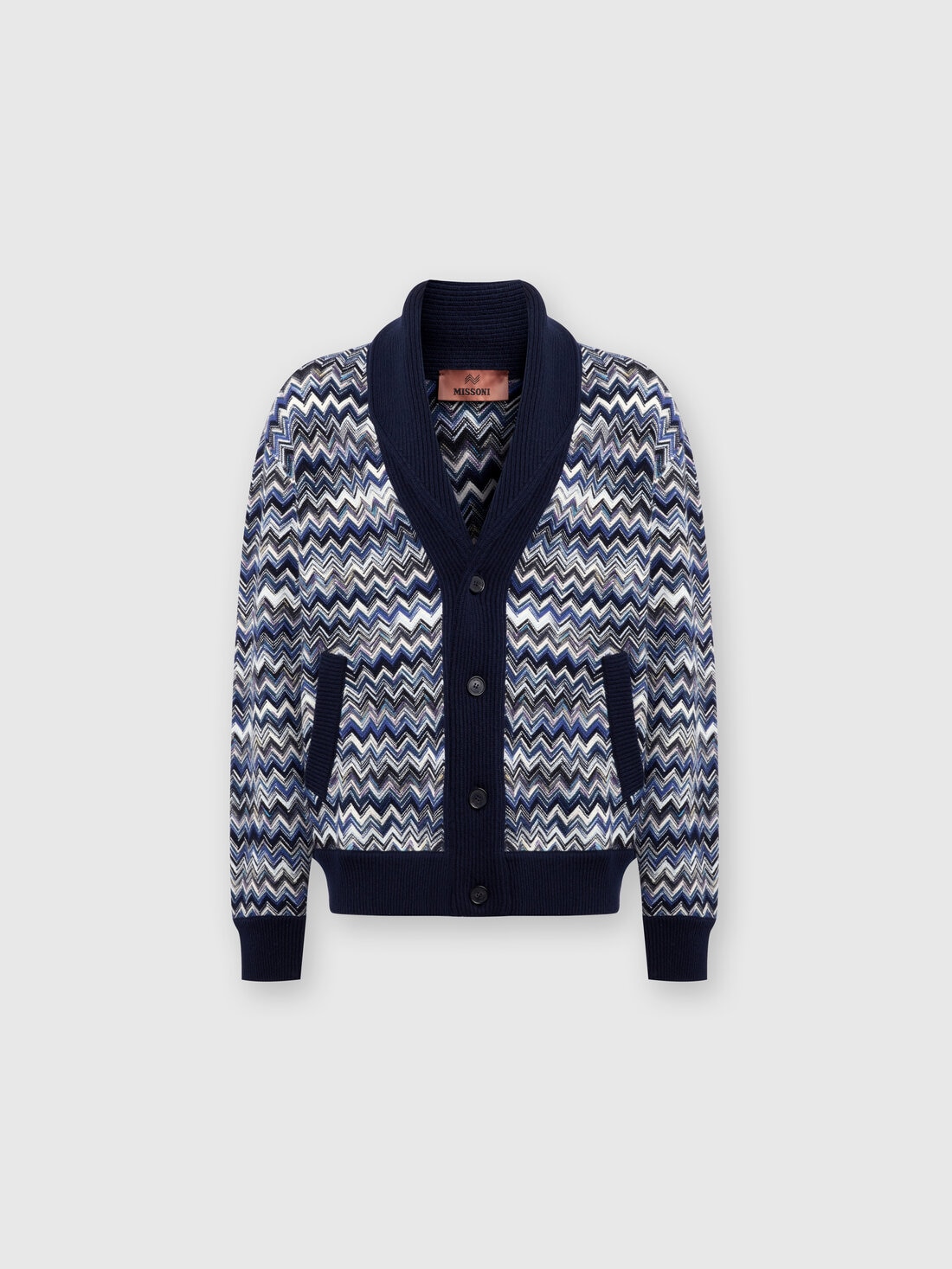 Shawl and enveloping collar for the cardigan with contrasting piping, personalized buttons and pockets. Made of pure wool knit spun on a loom, the garment is animated by the slub zigzag motif.