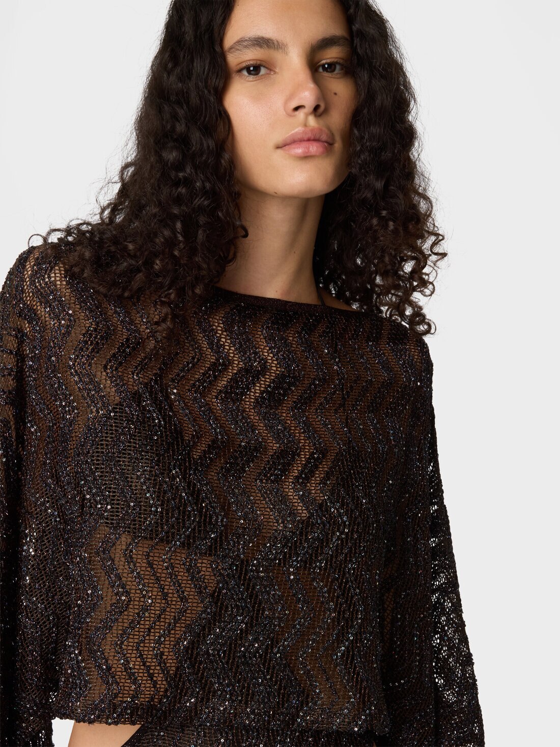 Transparencies and luminous details define this women’s mesh top with a zigzag motif and sequins, featuring wide sleeves and a play of reflections that enhances the lightness of the fabric.