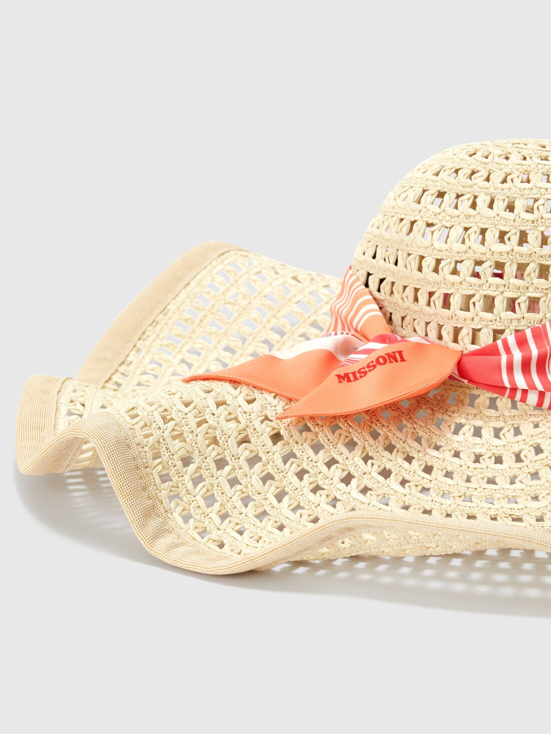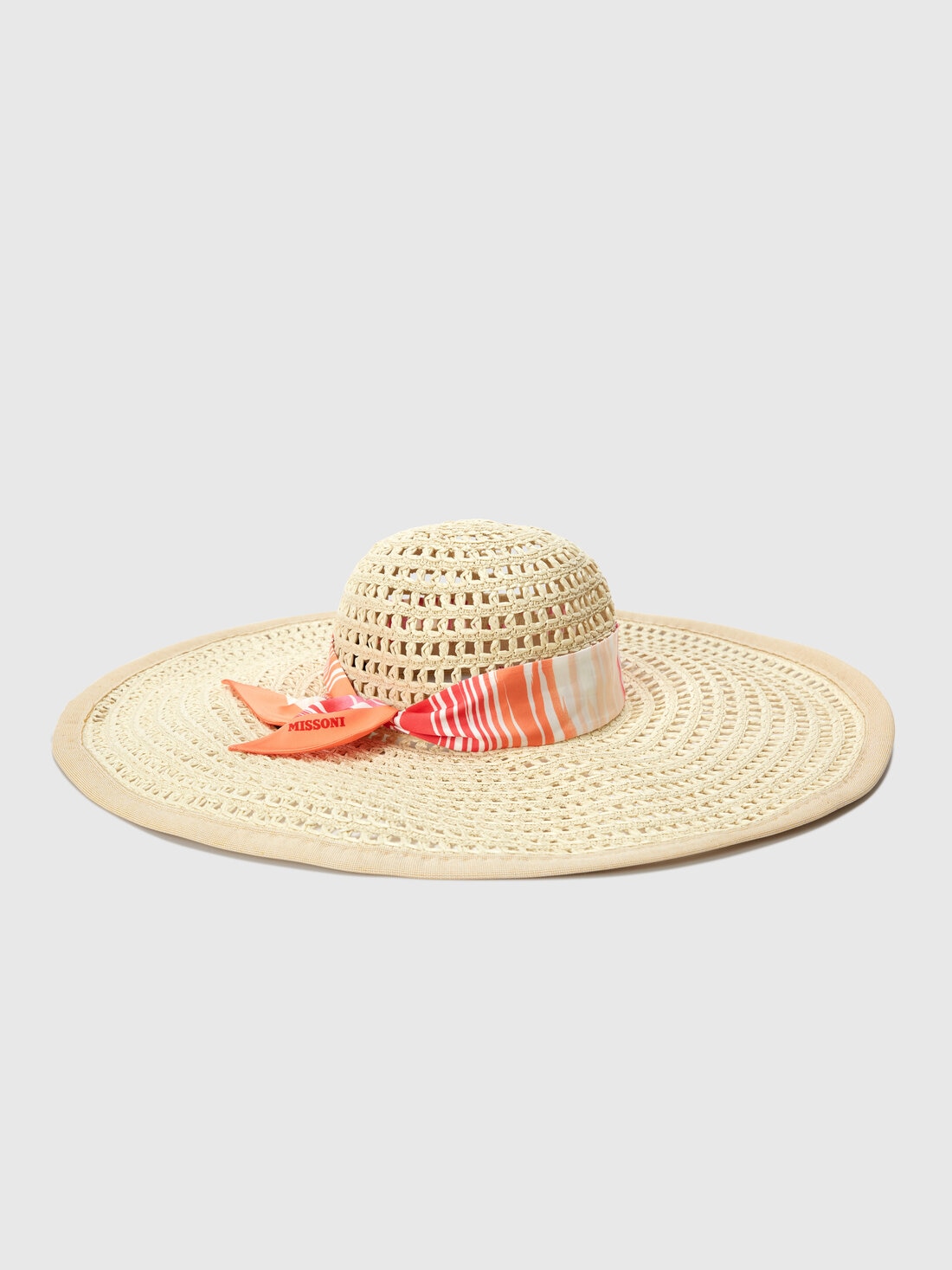The wide-brimmed hat with Missoni logo ribbon is an accessory that embodies the spirit of summer with elegance and style. Made of raffia, it offers optimal protection with a touch of sophistication and discreet luxury. Perfect for days at the beach or for an elegant walk in the city, the hat completes summer looks with class and personality.