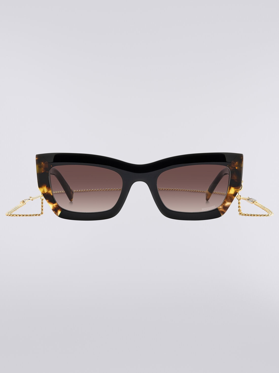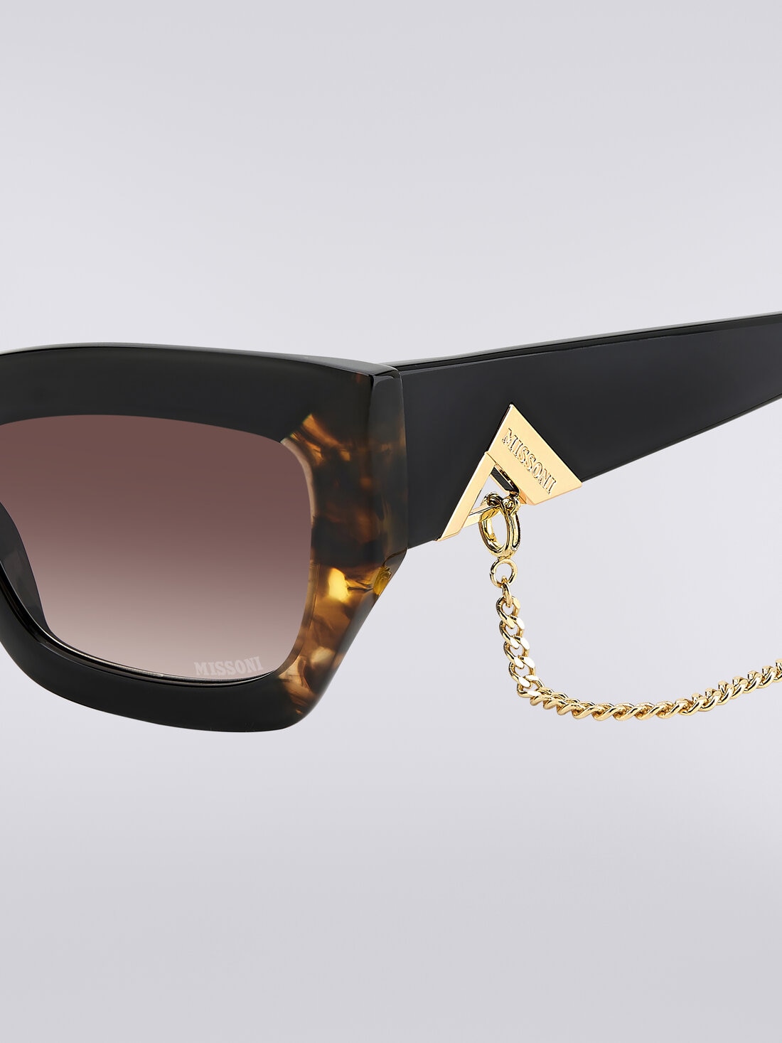The temples are personalized by the new iconic triangle-shaped metal trim with the deep lasered MISSONI logo bearing a branded metal chain, as well as by the acetate end-tip with iconic half Zig Zag shape.