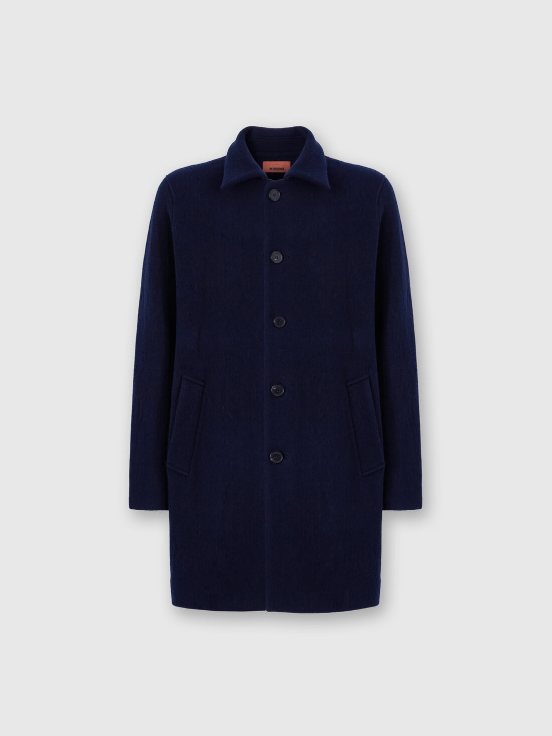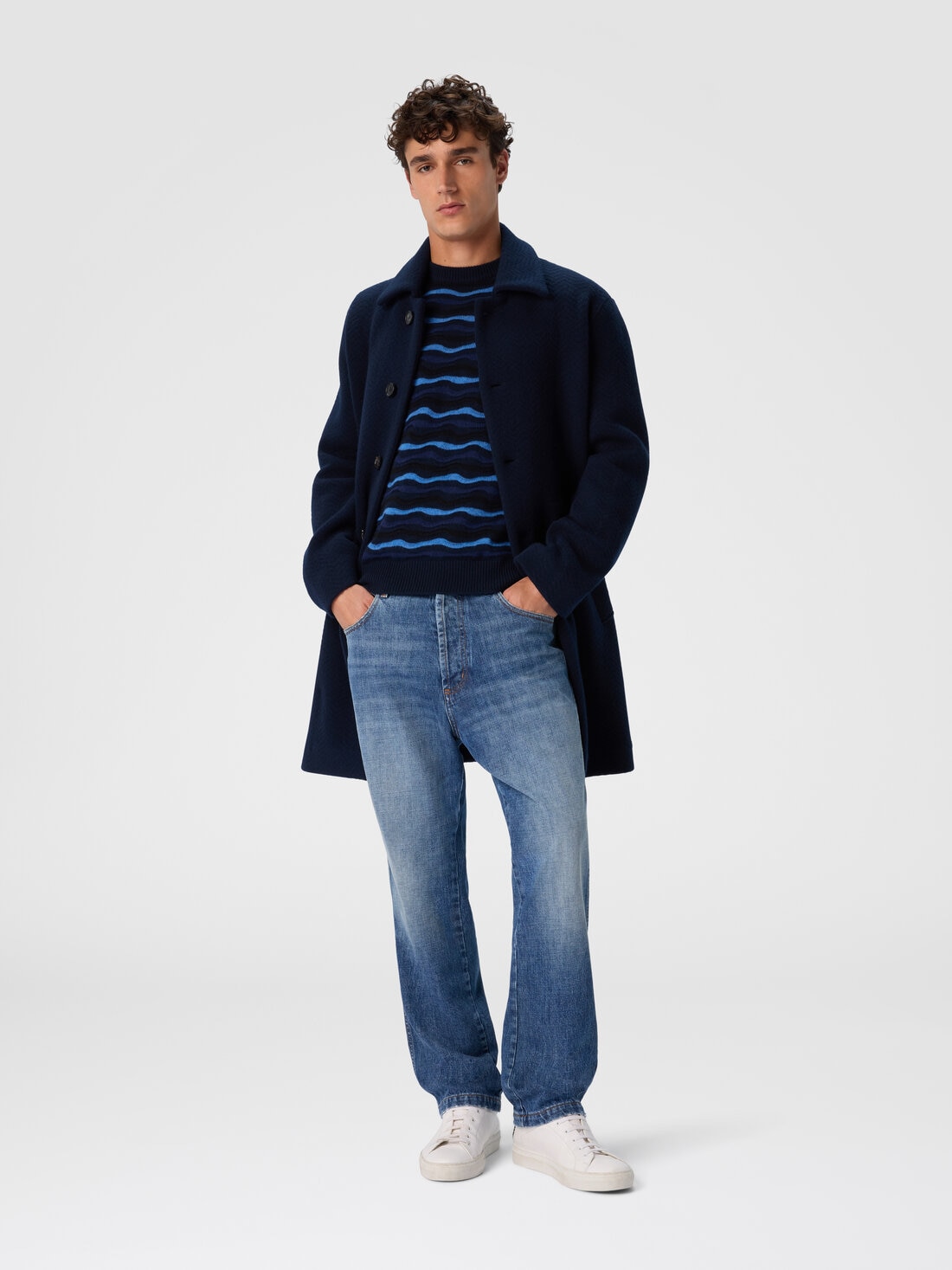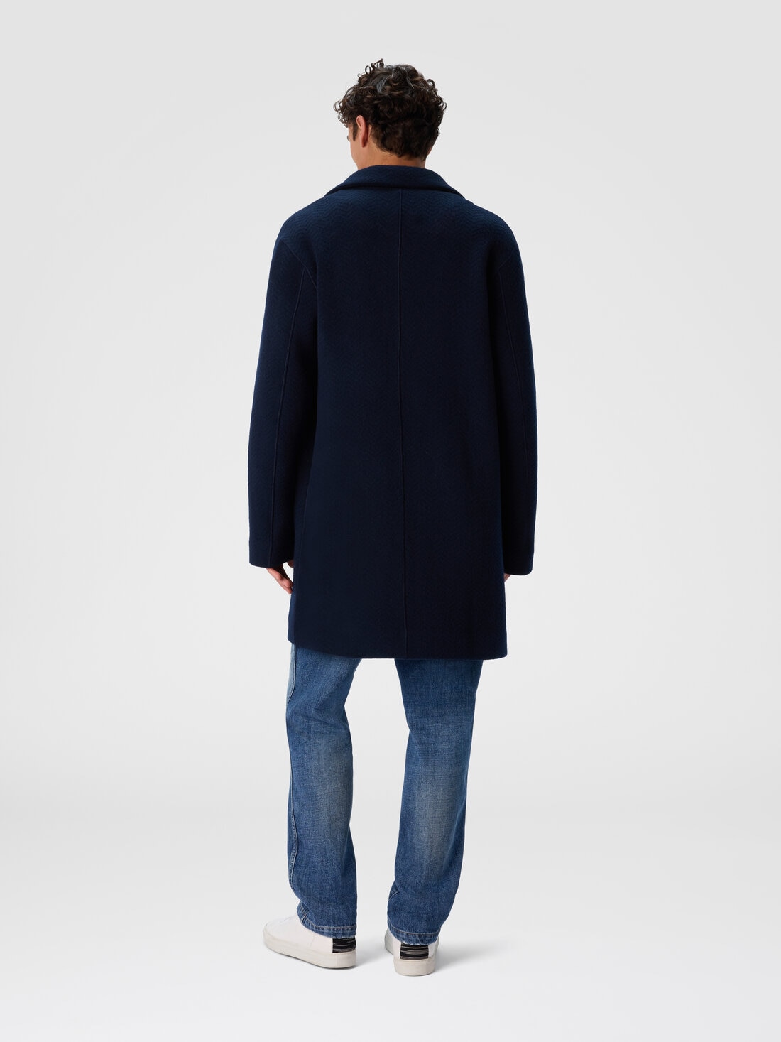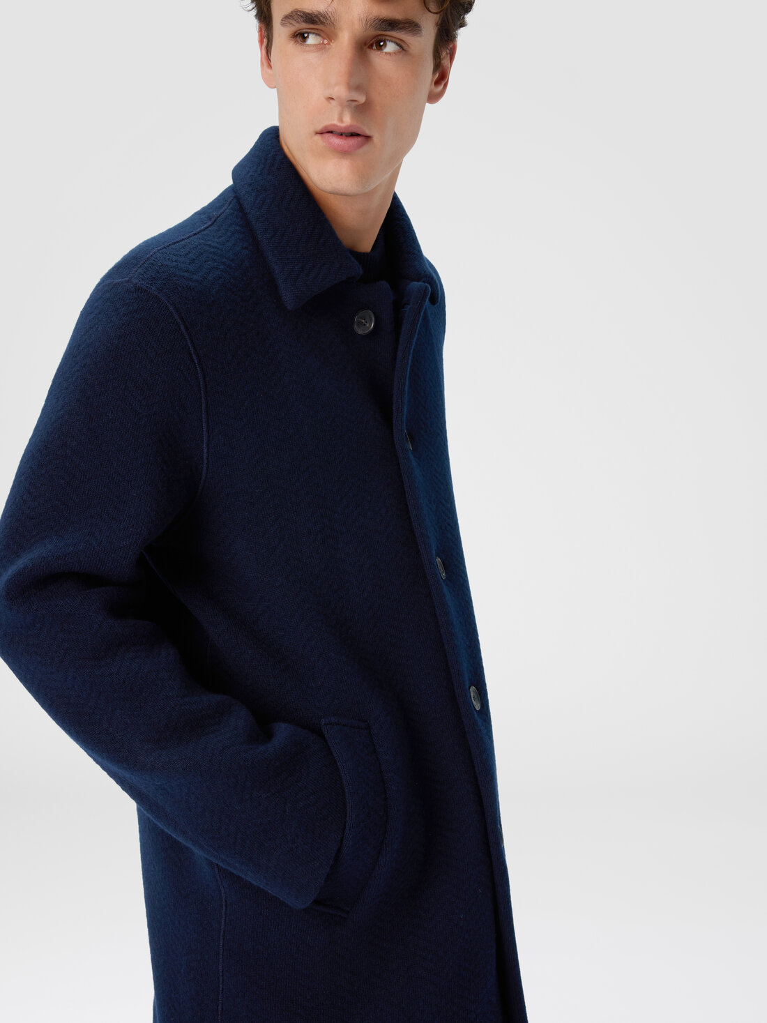 Abrigo en punto doble para hombre, confeccionado en una sofisticada mezcla de lana y viscosa, caracterizado por el motivo zig zag tono sobre tono. Su estructura envolvente y la confección cuidada confieren a la prenda un aire de elegancia refinada, perfecto para un look moderno y distintivo.