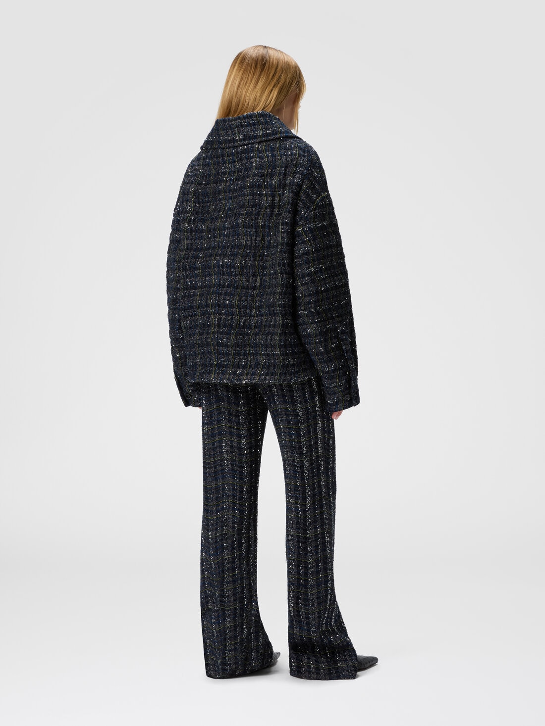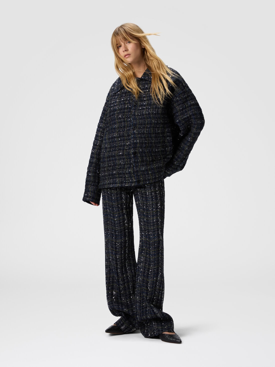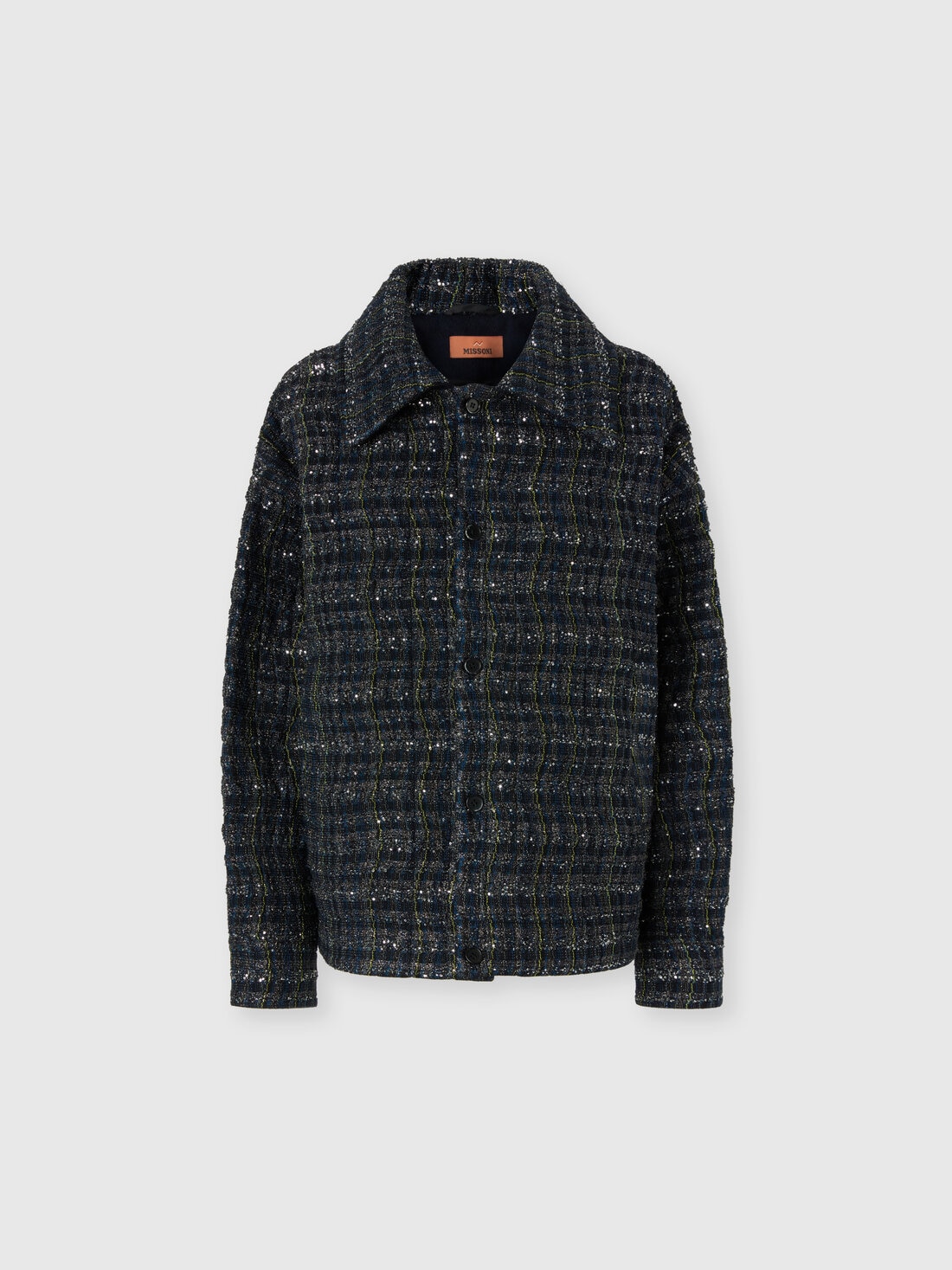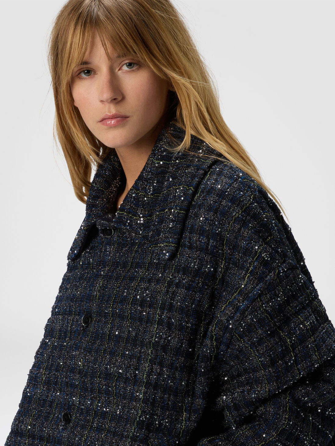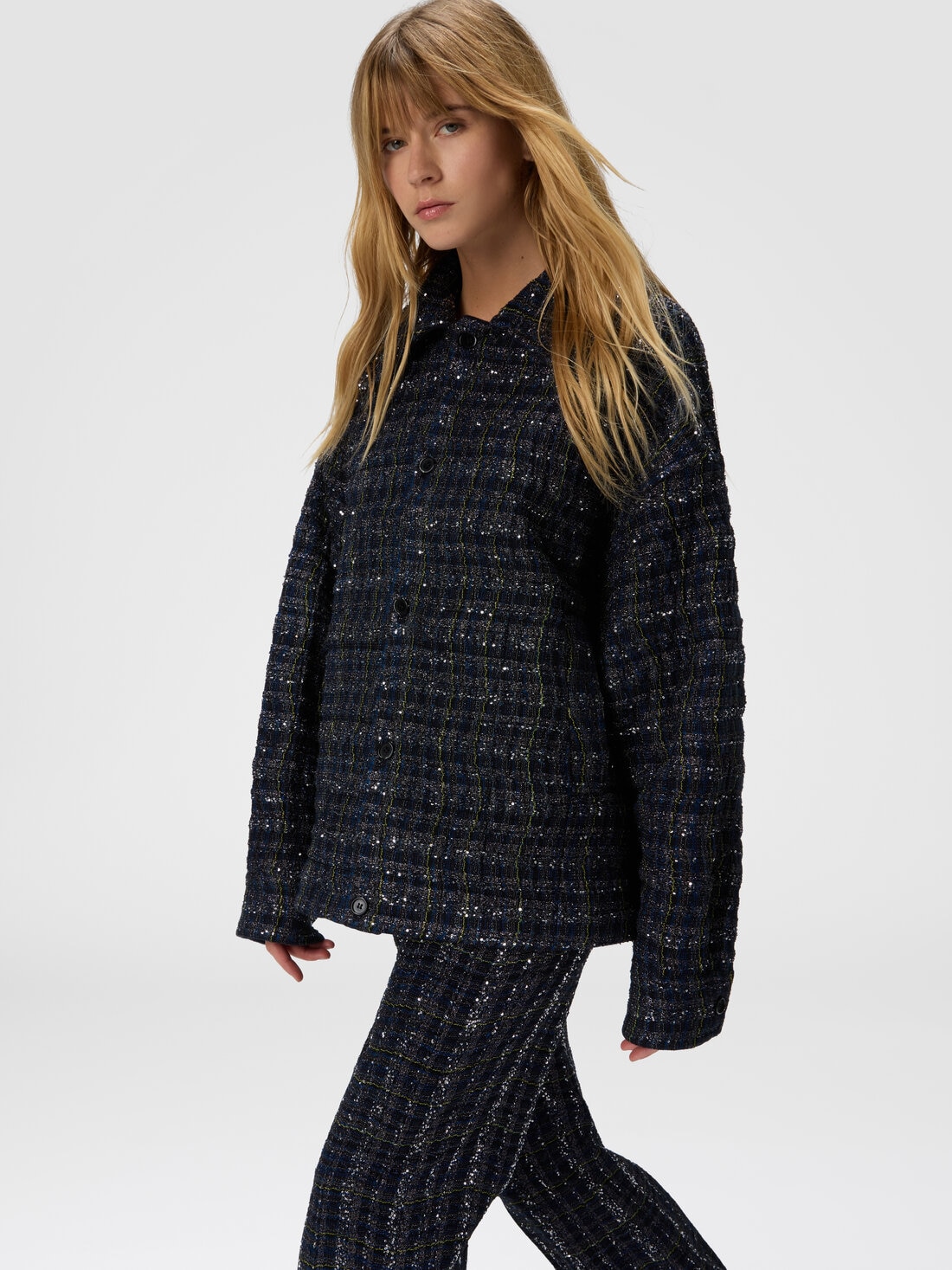 Esta overshirt para mujer está realizada con telar Caperdoni tejido, que realza un exclusivo patrón ondulado en cuadros, para un efecto visual dinámico y cuidado. El tejido en mezcla de viscosa está enriquecido con hilos de lúrex, que aportan reflejos luminosos y un toque sofisticado. El diseño combina espíritu contemporáneo y artesanía textil, convirtiendo esta overshirt en una elección perfecta para quien desea destacar con elegancia y personalidad.