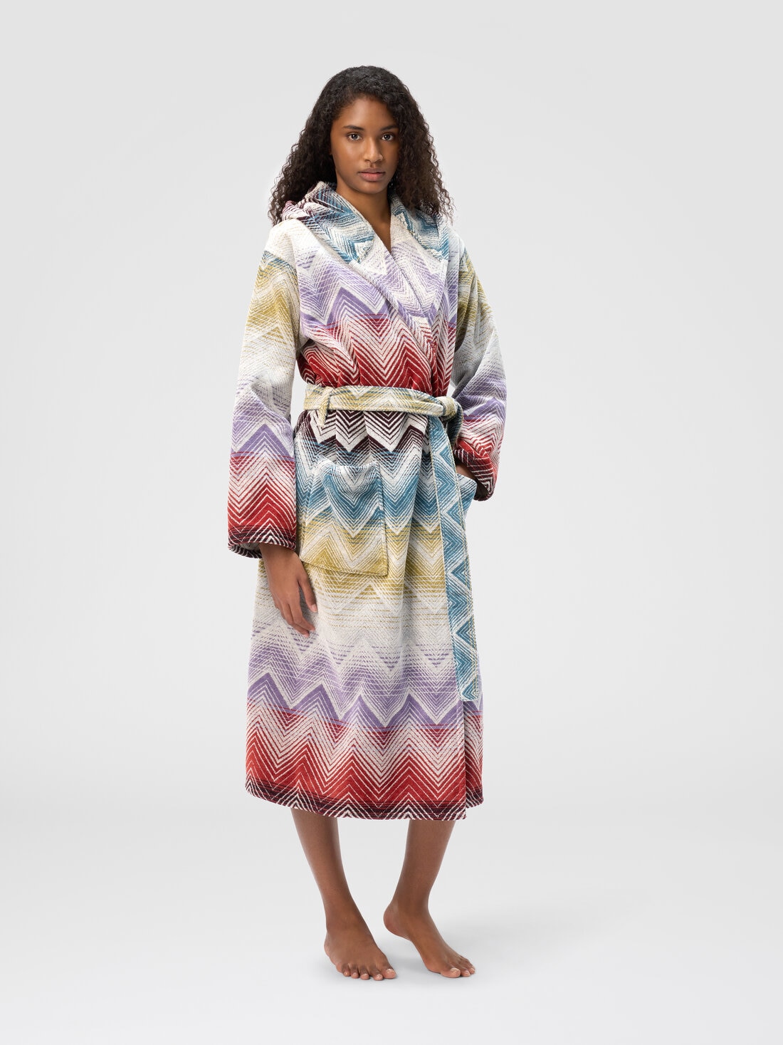 El albornoz con capucho Marea, con su eterno patrón chevron, representa la armonía perfecta entre elegancia y confort. La suavidad del rizo de algodón envuelve la piel en un cálido abrazo, lo que lo convierte en ideal para cualquier momento de relajación después de un largo día. Con su diseño refinado y funcional, este albornoz con cinturón ajustable en la cintura y bolsillos de parche, se distingue por la calidad de los materiales y el cuidado en los detalles, transformando cada instante en una experiencia de puro bienestar.