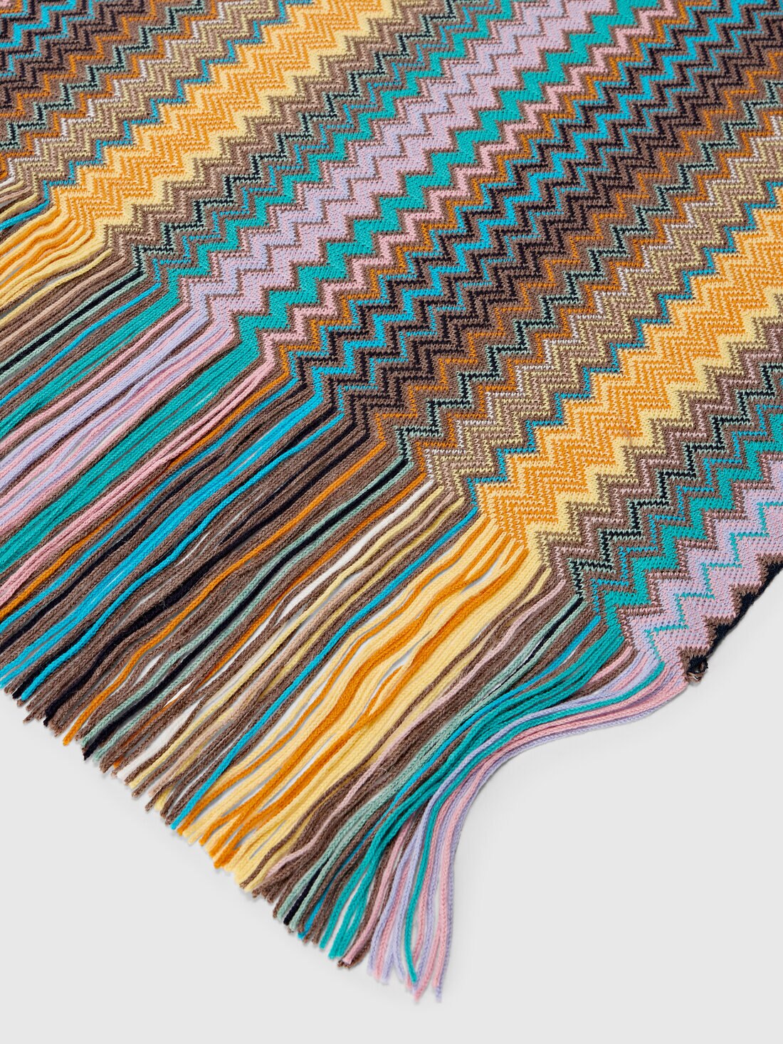 El característico tejido en zigzag de Missoni se combina con ligeros flecos en esta bufanda para mujer, capaz de aportar movimiento y estilo a cualquier conjunto. Un accesorio refinado, perfecto para completar con elegancia cualquier look.