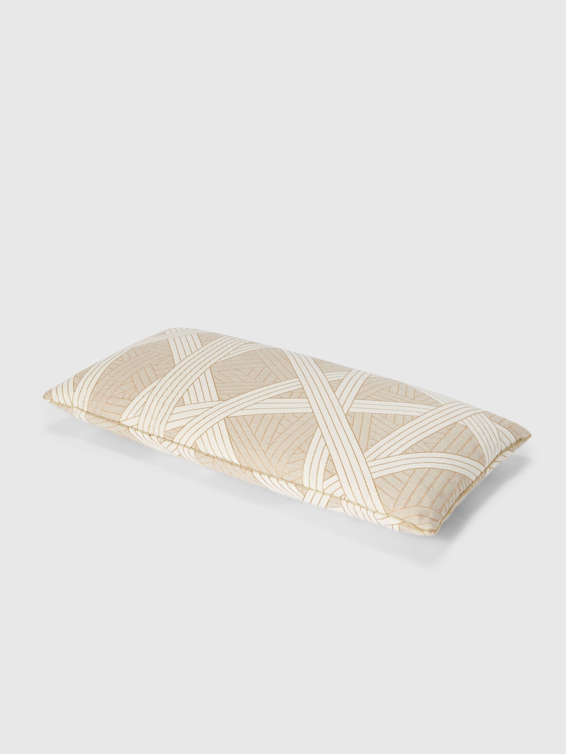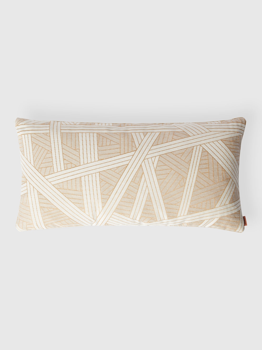 El cojín Nastri, de 30x60 cm, presenta una elegante confección con costuras y finos detalles como el ribete dorado. El motivo Nastri se introduce en la amplia gama de estampados icónicos de MissoniHome, ofreciendo un excelente ejemplo de maestría textil que aporta un toque de lujo y estilo a cualquier ambiente.