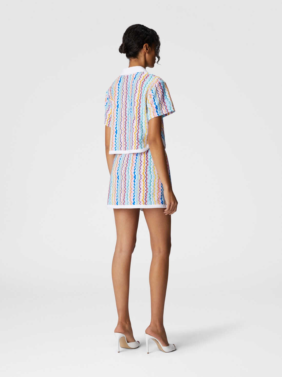 Una original minifalda envolvente con cierre de botón y bordes en contraste, decorada con el icónico motivo zig zag que ha hecho famosa a la casa Missoni. Realizada en jersey de toalla estampado, combina ligereza y estilo en una sola prenda.