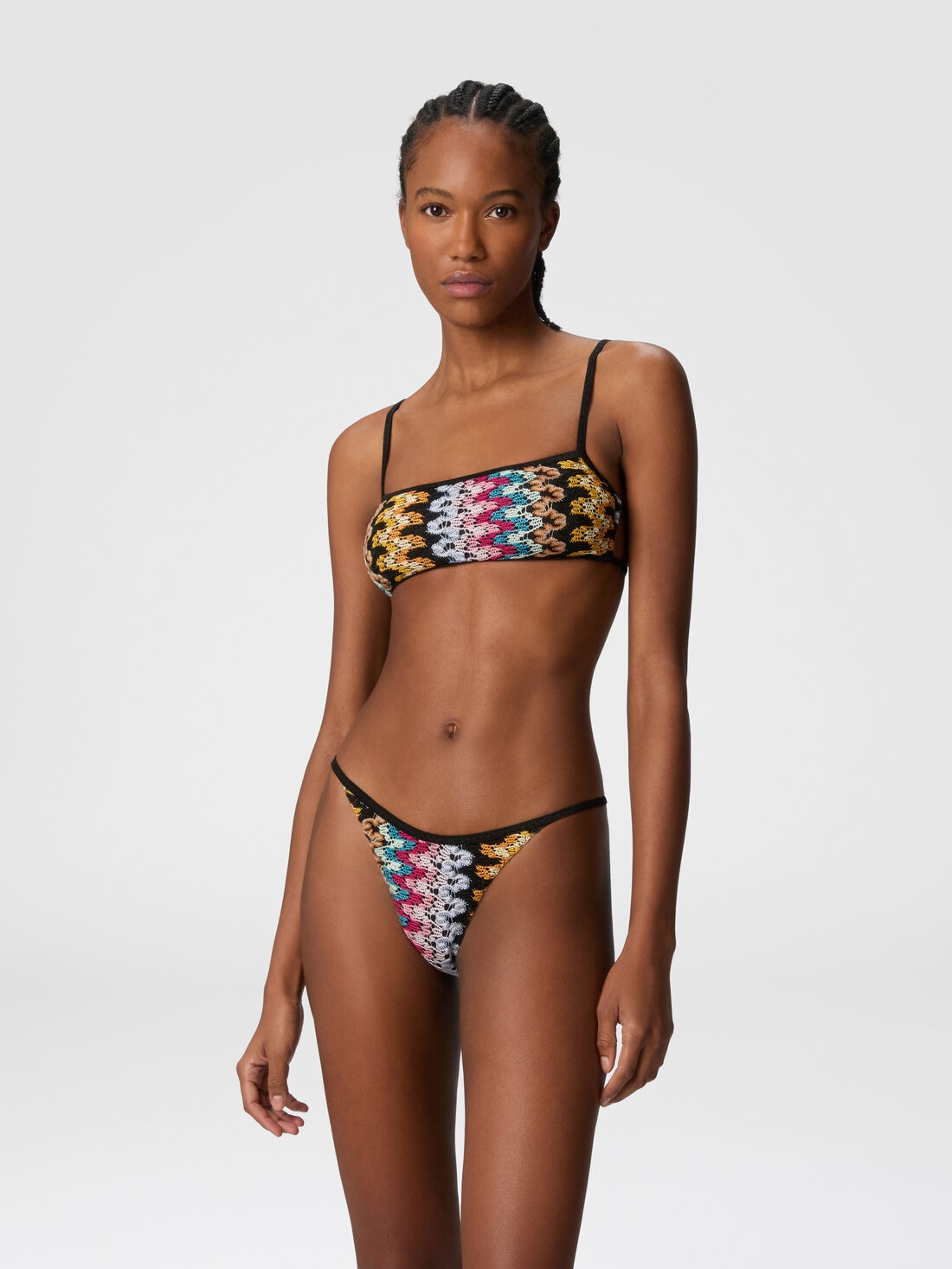 Este bikini bandeau está confeccionado en encaje de viscosa lamé, adornado con tirantes con ganchos joya. La elaboración del raschel aporta textura y profundidad, mientras que el encaje crea un sofisticado juego de luces que captura la vibrante esencia del lamé. Un calzoncillo a juego completa este traje de baño de dos piezas, añadiendo un toque de elegancia atemporal.