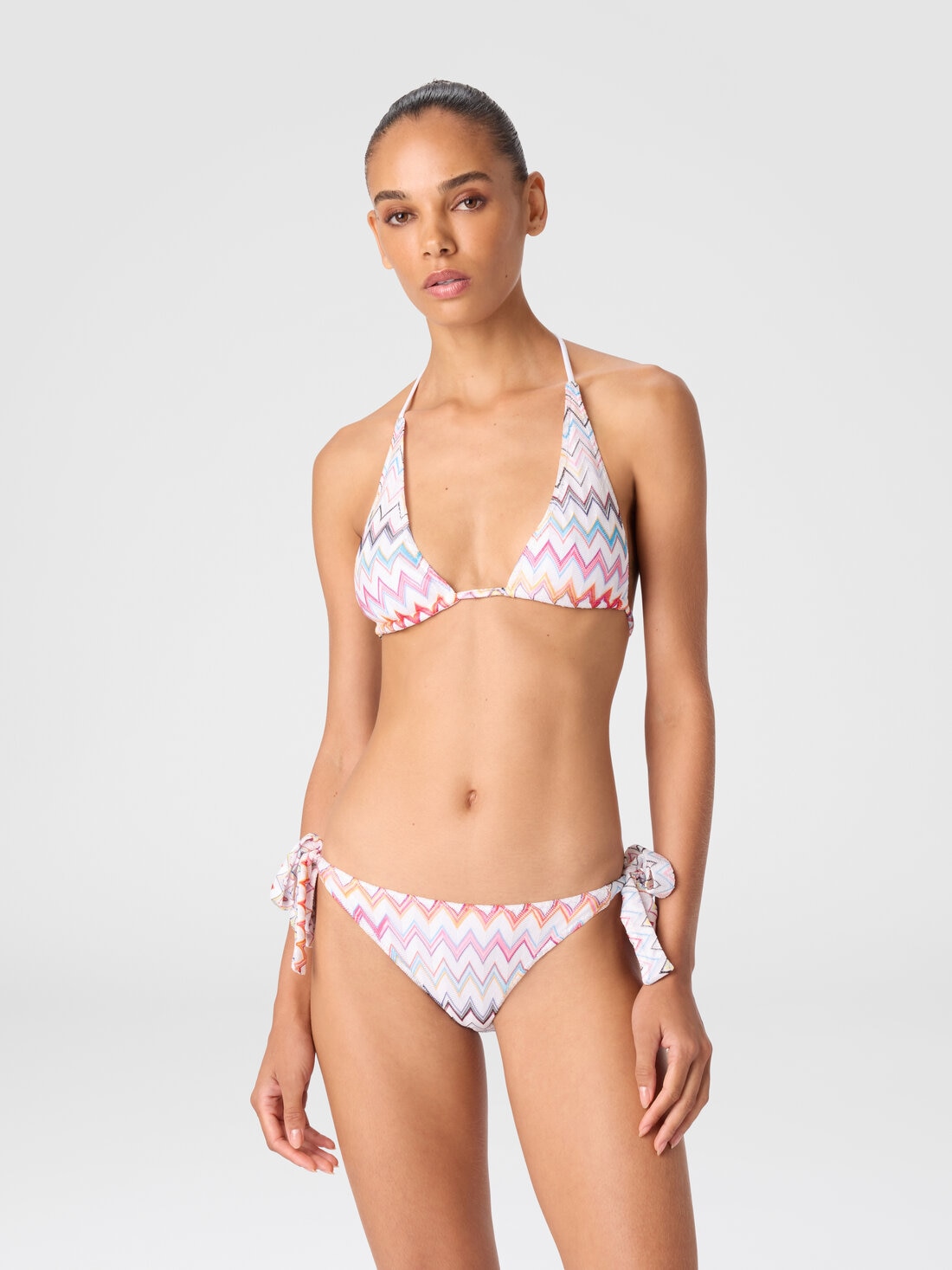 Elegancia personalizable: el bikini con atadura detrás del cuello resalta el motivo zig zag de Missoni, mientras que los lazos ajustables del slip añaden un toque de practicidad sastrería, ideal para cualquier necesidad.