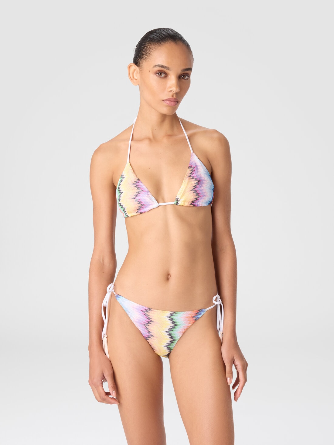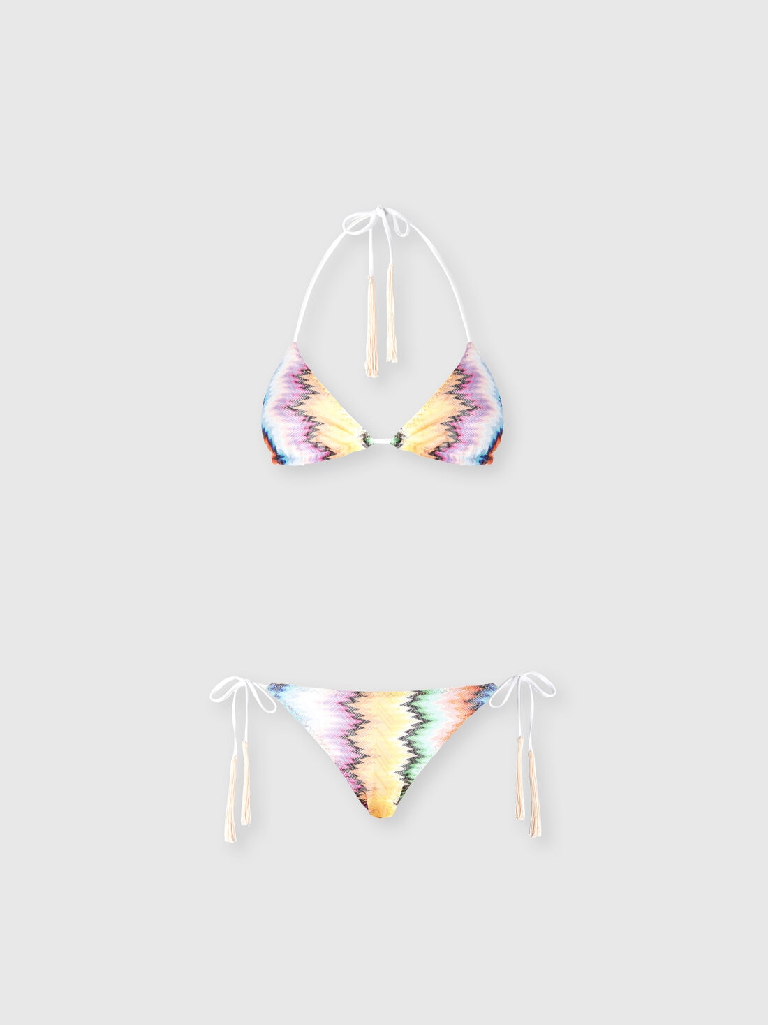 Con un diseño gráfico y decidido, este bikini triangular para mujer con borlas está realizado con elaboración raschel y presenta un estampado de rayas micro y macro degradadas sobre fondo zig zag, código estilístico icónico de Missoni. Una prenda llena de personalidad, pensada para quien desea un look distintivo y vibrante.