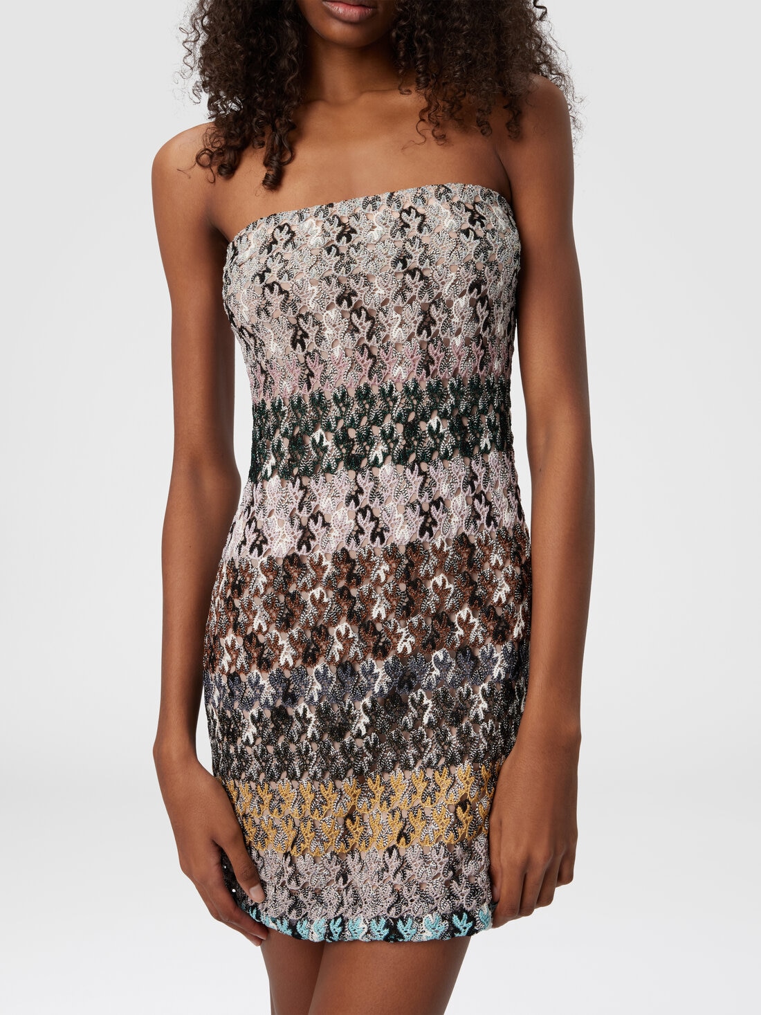 Este minivestido encarna una feminidad moderna y luminosa. Confeccionado en encaje trabajado a rayas con valioso tejido raschel, está enriquecido con hilos lamé que iluminan el tejido con reflejos tornasolados. El diseño gráfico y el cuidado por los detalles exaltan la sofisticación de la prenda, que fusiona con naturalidad artesanía y estilo contemporáneo.