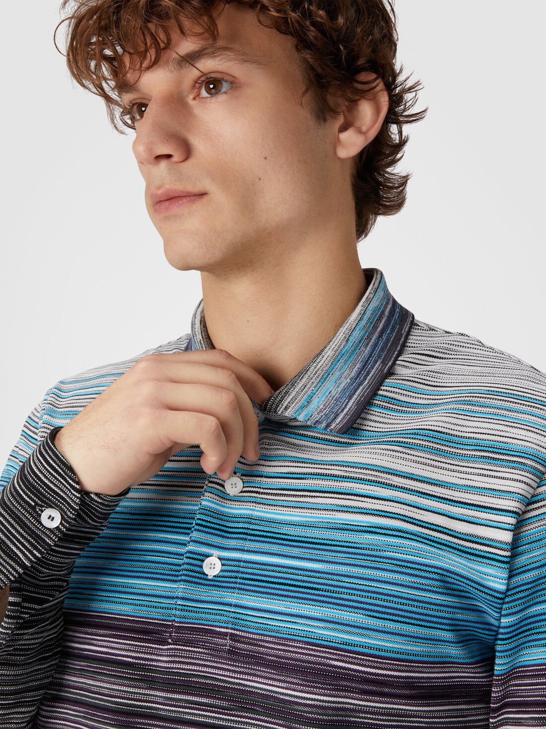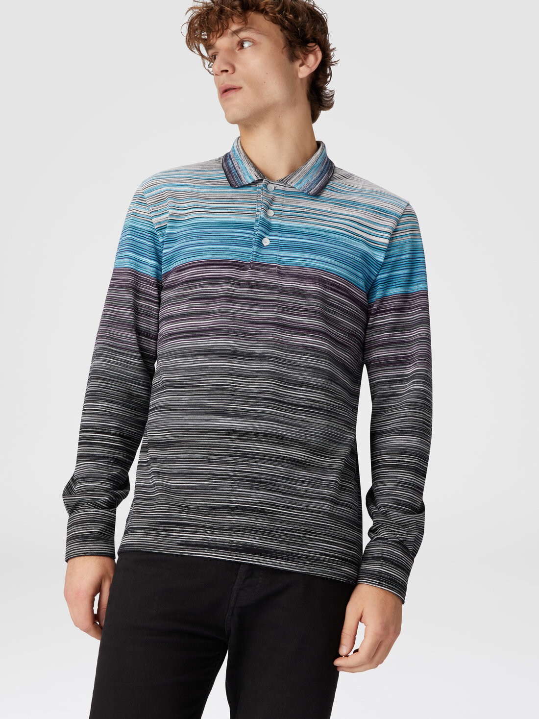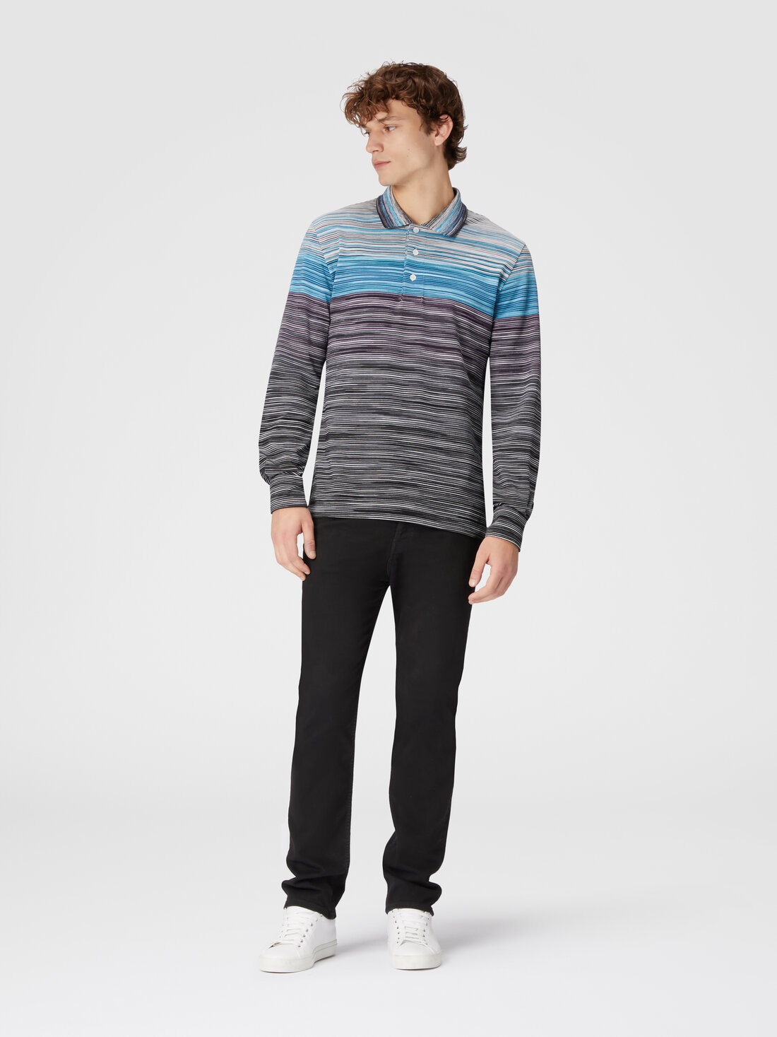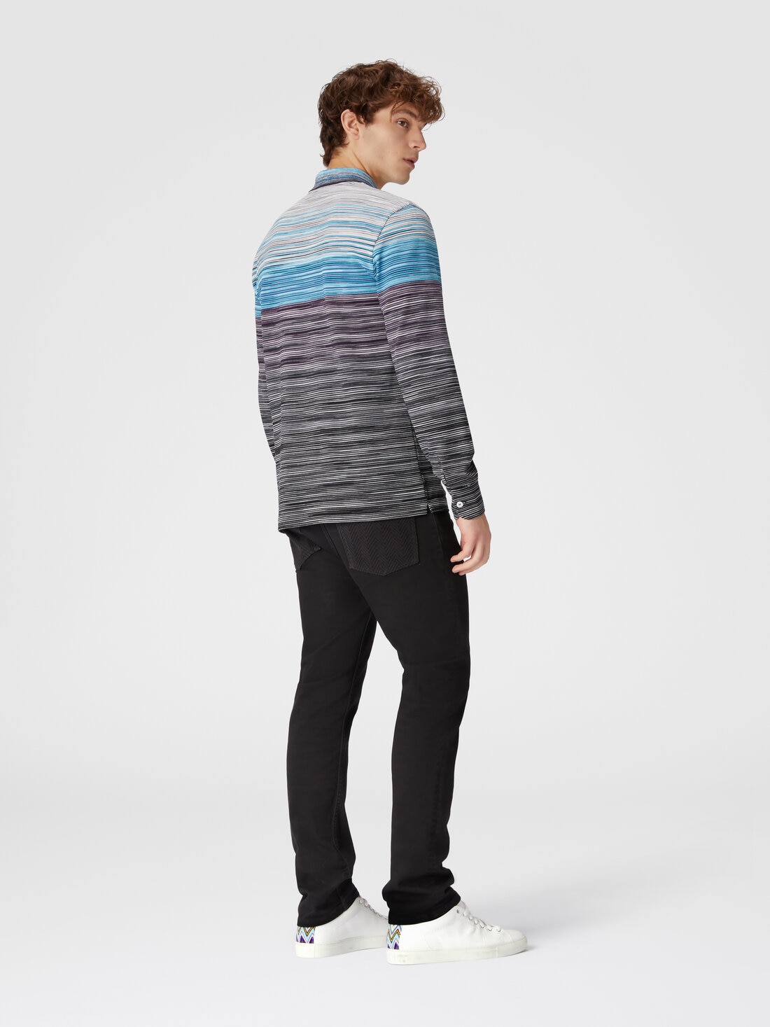 El peso del material del piqué confiere a este polo de algodón de manga larga una estructura perfecta para soportar todo el peso de un ADN importante: el de Missoni, perfectamente representado por el estampado flameado que enriquece esta piedra angular del estilo casual.
