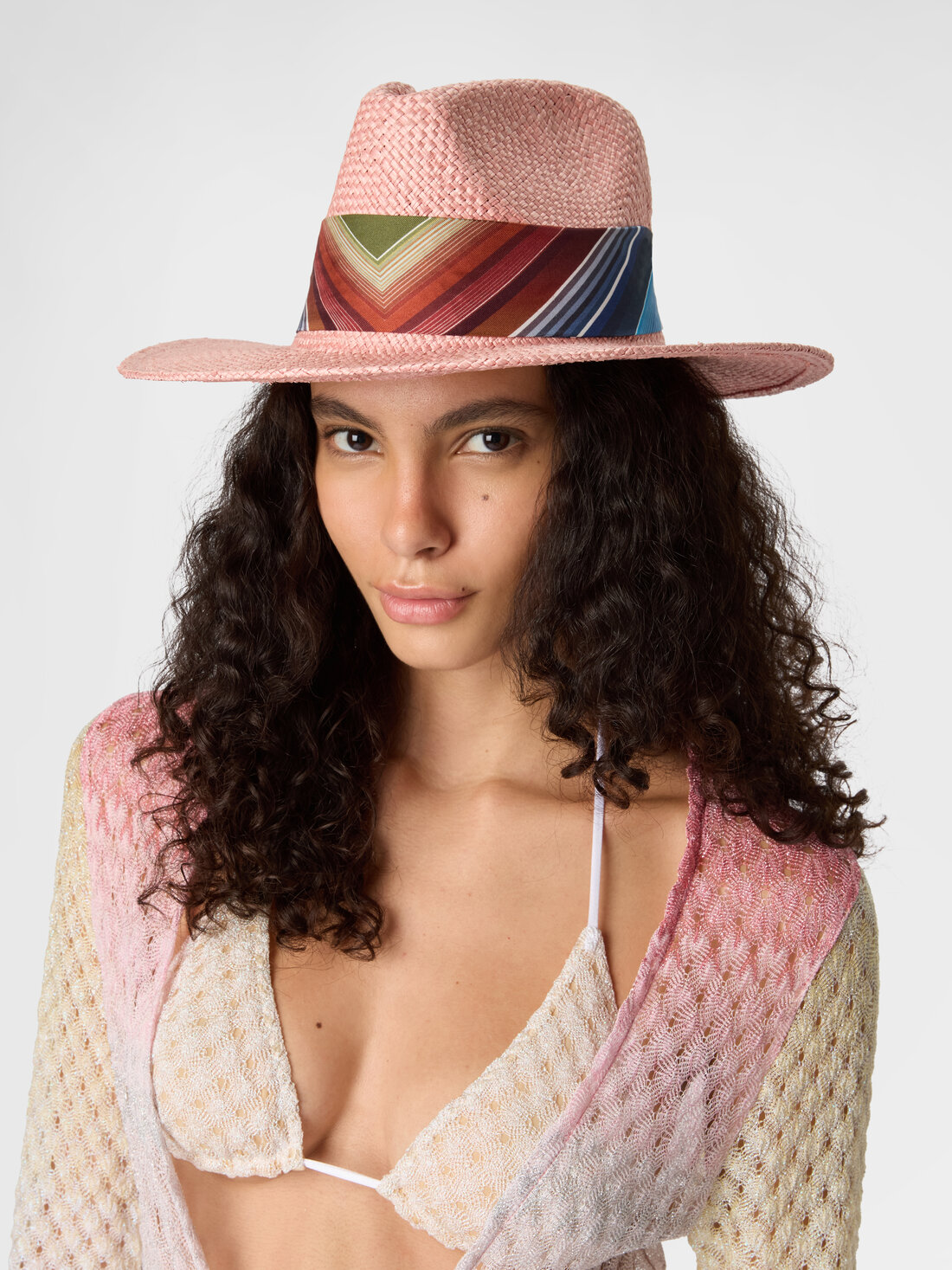 Elegante y desenfadado, este sombrero de paja para mujer con ala ancha está adornado con una cinta de pura seda con el motivo en zigzag y el logotipo de la maison. Un accesorio perfecto para completar con estilo los looks veraniegos.